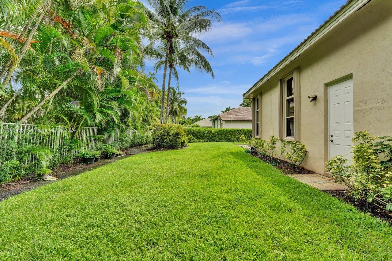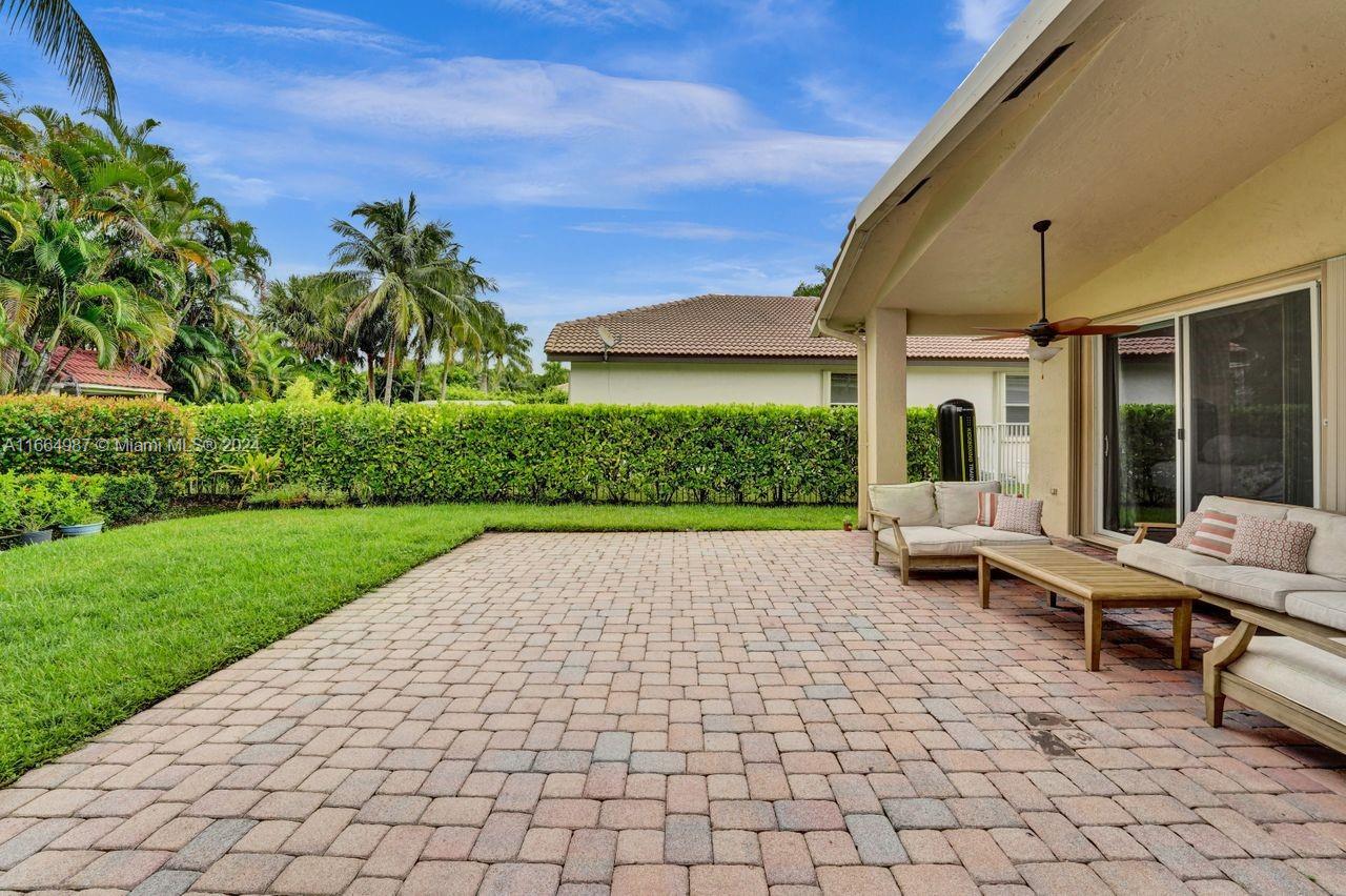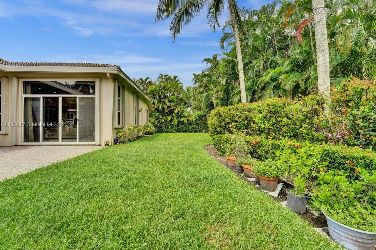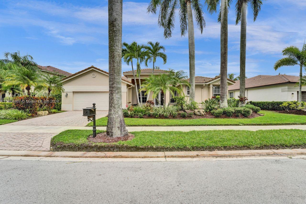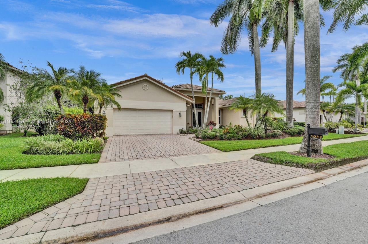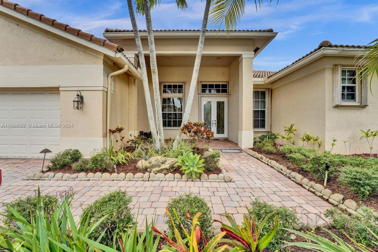 This beautiful house in Weston Hills Country Club features five bedrooms and three bathrooms in a split floor plan. The home boasts a spacious oversized lot with lush landscaping, creating an inviting entryway. The primary bedroom is generously sized with vaulted ceilings and hardwood flooring that accentuates the abundant natural light throughout the interior. The elegant decor and spacious layout provide a welcoming ambiance, with ample countertops and cabinetry in the kitchen, which is equipped with stainless steel and modern appliances, offering ample storage. Elegant architectural details and a covered patio lead to a spacious outdoor living area with a brick-paved patio, lush tropical landscaping, and a nice spacious yard.
