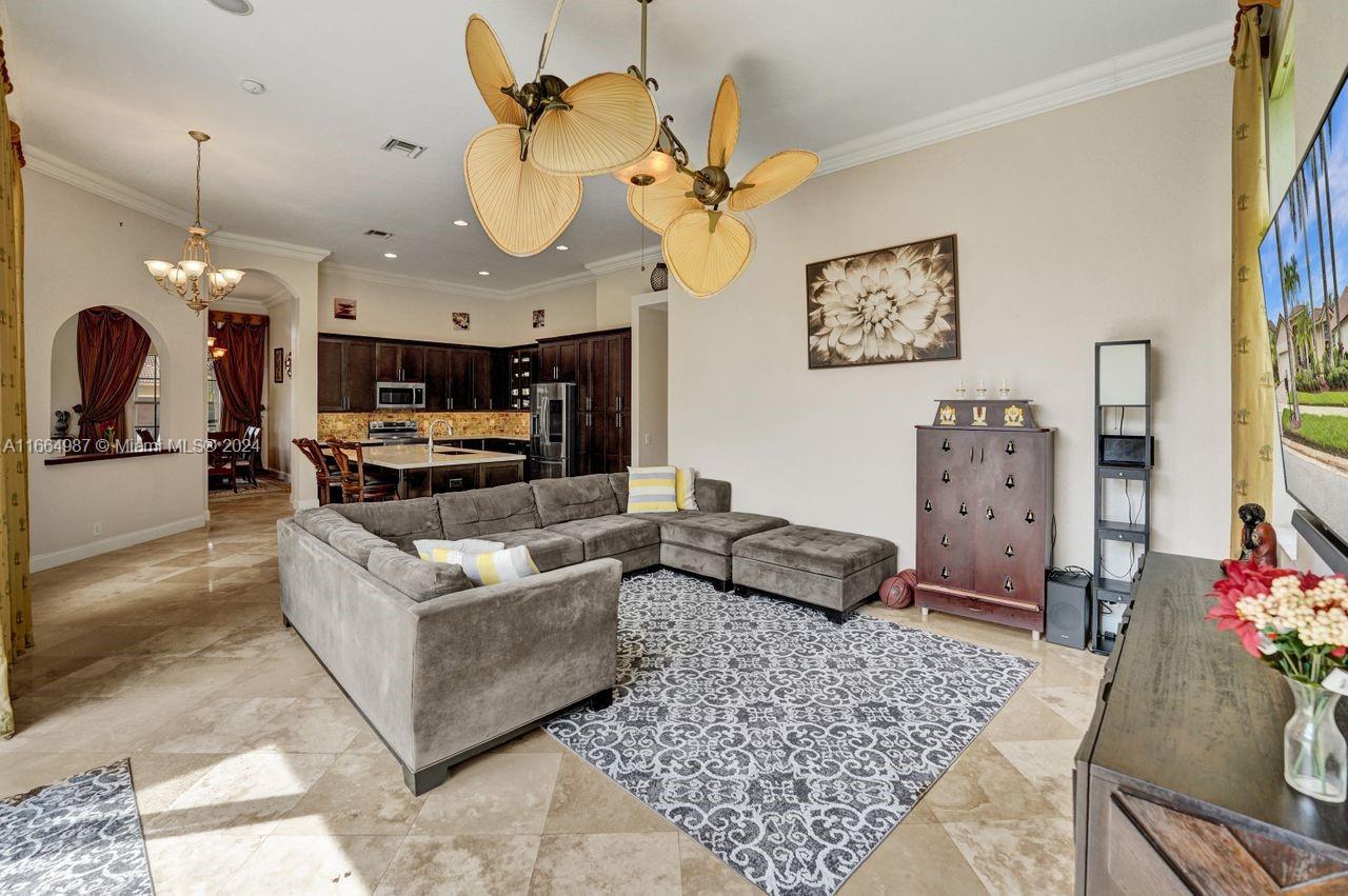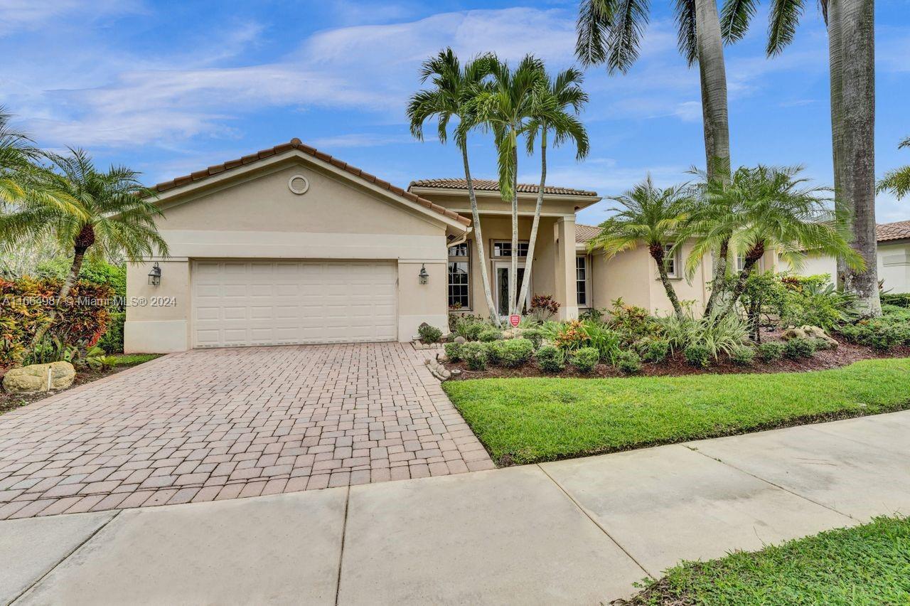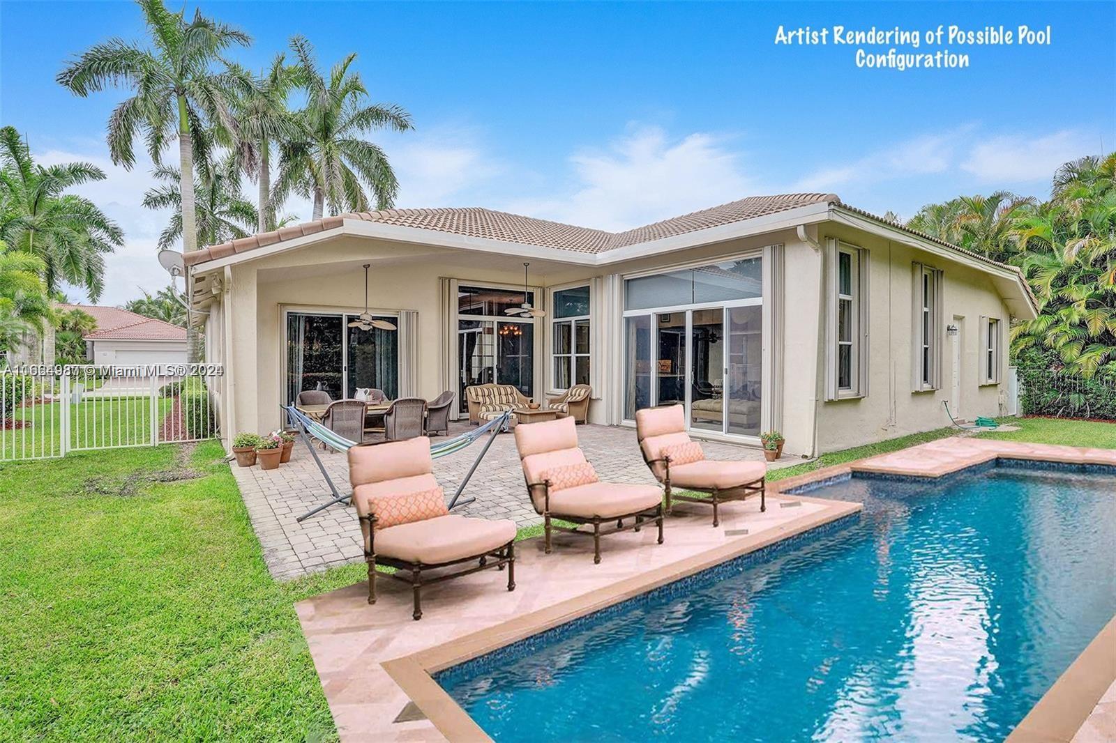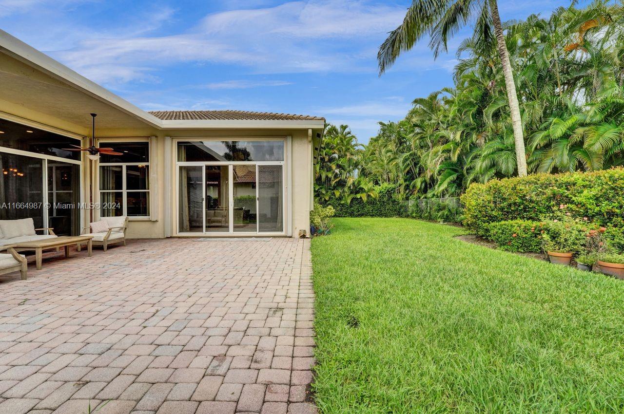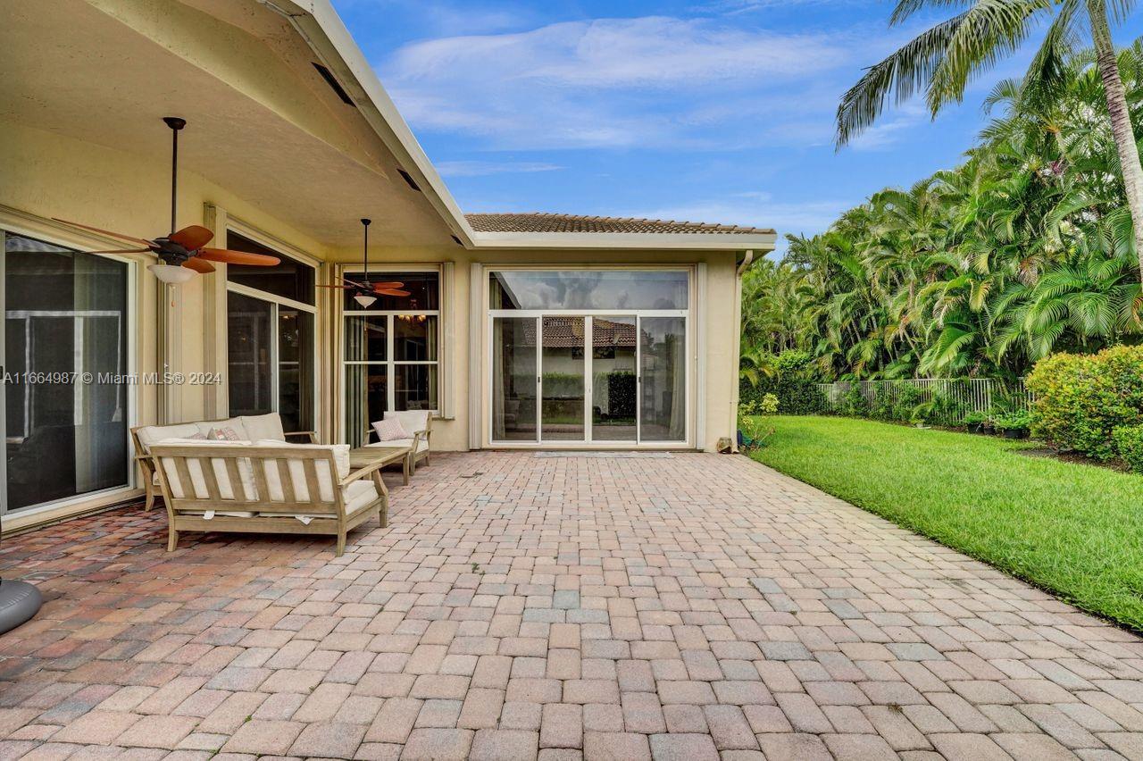 This beautiful house in Weston Hills Country Club features five bedrooms and three bathrooms in a split floor plan. The home boasts a spacious oversized lot with lush landscaping, creating an inviting entryway. The primary bedroom is generously sized with vaulted ceilings and hardwood flooring that accentuates the abundant natural light throughout the interior. The elegant decor and spacious layout provide a welcoming ambiance, with ample countertops and cabinetry in the kitchen, which is equipped with stainless steel and modern appliances, offering ample storage. Elegant architectural details and a covered patio lead to a spacious outdoor living area with a brick-paved patio, lush tropical landscaping, and a nice spacious yard.