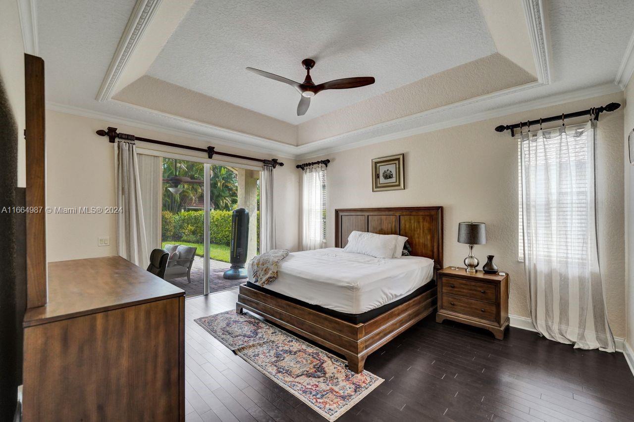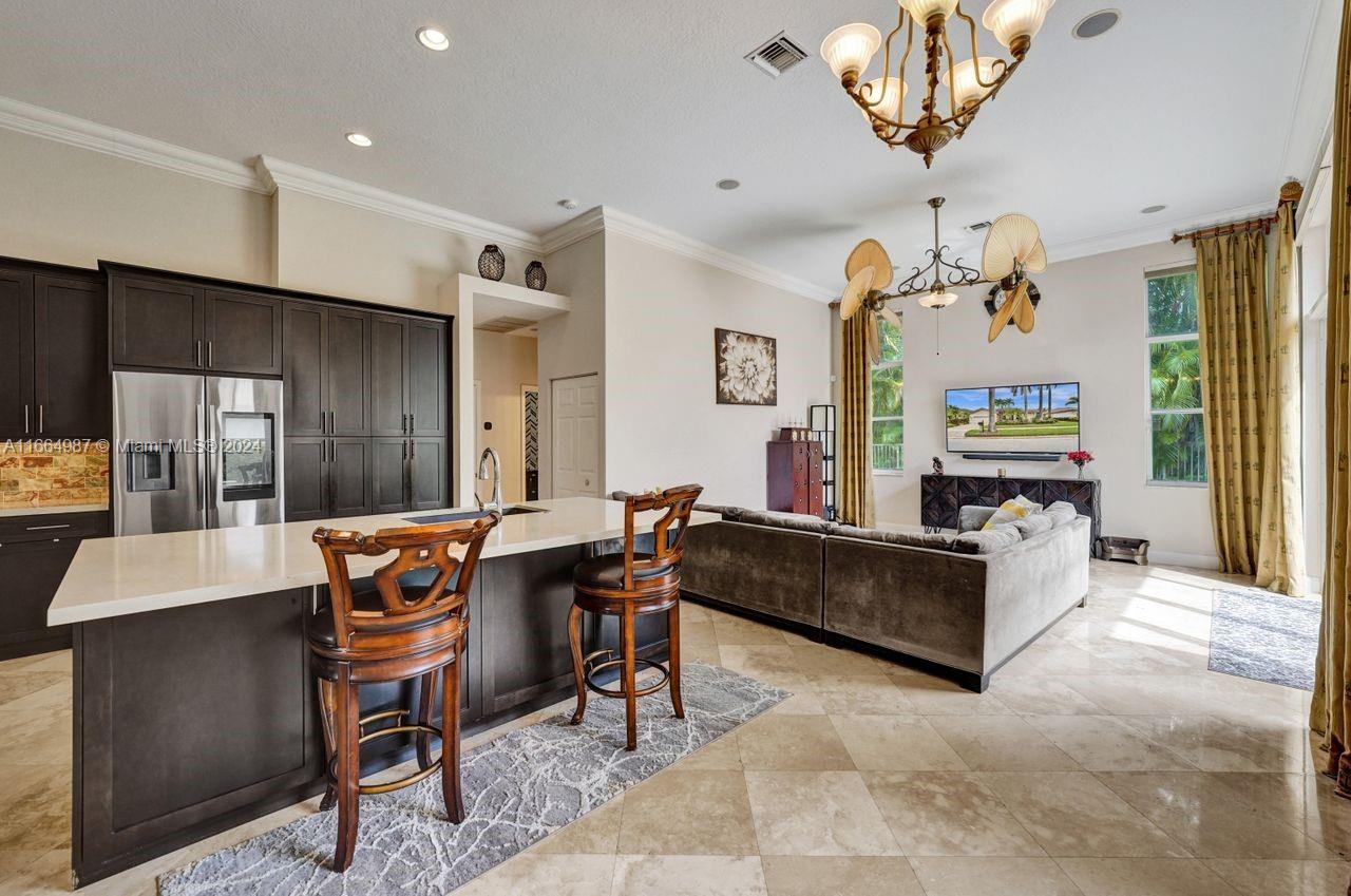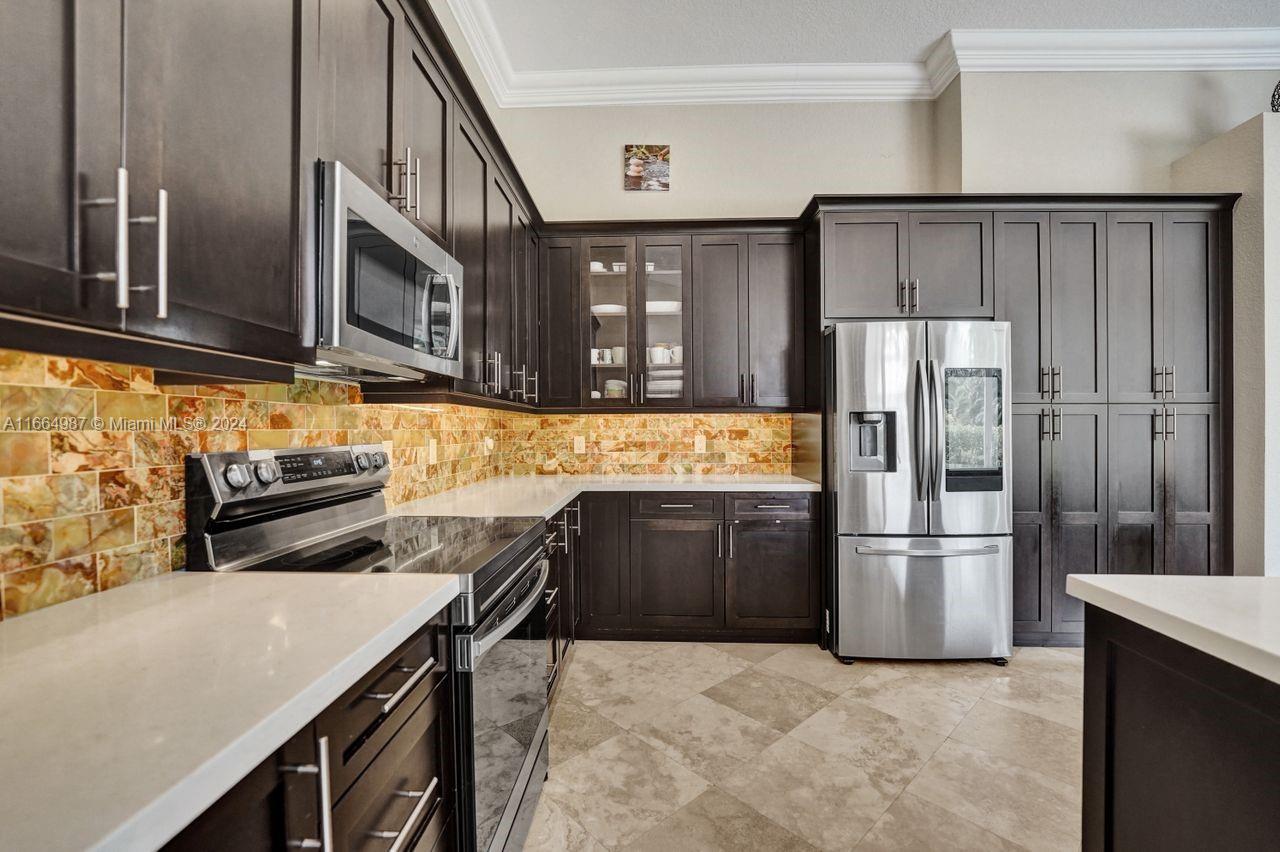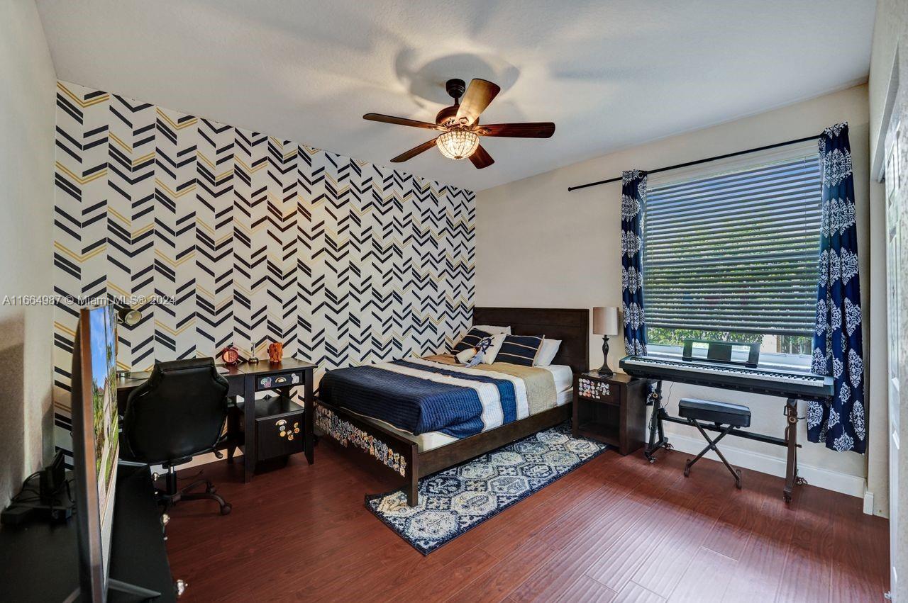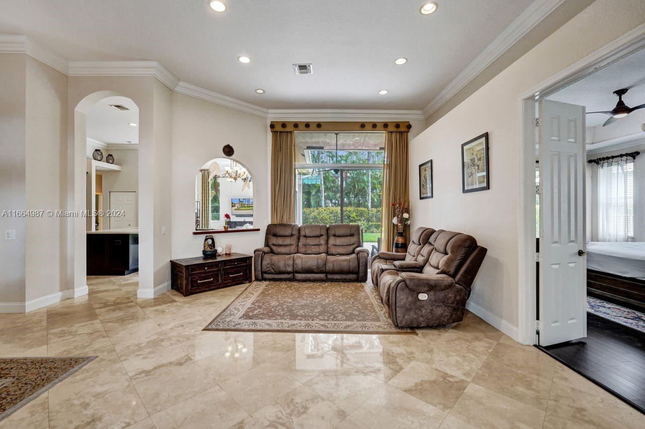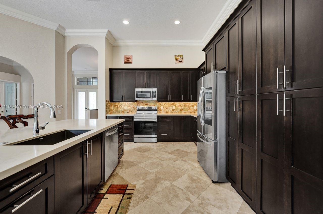 This beautiful house in Weston Hills Country Club features five bedrooms and three bathrooms in a split floor plan. The home boasts a spacious oversized lot with lush landscaping, creating an inviting entryway. The primary bedroom is generously sized with vaulted ceilings and hardwood flooring that accentuates the abundant natural light throughout the interior. The elegant decor and spacious layout provide a welcoming ambiance, with ample countertops and cabinetry in the kitchen, which is equipped with stainless steel and modern appliances, offering ample storage. Elegant architectural details and a covered patio lead to a spacious outdoor living area with a brick-paved patio, lush tropical landscaping, and a nice spacious yard.