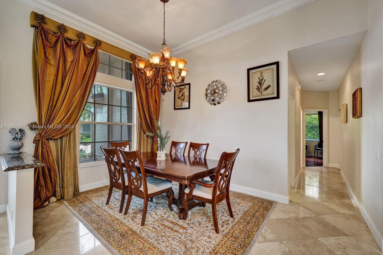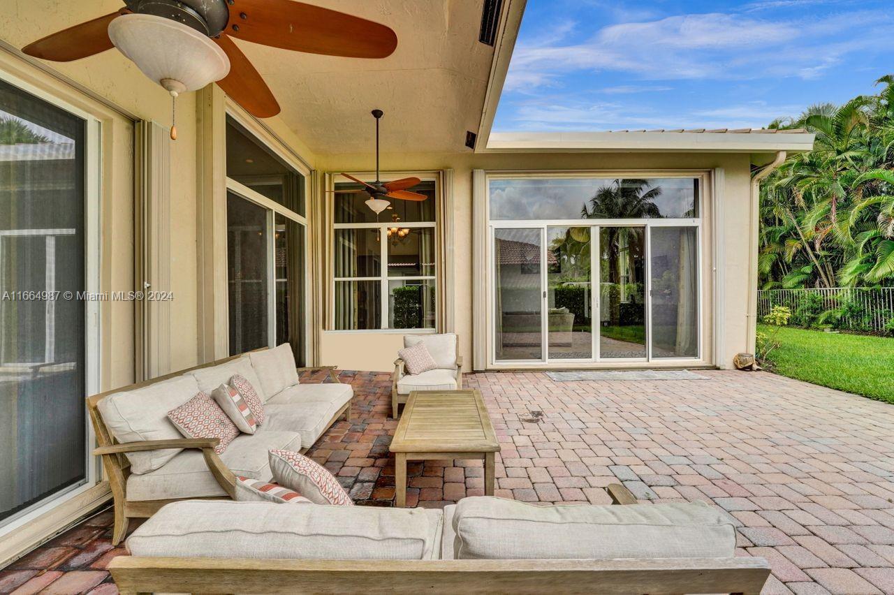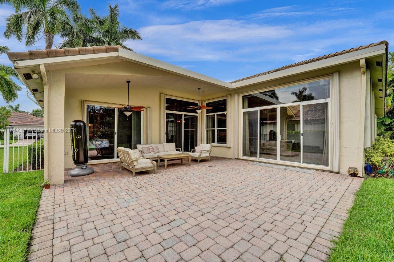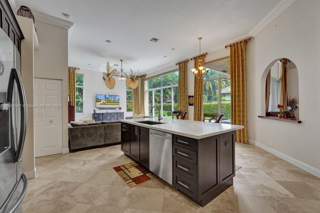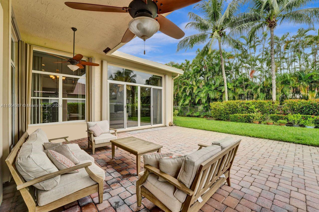 This beautiful house in Weston Hills Country Club features five bedrooms and three bathrooms in a split floor plan. The home boasts a spacious oversized lot with lush landscaping, creating an inviting entryway. The primary bedroom is generously sized with vaulted ceilings and hardwood flooring that accentuates the abundant natural light throughout the interior. The elegant decor and spacious layout provide a welcoming ambiance, with ample countertops and cabinetry in the kitchen, which is equipped with stainless steel and modern appliances, offering ample storage. Elegant architectural details and a covered patio lead to a spacious outdoor living area with a brick-paved patio, lush tropical landscaping, and a nice spacious yard.