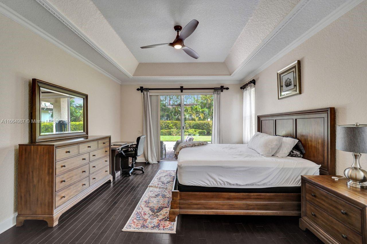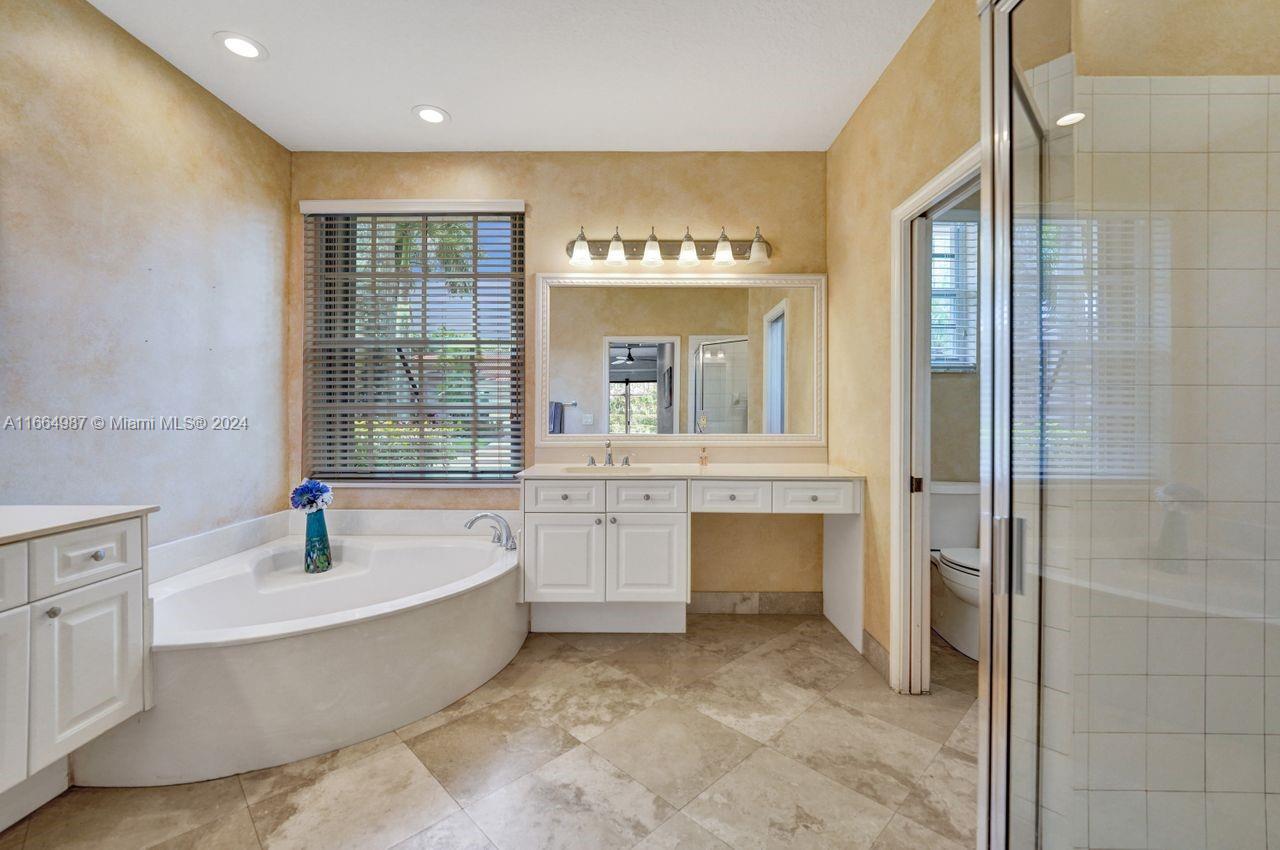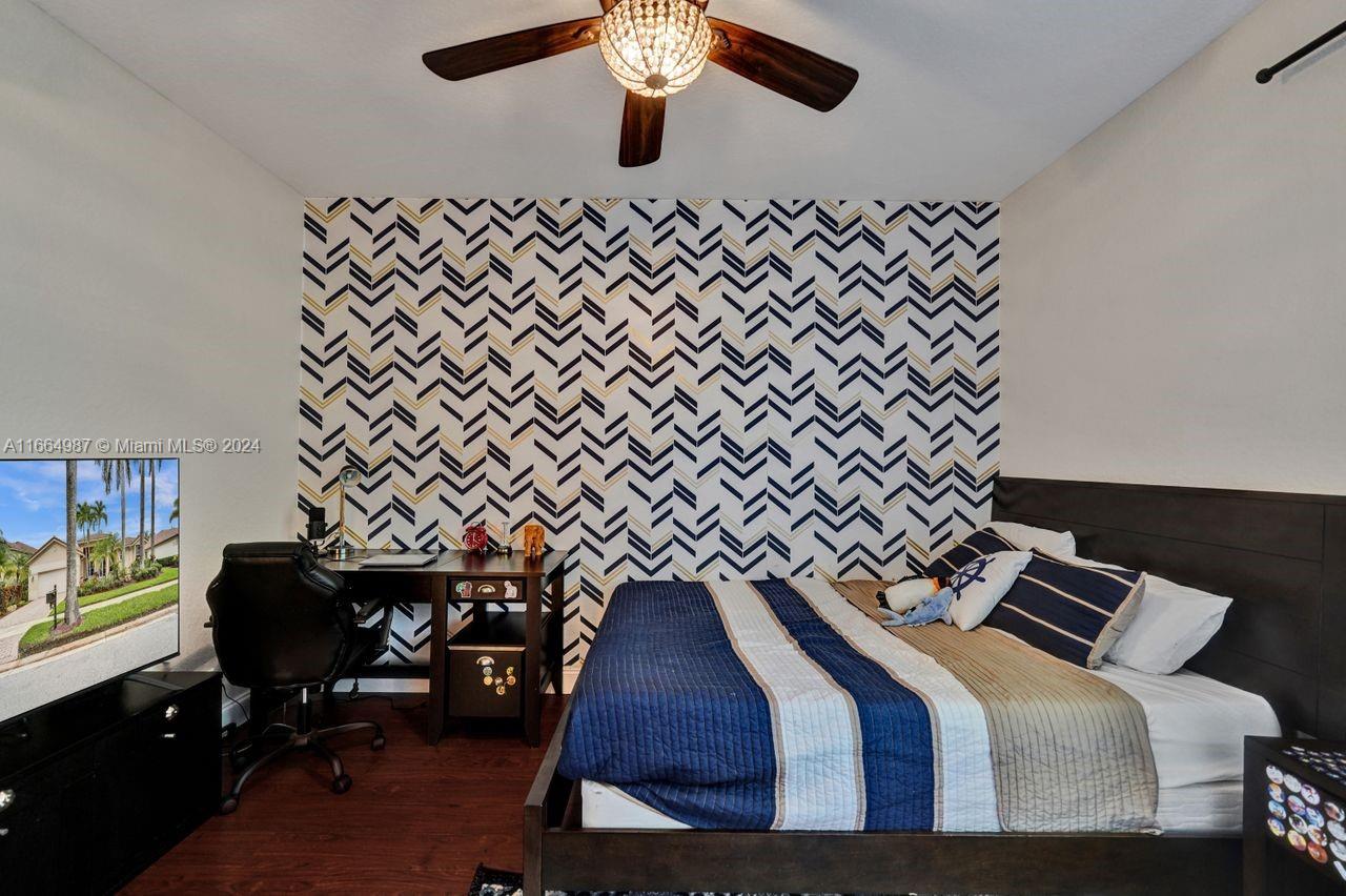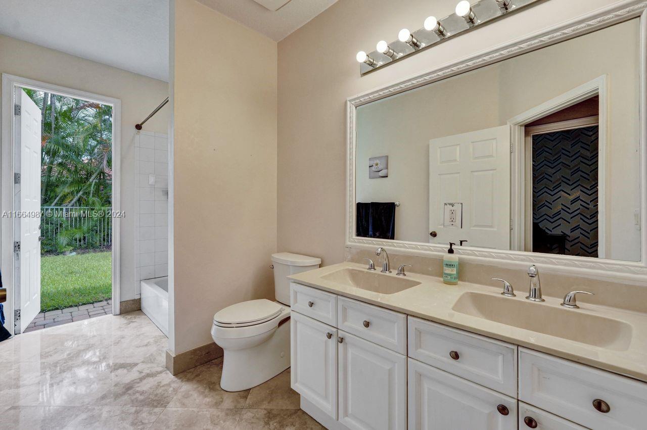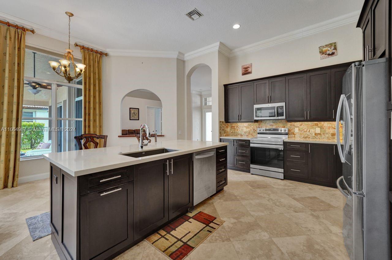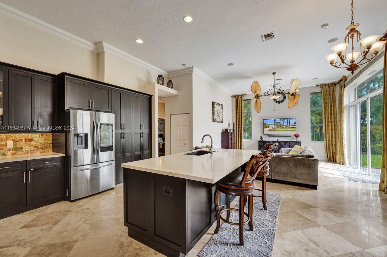 This beautiful house in Weston Hills Country Club features five bedrooms and three bathrooms in a split floor plan. The home boasts a spacious oversized lot with lush landscaping, creating an inviting entryway. The primary bedroom is generously sized with vaulted ceilings and hardwood flooring that accentuates the abundant natural light throughout the interior. The elegant decor and spacious layout provide a welcoming ambiance, with ample countertops and cabinetry in the kitchen, which is equipped with stainless steel and modern appliances, offering ample storage. Elegant architectural details and a covered patio lead to a spacious outdoor living area with a brick-paved patio, lush tropical landscaping, and a nice spacious yard.