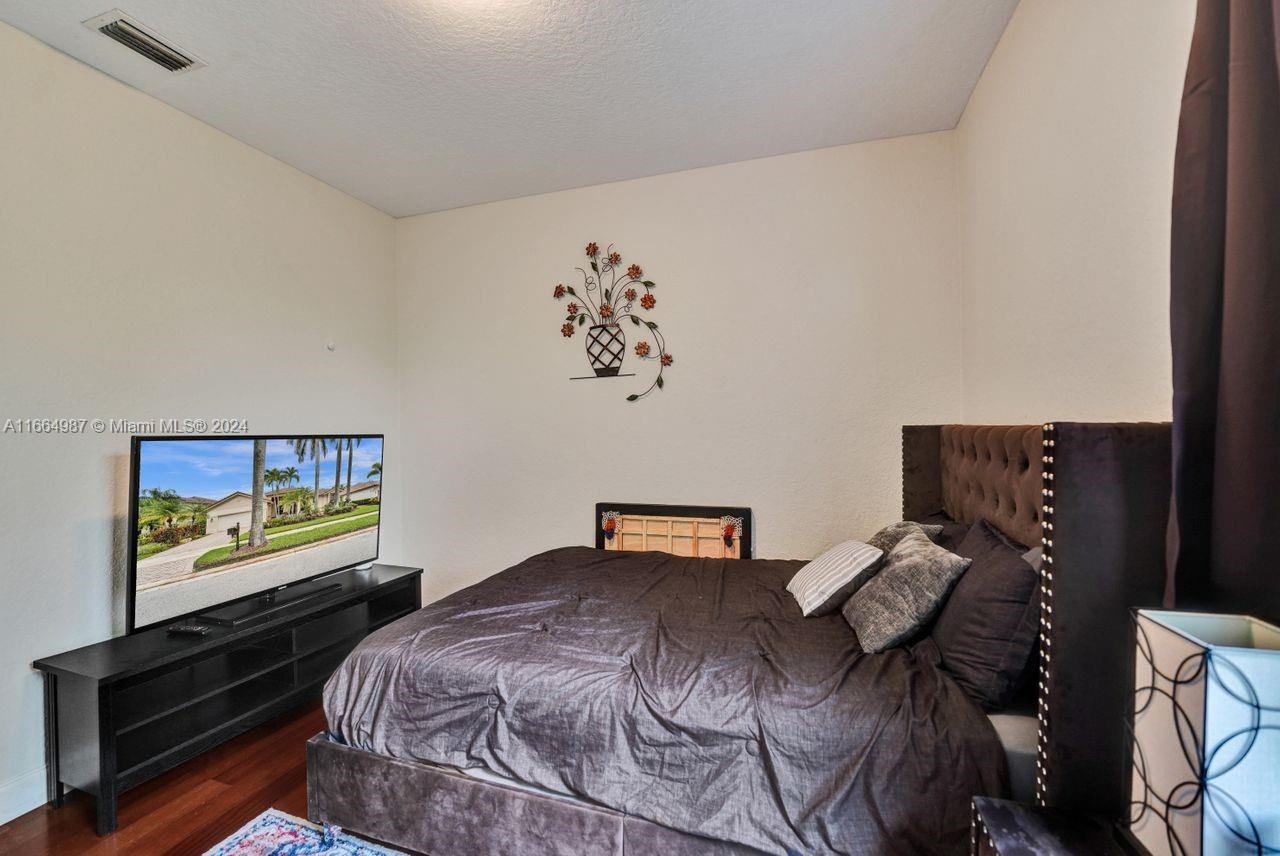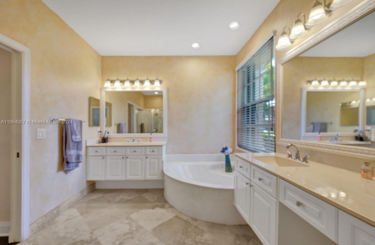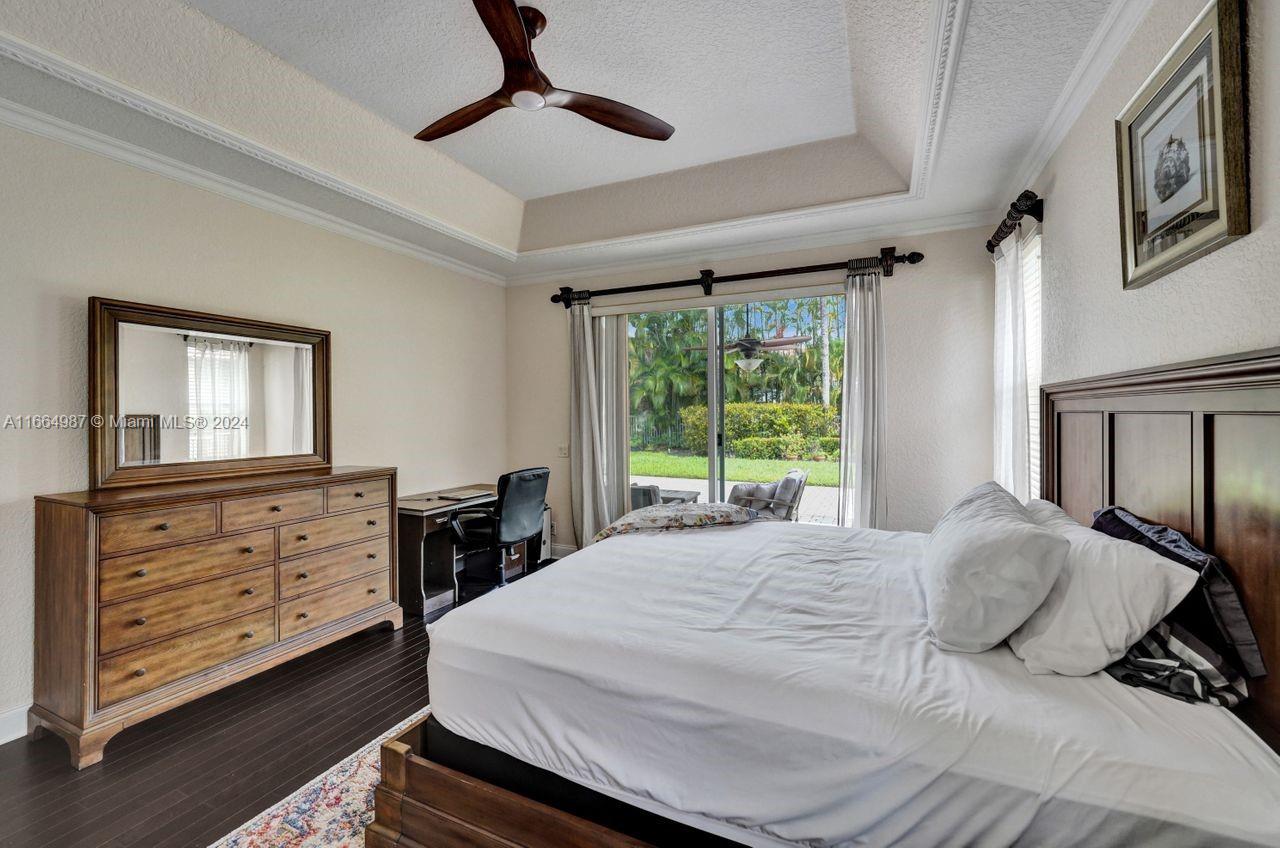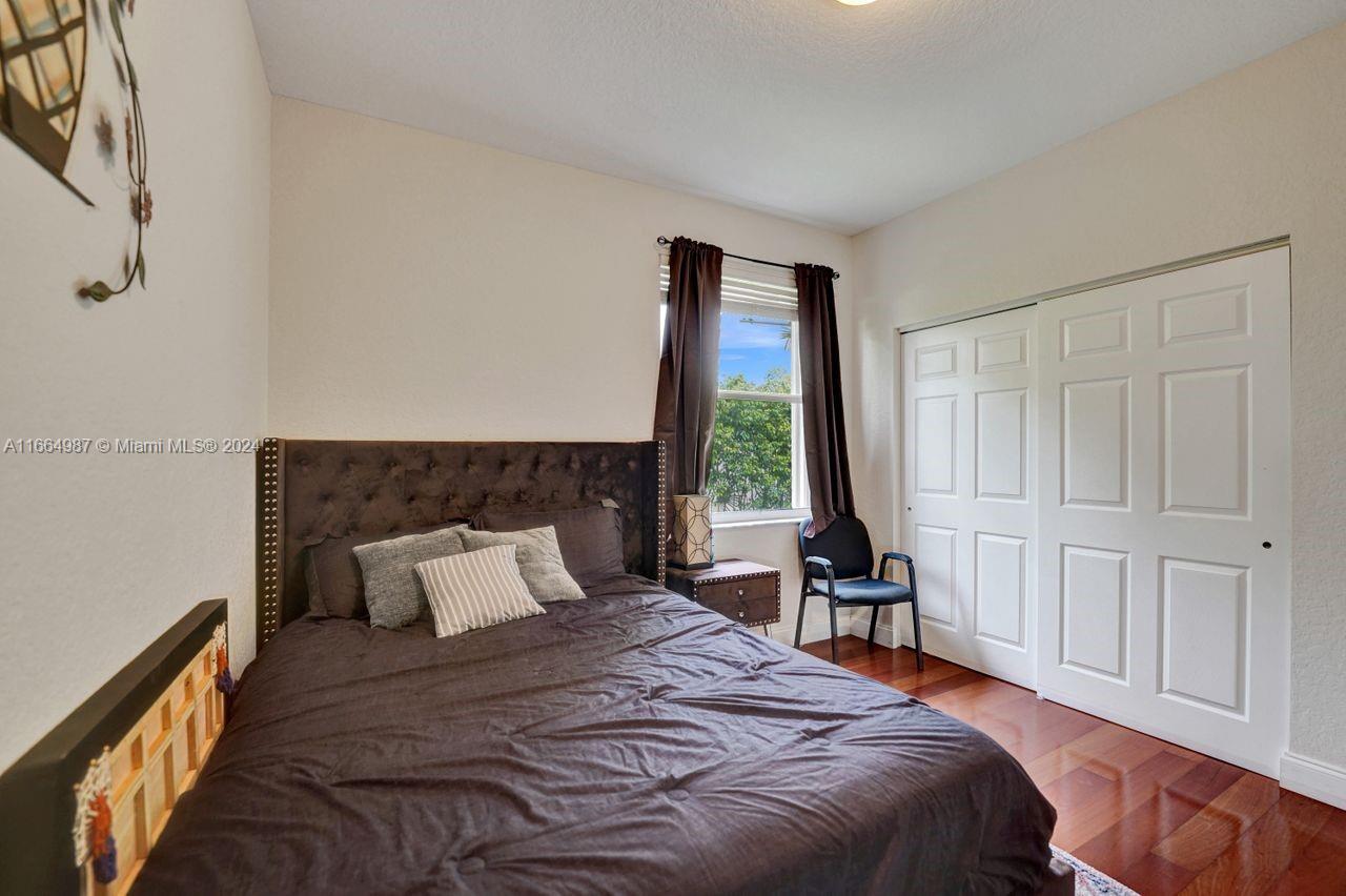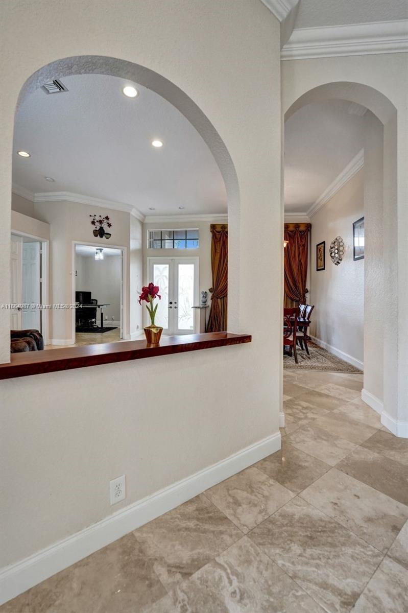 This beautiful house in Weston Hills Country Club features five bedrooms and three bathrooms in a split floor plan. The home boasts a spacious oversized lot with lush landscaping, creating an inviting entryway. The primary bedroom is generously sized with vaulted ceilings and hardwood flooring that accentuates the abundant natural light throughout the interior. The elegant decor and spacious layout provide a welcoming ambiance, with ample countertops and cabinetry in the kitchen, which is equipped with stainless steel and modern appliances, offering ample storage. Elegant architectural details and a covered patio lead to a spacious outdoor living area with a brick-paved patio, lush tropical landscaping, and a nice spacious yard.