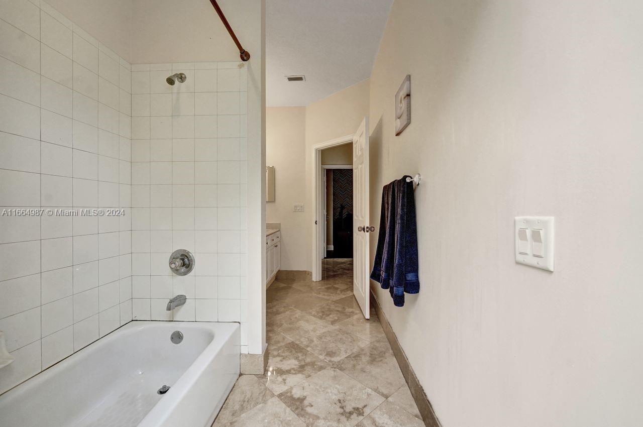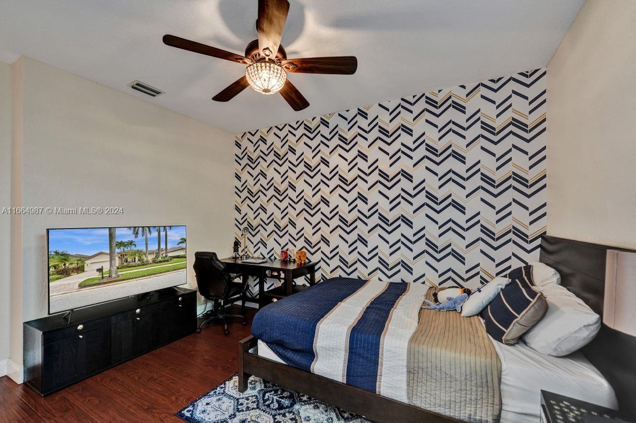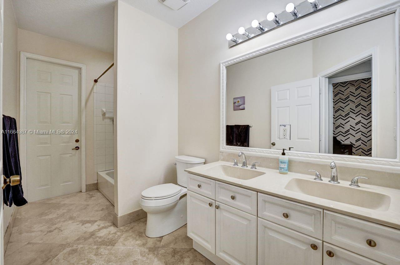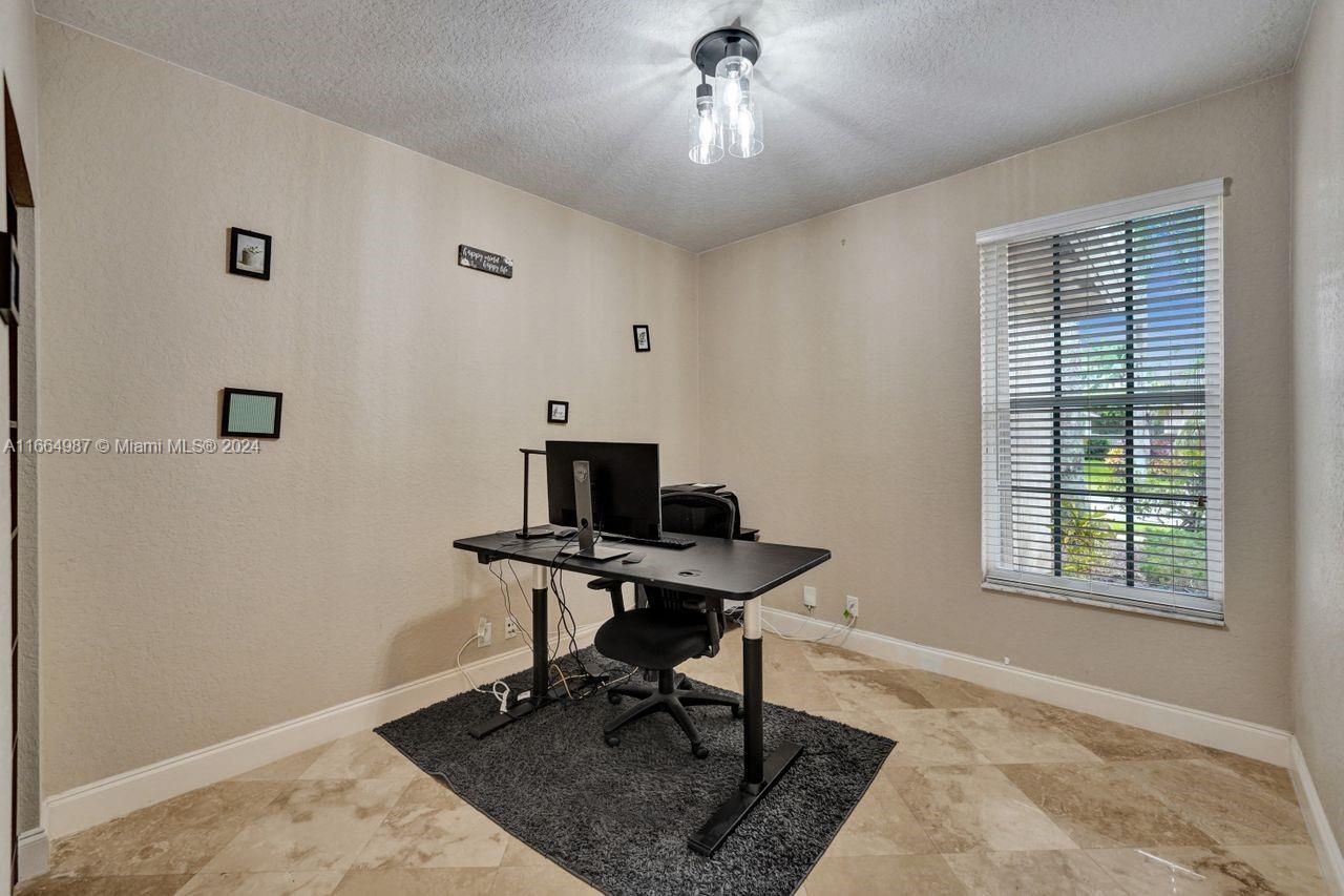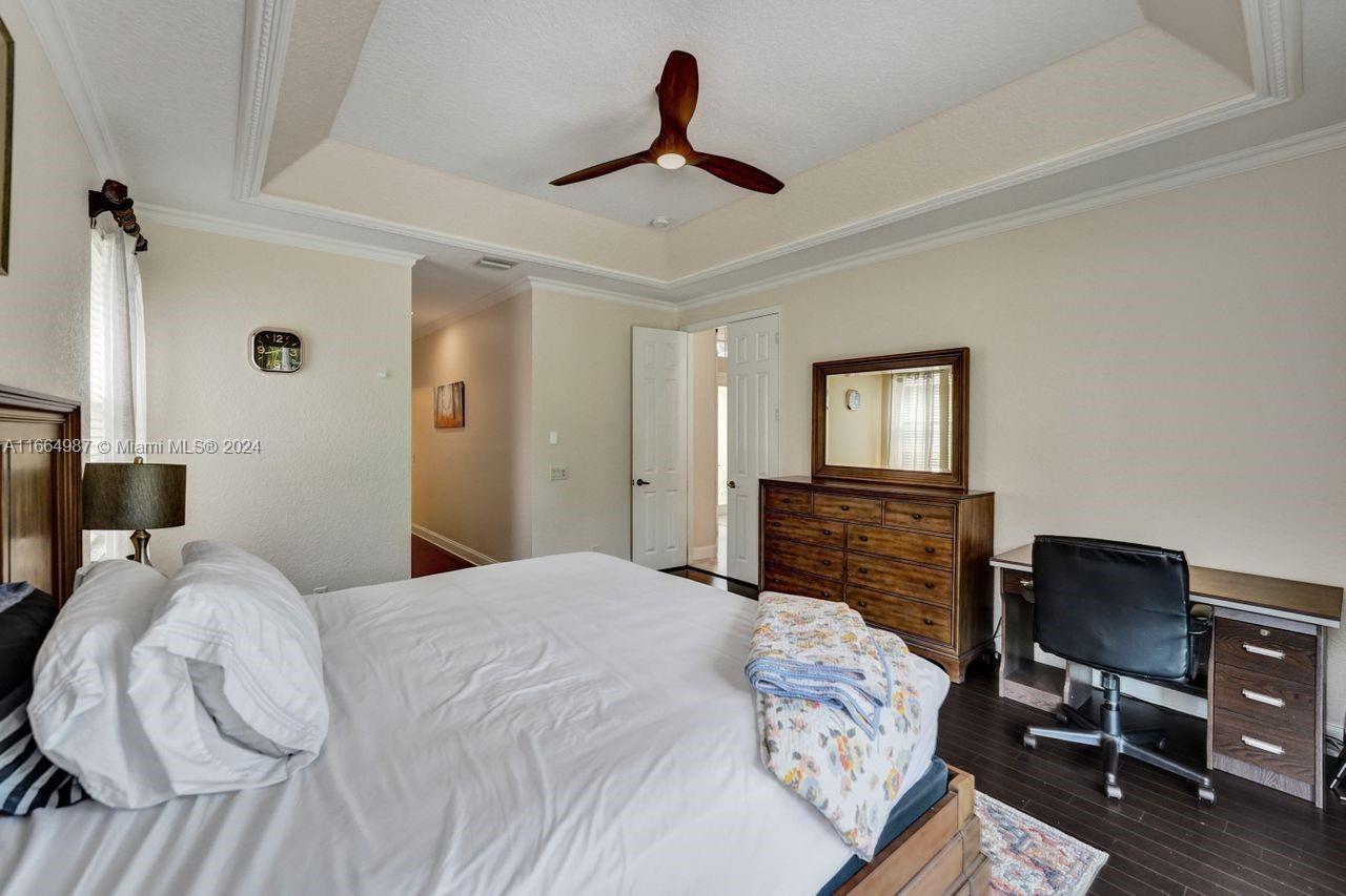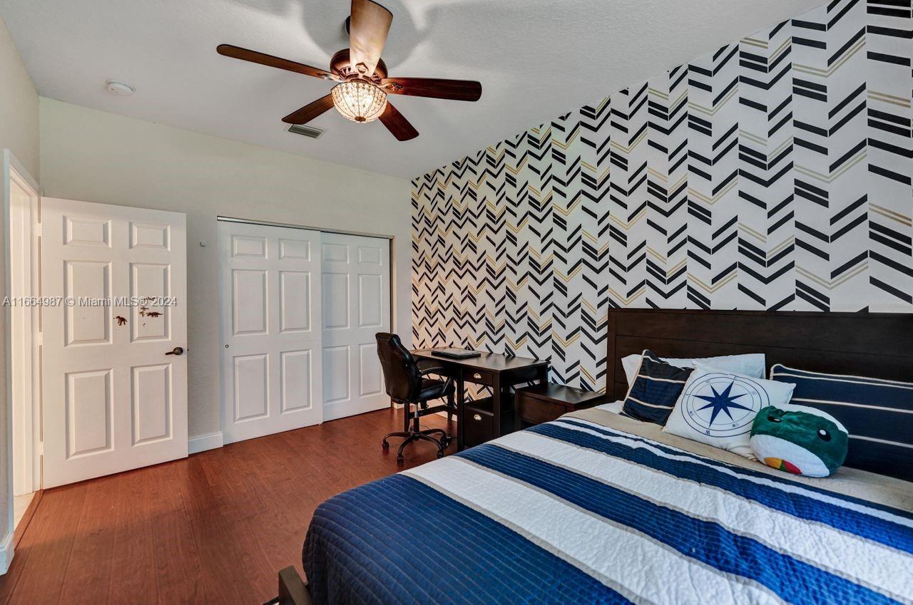 This beautiful house in Weston Hills Country Club features five bedrooms and three bathrooms in a split floor plan. The home boasts a spacious oversized lot with lush landscaping, creating an inviting entryway. The primary bedroom is generously sized with vaulted ceilings and hardwood flooring that accentuates the abundant natural light throughout the interior. The elegant decor and spacious layout provide a welcoming ambiance, with ample countertops and cabinetry in the kitchen, which is equipped with stainless steel and modern appliances, offering ample storage. Elegant architectural details and a covered patio lead to a spacious outdoor living area with a brick-paved patio, lush tropical landscaping, and a nice spacious yard.
