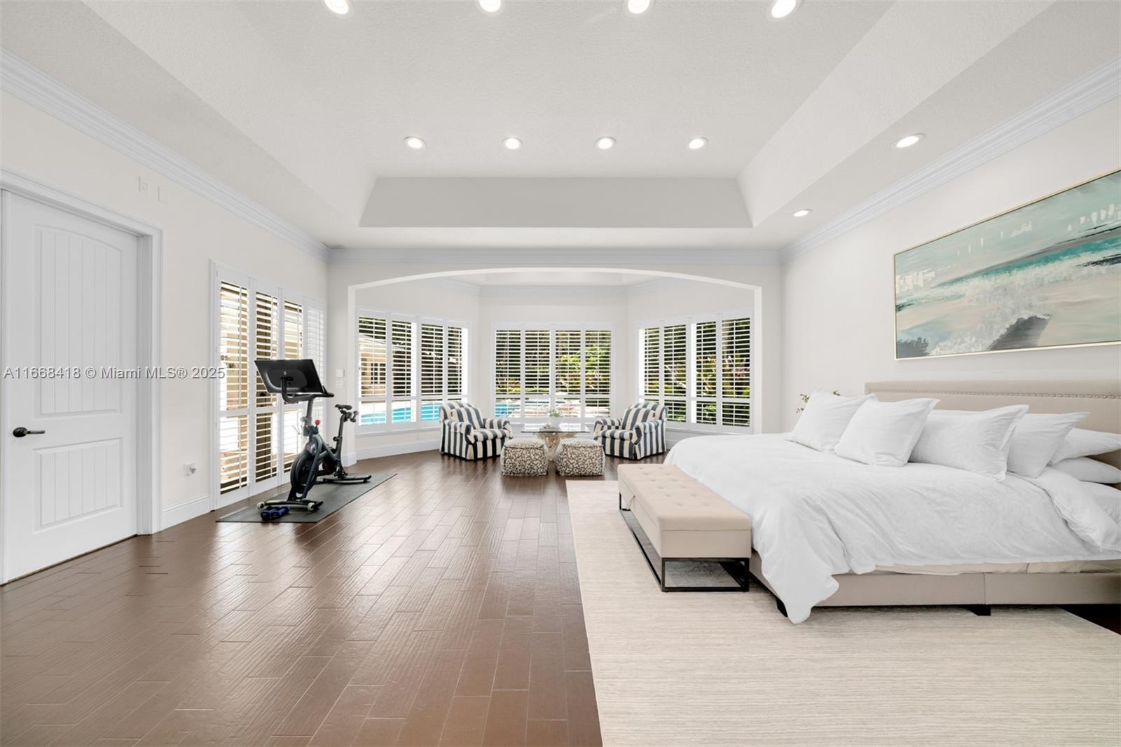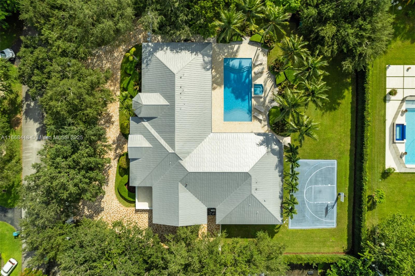 This tropical, 1-story gated estate, with its contemporary metal roof, is expertly crafted to offer the perfect blend of relaxation and entertainment. Step into an open layout where the kitchen seamlessly flows into the formal dining room and spacious living area, featuring an impressive grand bar perfect for hosting. The secluded primary suite offers privacy on the opposite side of the house, with a luxurious bathroom that includes separate sinks, a soaking tub, and a separate shower. Step outside to a vast 38,768 SqFt lot featuring a covered terrace, BBQ area, and inviting seating perfect for outdoor gatherings. The property also includes a basketball court surrounded by lush greenery, offering an ideal space for both relaxation and recreation.