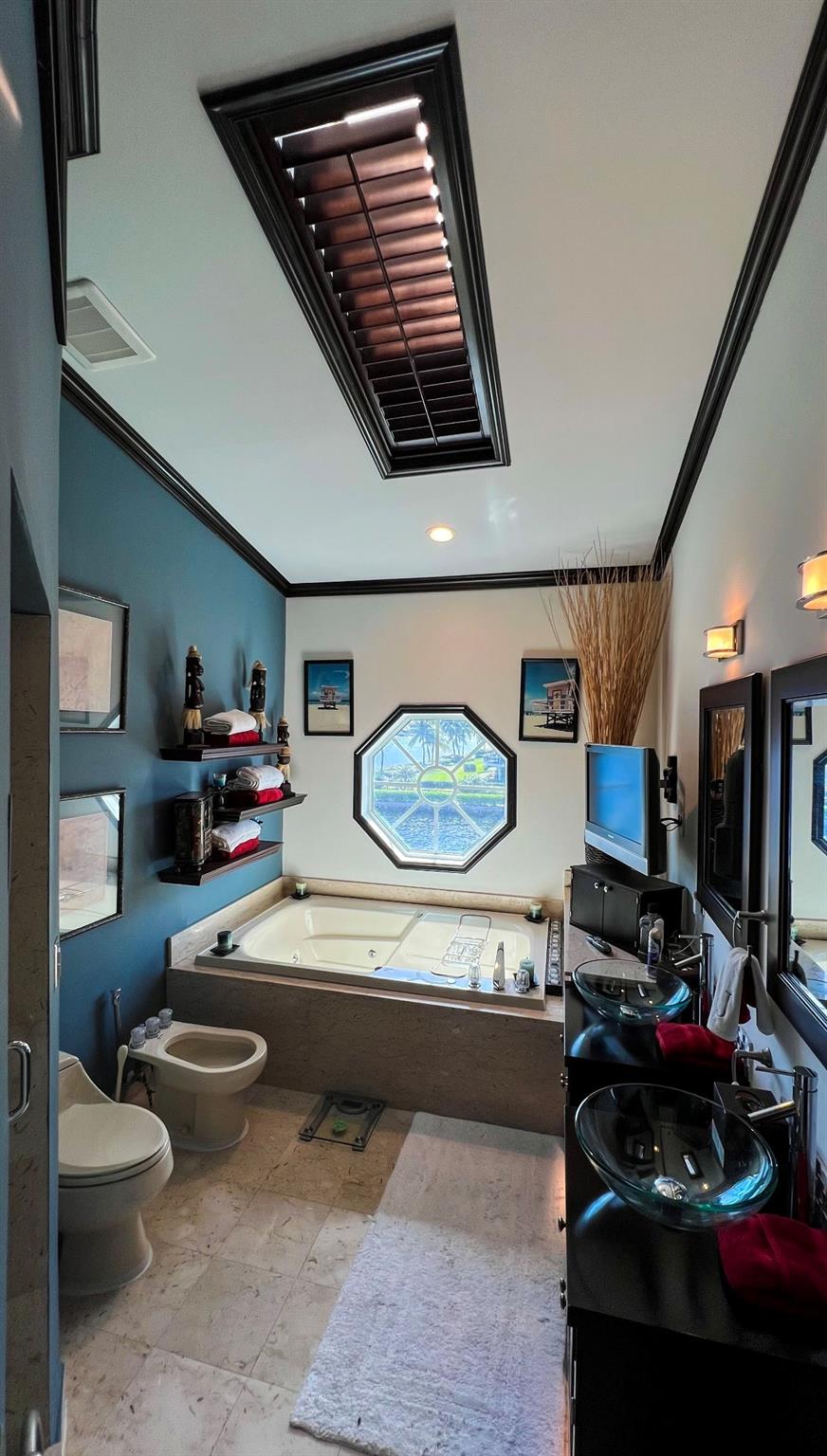 Bidet, DualSinks, SecondFloorEntry, GardenTubRomanTub, JettedTub, LivingDiningRoom, MainLivingAreaEntryLevel, SplitBedrooms, Skylights, SeparateShower, UpperLevelPrimary, Attic, Elevator
