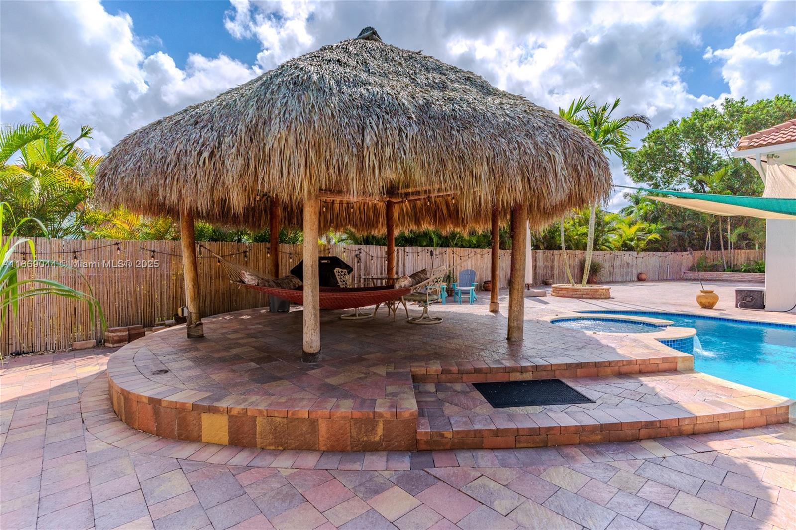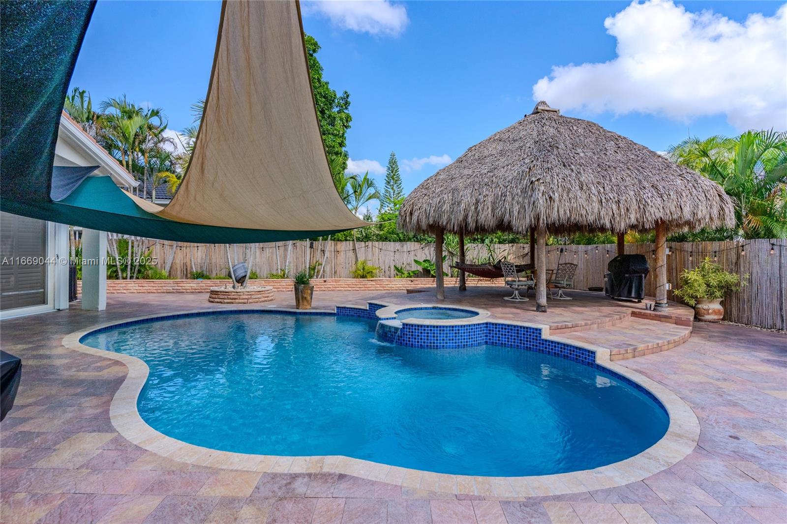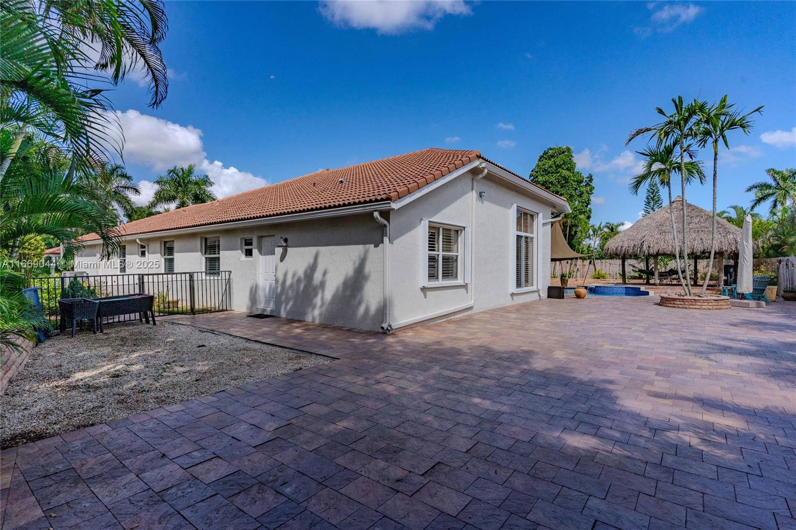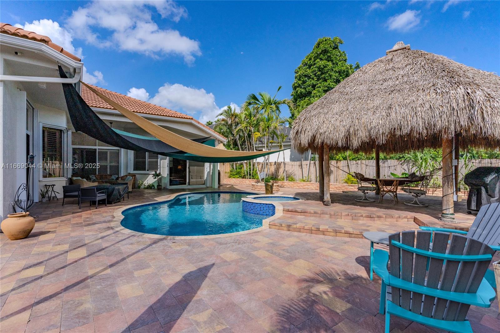 This stunning home is nestled in the desirable community of Sunset Lakes. Upon entering you will discover the spacious layout with beautiful French tile throughout in a split floor plan design. If you like to entertain then you will fall in love with the resort style backyard that includes a newly resurfaced fully automated pool with jacuzzi, large Tiki hut, bistro lights throughout and plenty of room to lounge and enjoy the sunshine. Inside you will enjoy a full eat in kitchen and an enormous family room. Plantation shutters all throughout adorn the newly installed high impact windows and doors. Don't miss out on this wonderful opportunity to make this amazing single-story home yours.