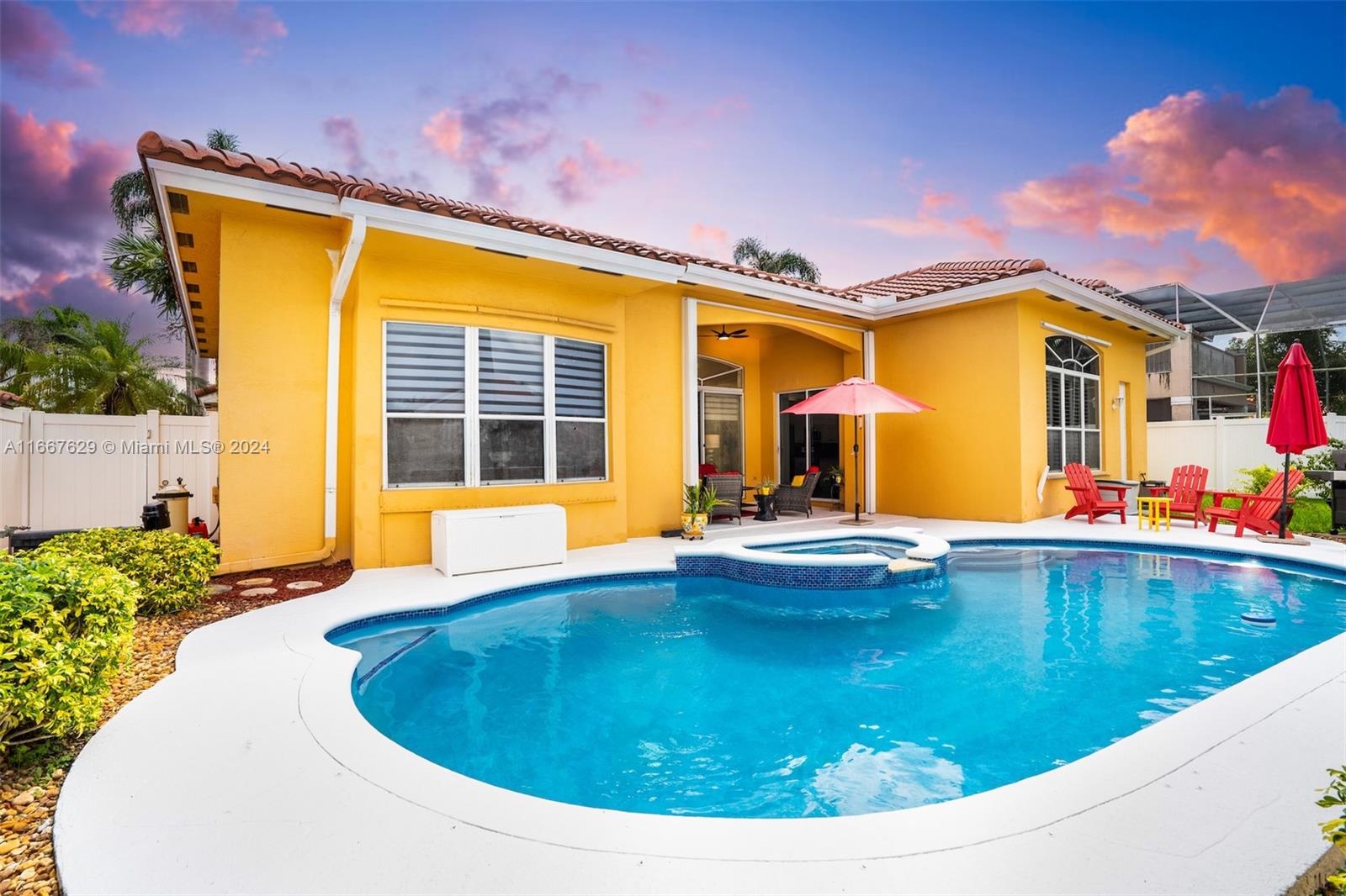 Discover your dream home in this updated one-story gem located in the family friendly gated community of Estancia, right in the heart of Pembroke Pines. Step inside to find this beautiful light & bright open-concept home, welcoming you by a spacious formal living room, perfect for entertaining. A formal dining area and updated kitchen boasts stainless steel appliances, elegant granite countertops, & ample cabinetry, making it a chef's delight. The spacious master suite includes an upgraded private en-suite bathroom along w/his & hers closets. Step outside to a serene backyard oasis, complete with a pool & jacuzzi ideal for outdoor gatherings. Located just minutes from shopping, dining parks & top-rated schools. Roof replaced 2020.