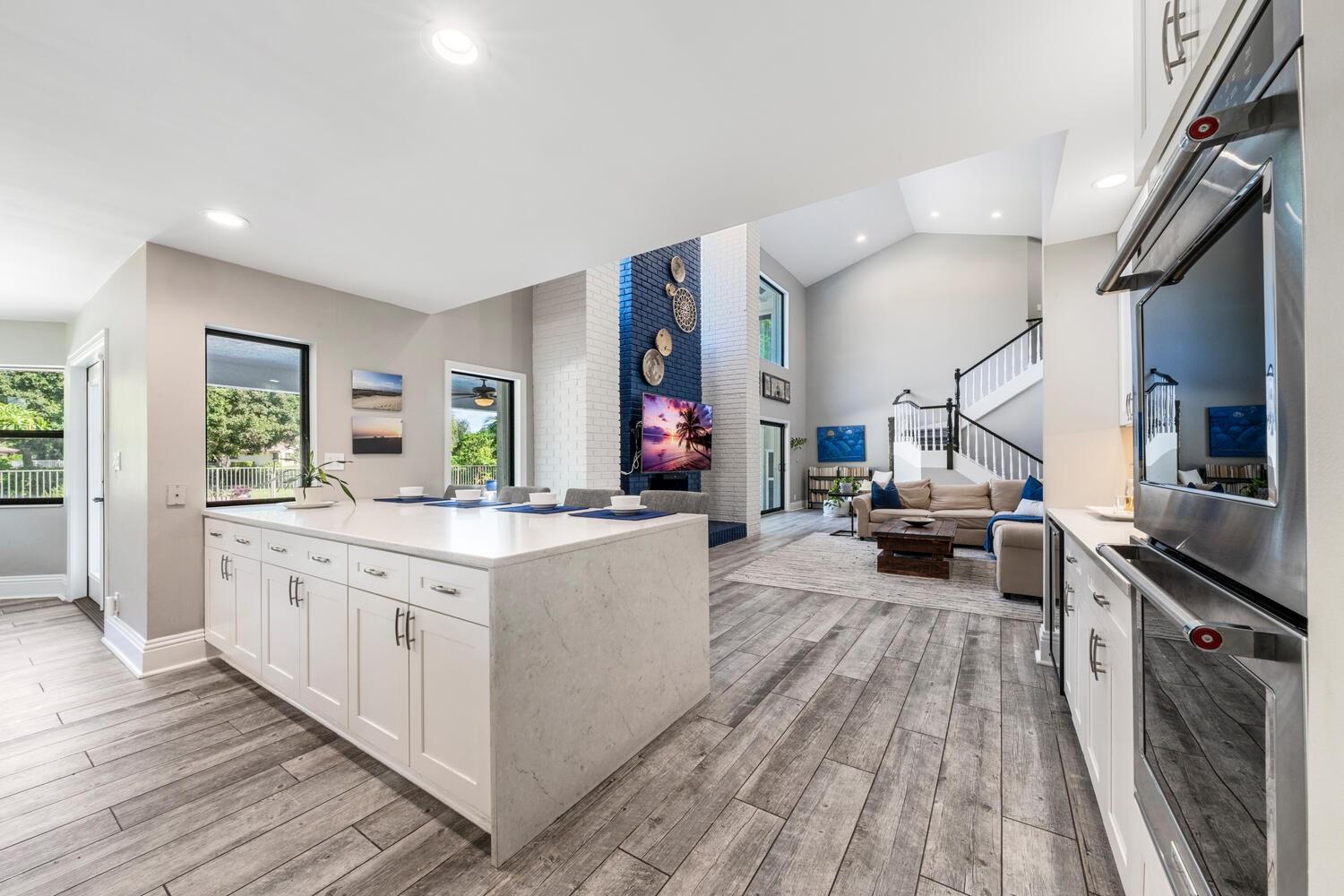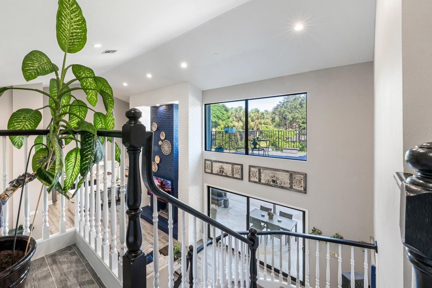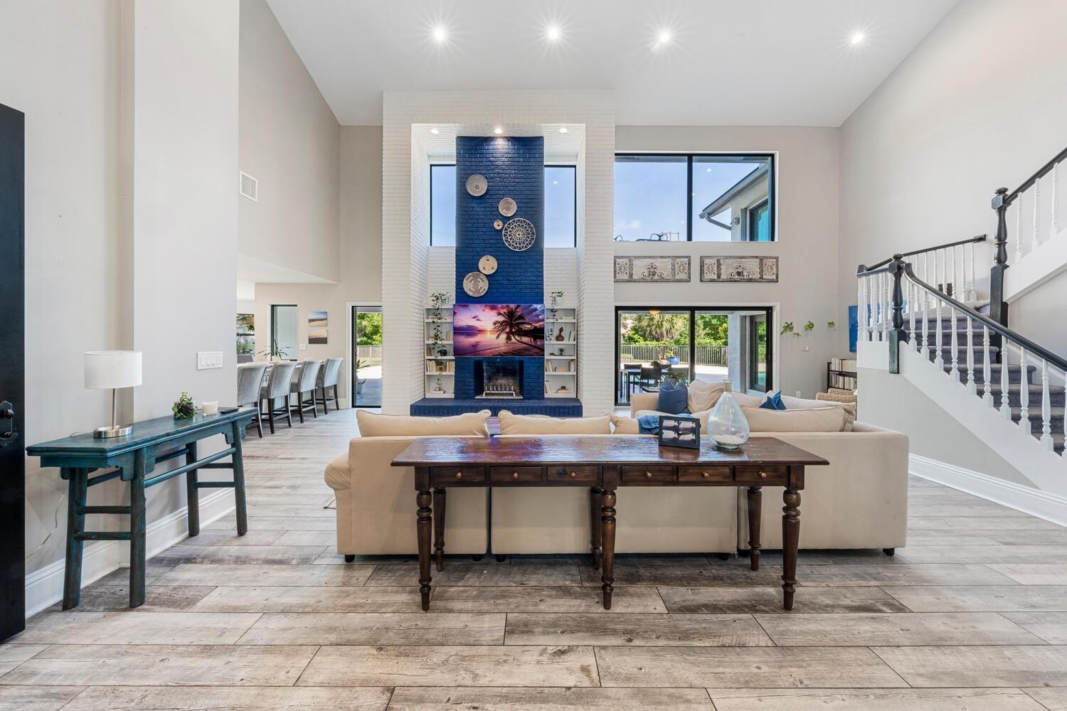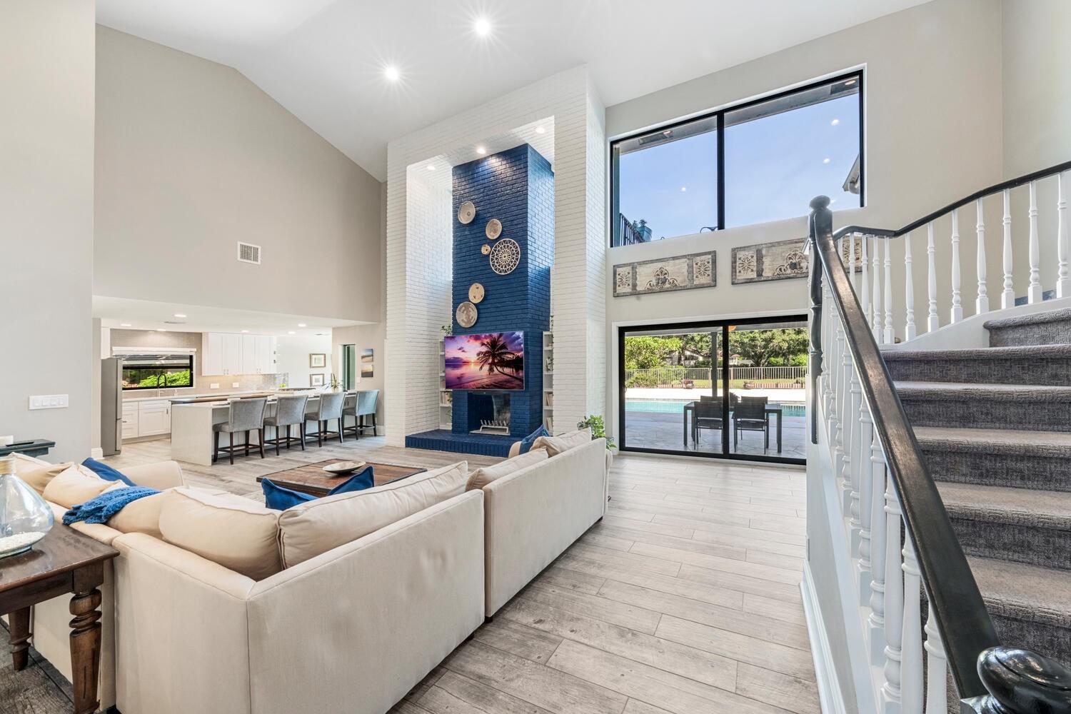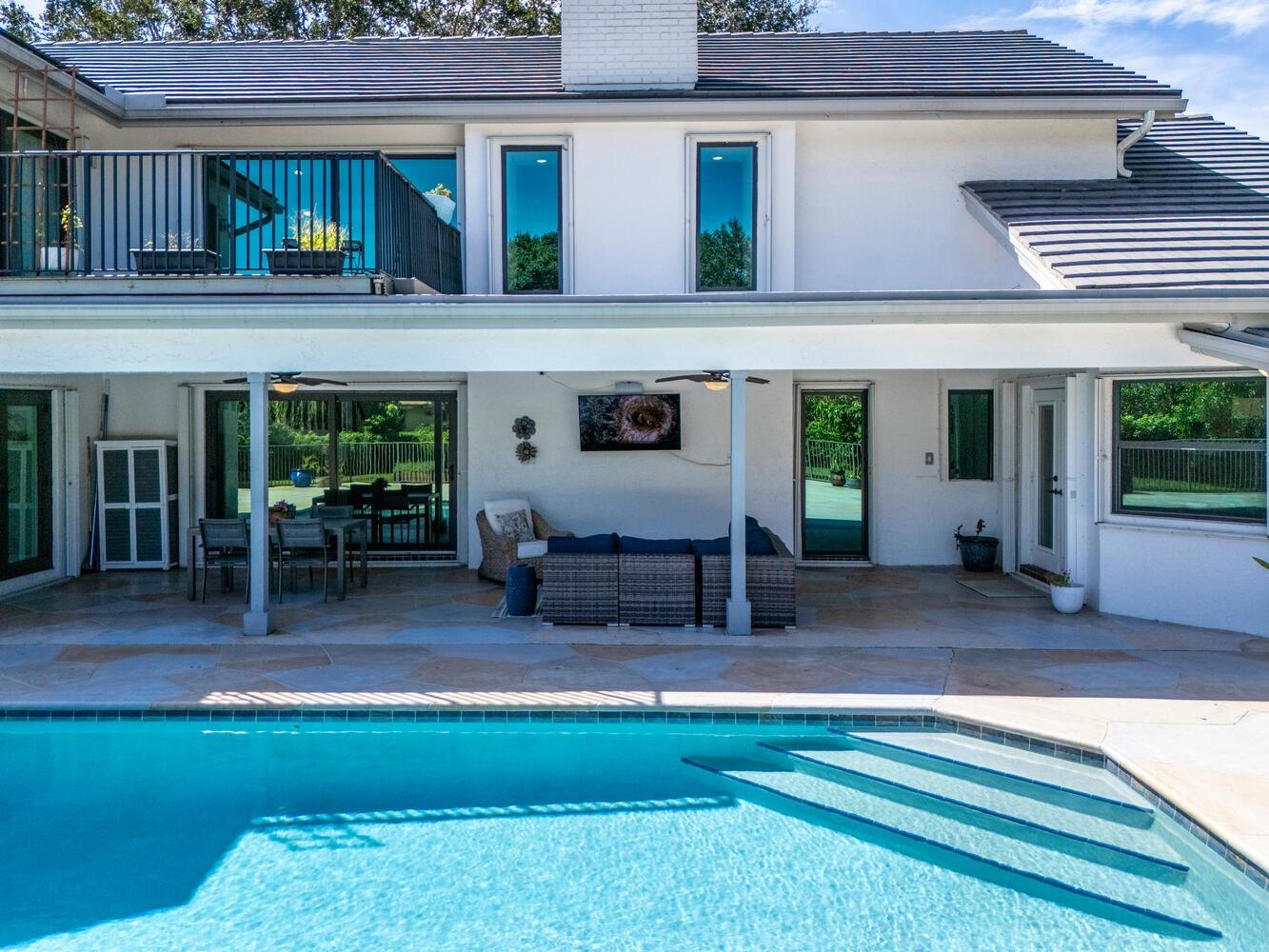 Step into STUNNING in this .79-acre estate-completely remodeled & exquisitely appointed! The charming front porch invites you into a spacious great room, featuring a floor-to-ceiling brick fireplace. Directly off the foyer is a spacious den/office. Open & light, the soaring, volume ceilings accentuate the space. Bathrooms have been recently & beautifully updated--especially the primary, w/the free-standing tub, frameless shower & double vanity. Only the lovely, primary bedroom suite is upstairs, w/his & her closets & a private balcony. The chef's kitchen boasts top notch appliances, including a gas cooktop, gorgeous, white cabinets & quartz countertop. A large, covered patio overlooks the pool & amazing yard! Extras include 4-car garage w/AC, roof 2018 & all impact windows & doors!