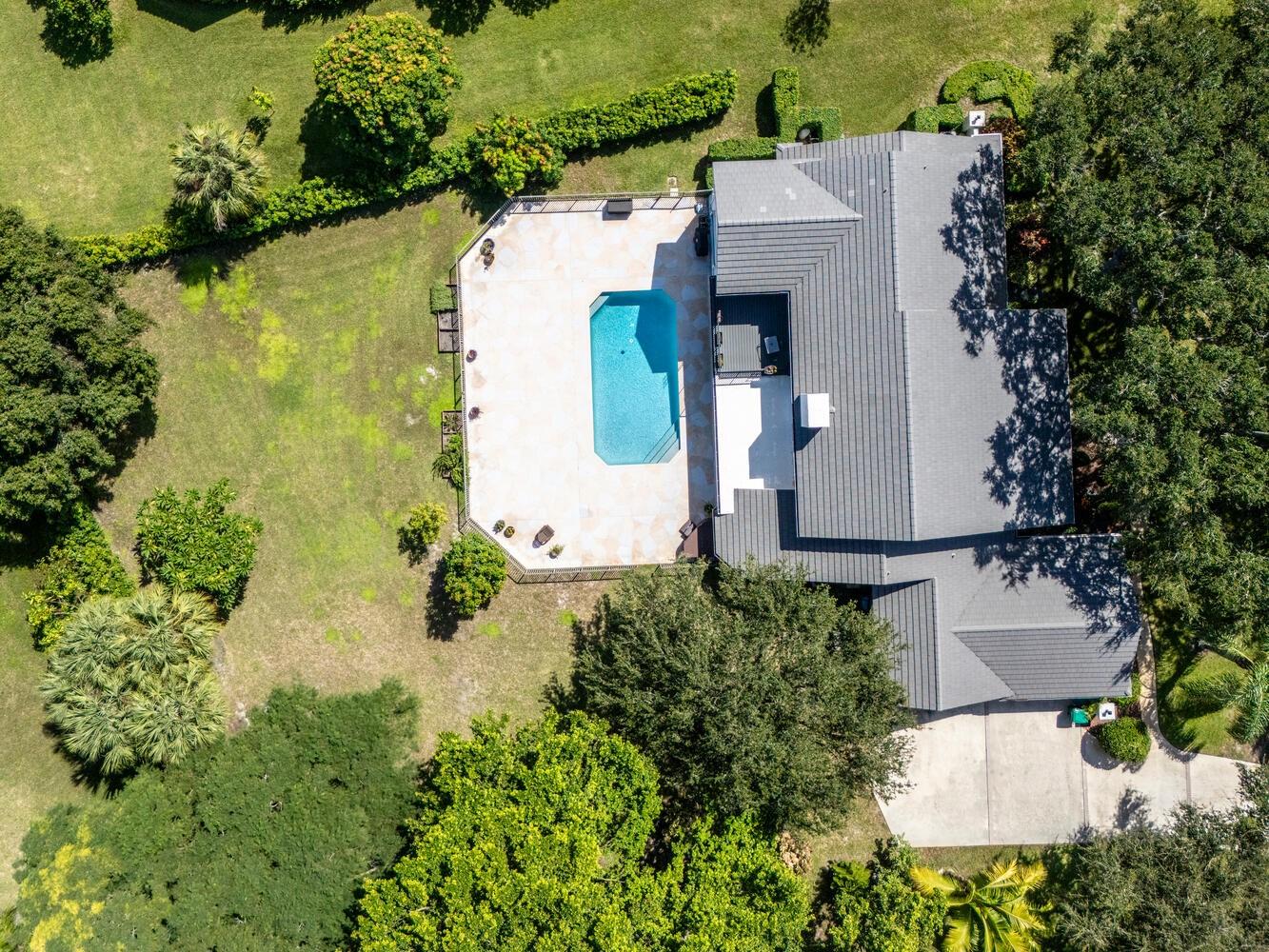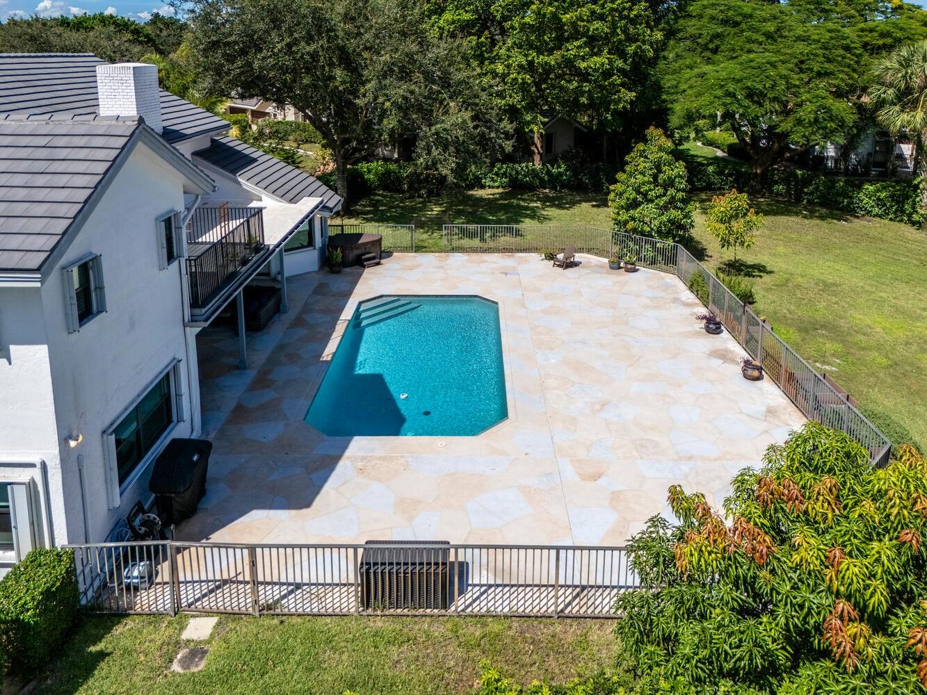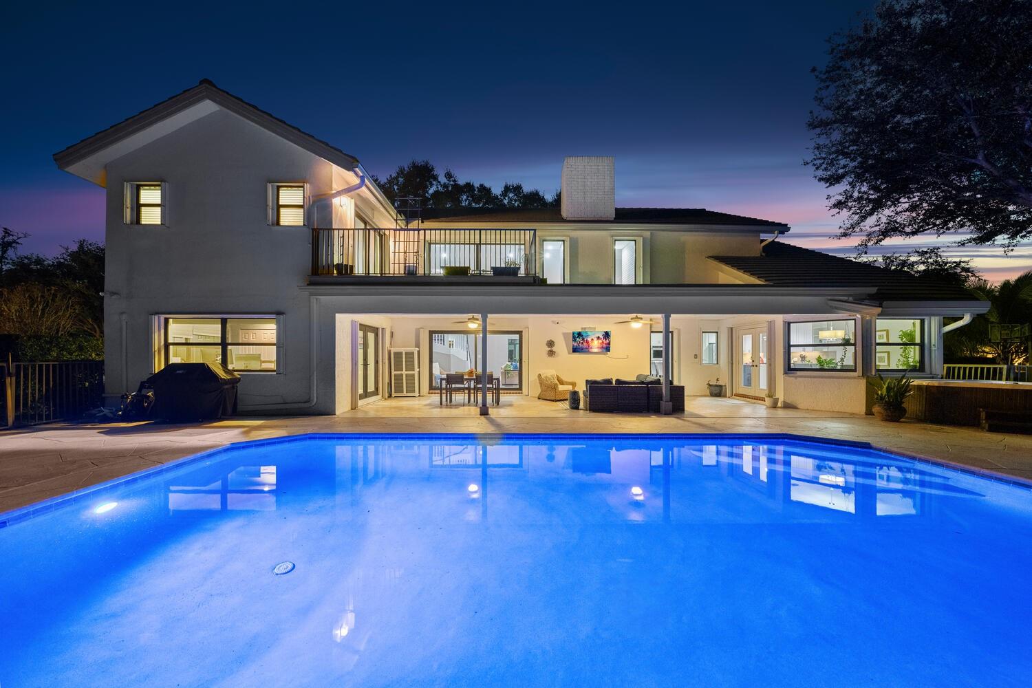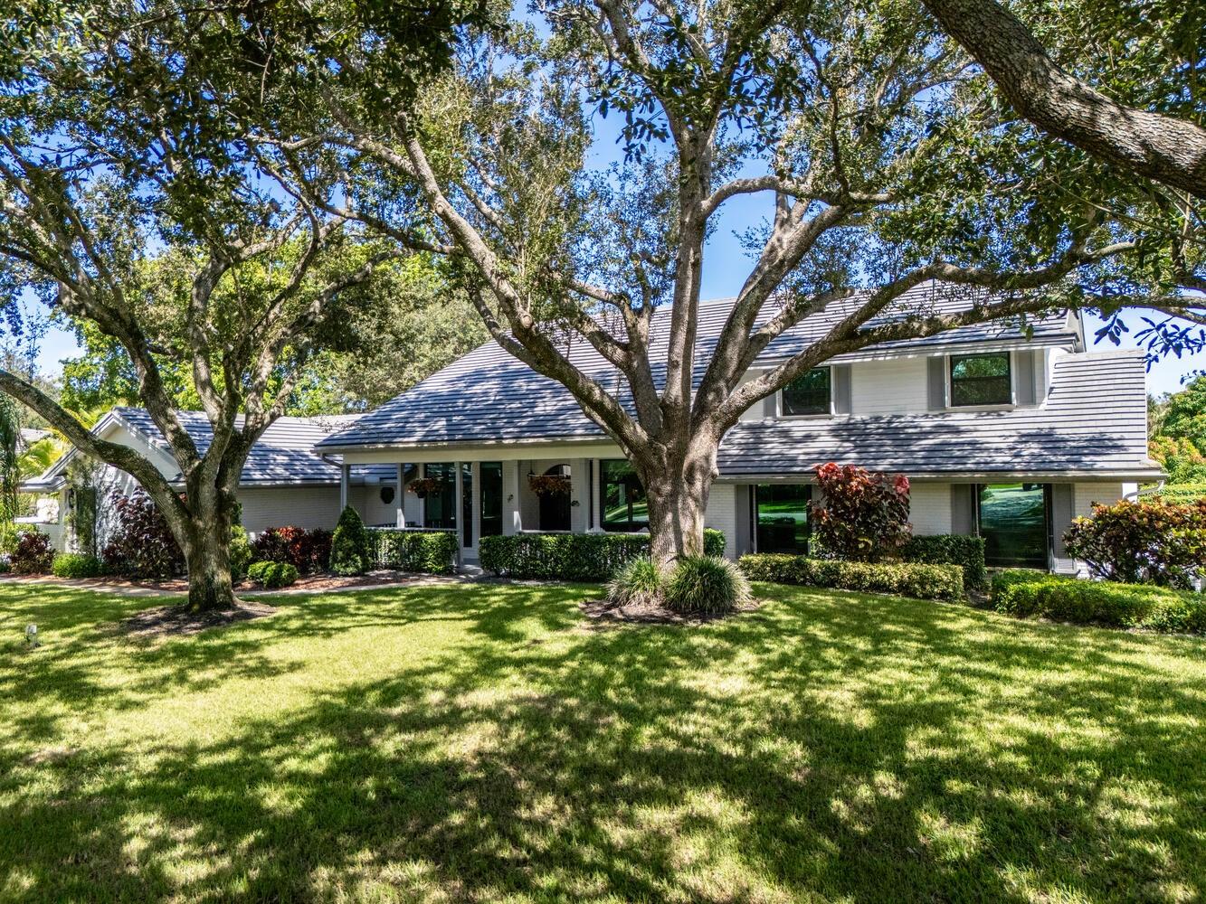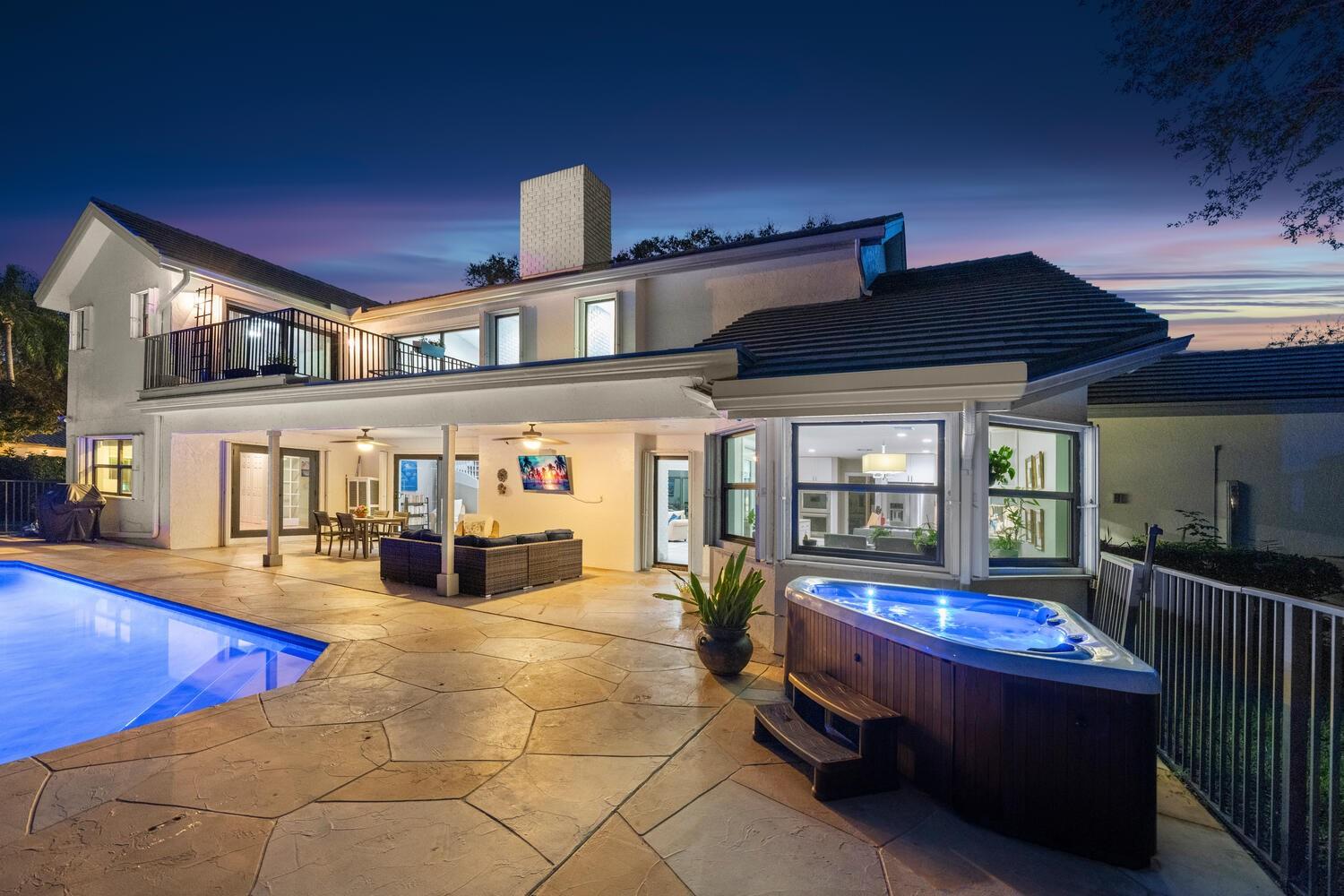 Step into STUNNING in this .79-acre estate-completely remodeled & exquisitely appointed! The charming front porch invites you into a spacious great room, featuring a floor-to-ceiling brick fireplace. Directly off the foyer is a spacious den/office. Open & light, the soaring, volume ceilings accentuate the space. Bathrooms have been recently & beautifully updated--especially the primary, w/the free-standing tub, frameless shower & double vanity. Only the lovely, primary bedroom suite is upstairs, w/his & her closets & a private balcony. The chef's kitchen boasts top notch appliances, including a gas cooktop, gorgeous, white cabinets & quartz countertop. A large, covered patio overlooks the pool & amazing yard! Extras include 4-car garage w/AC, roof 2018 & all impact windows & doors!