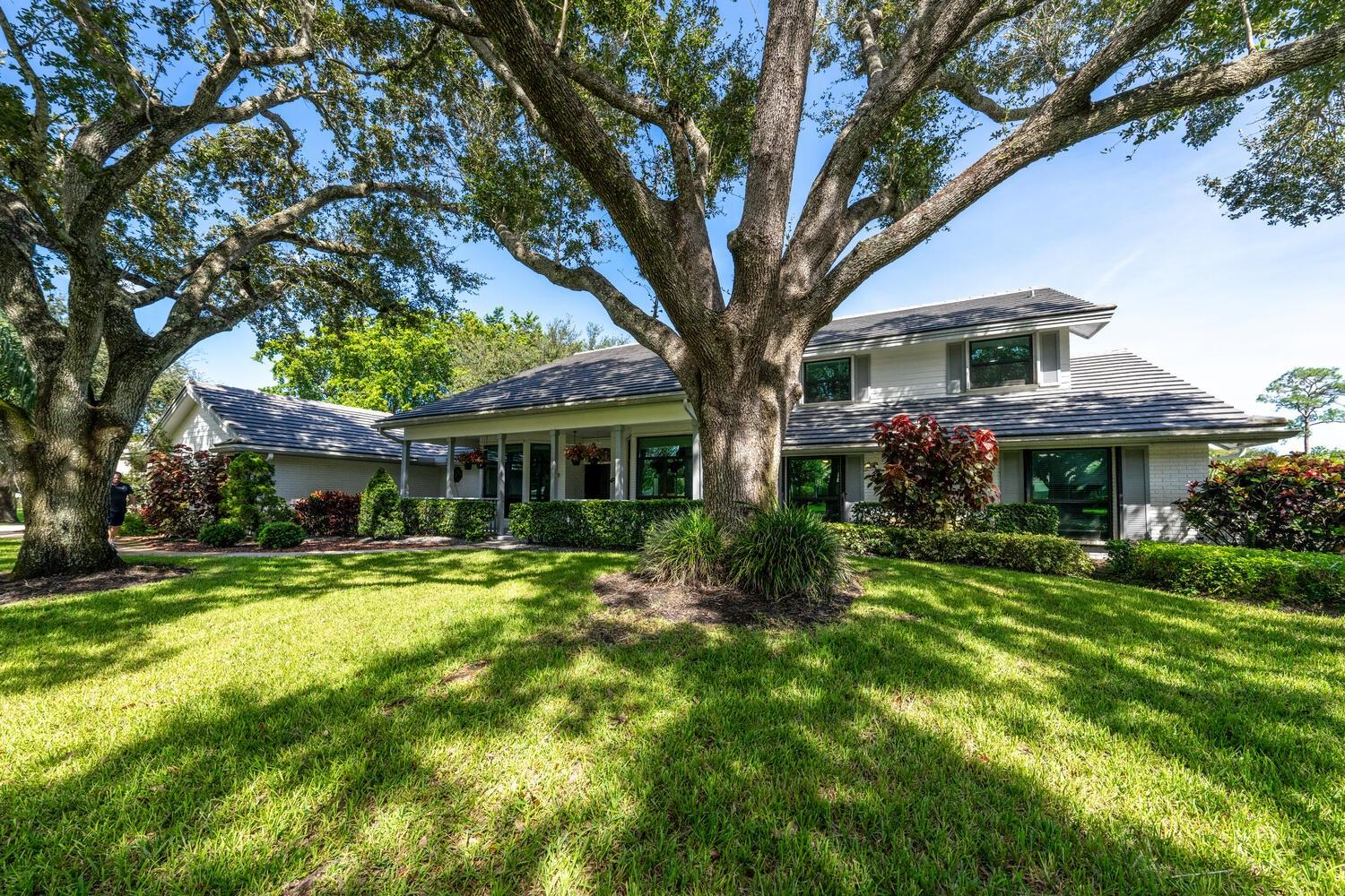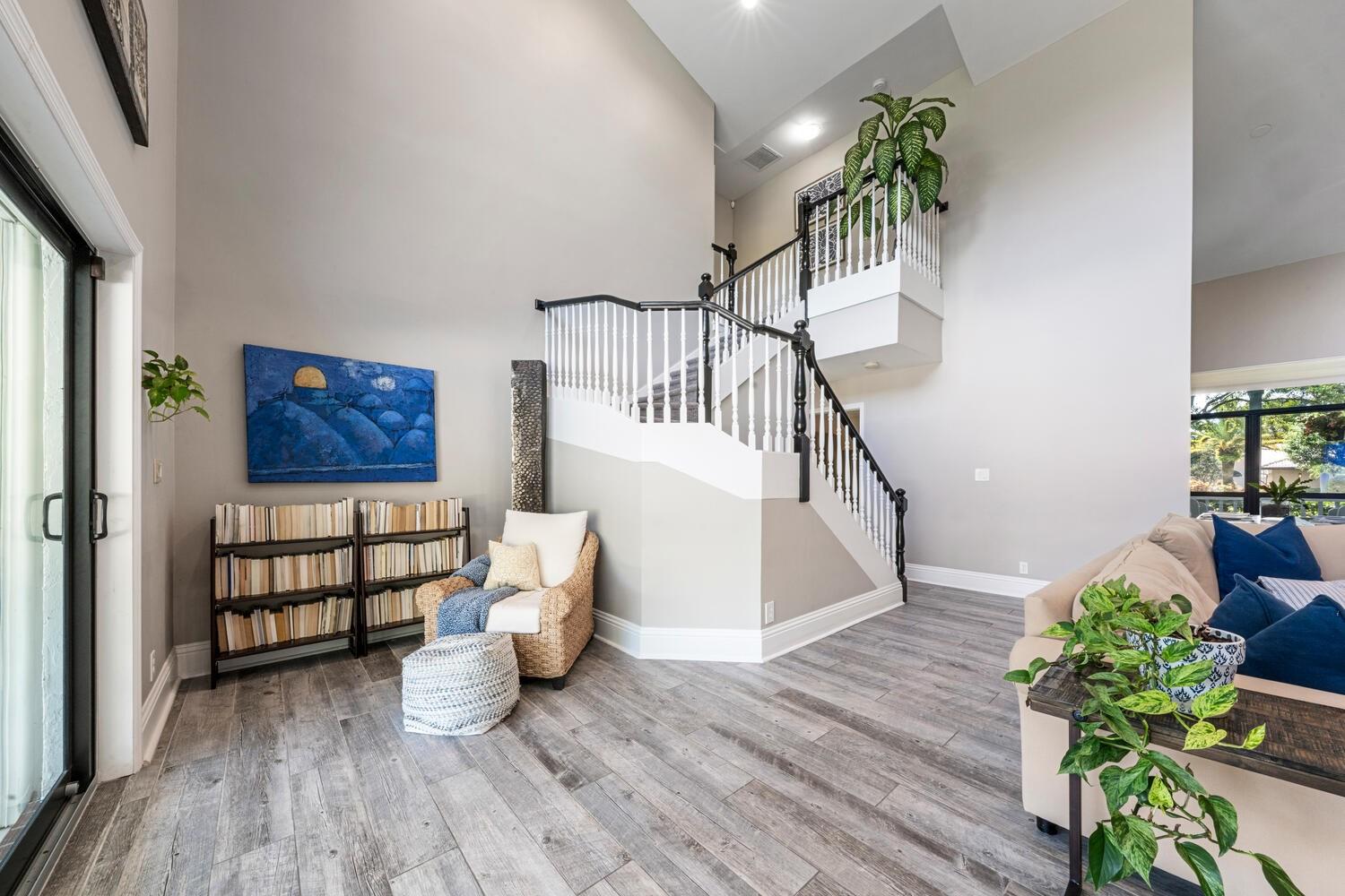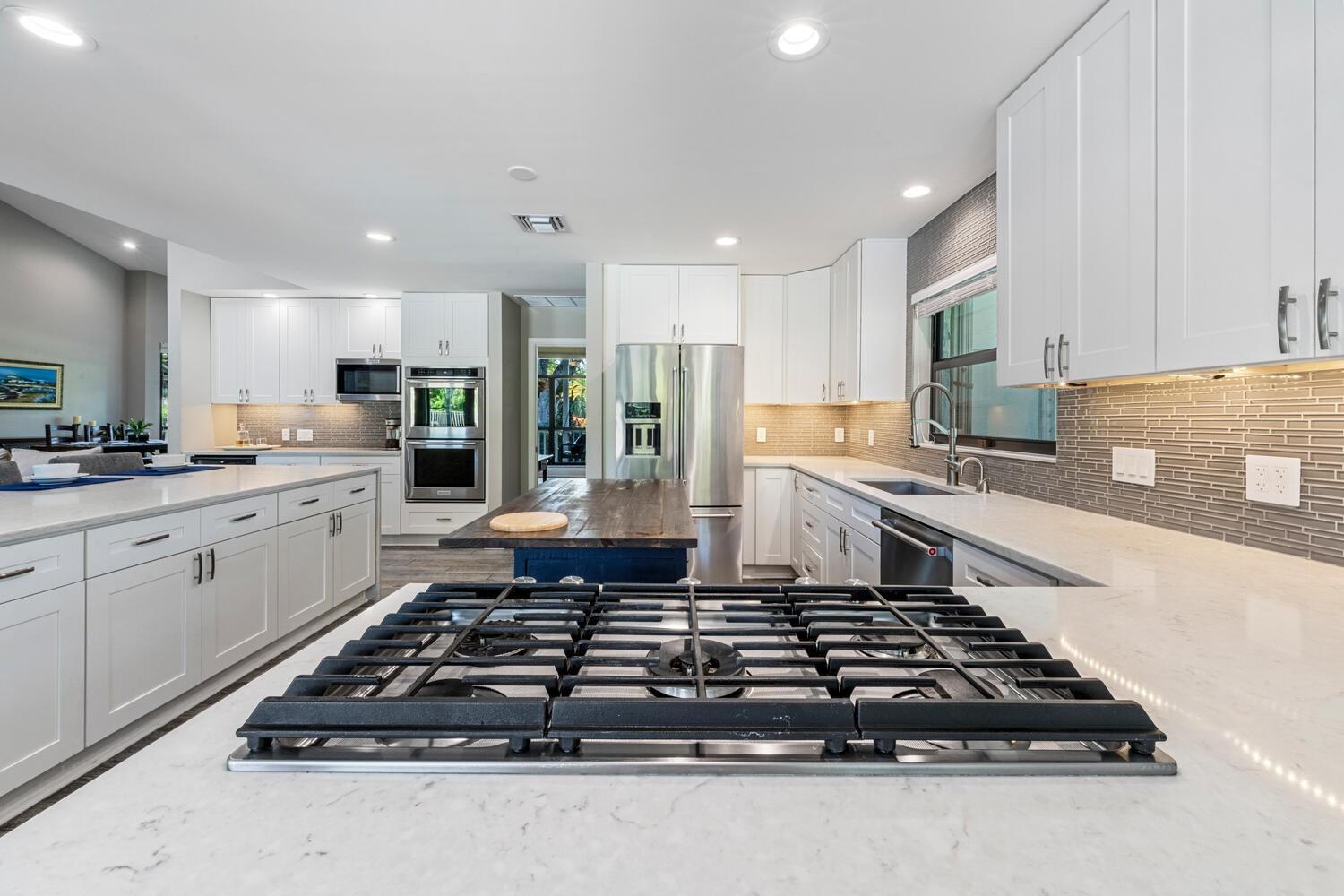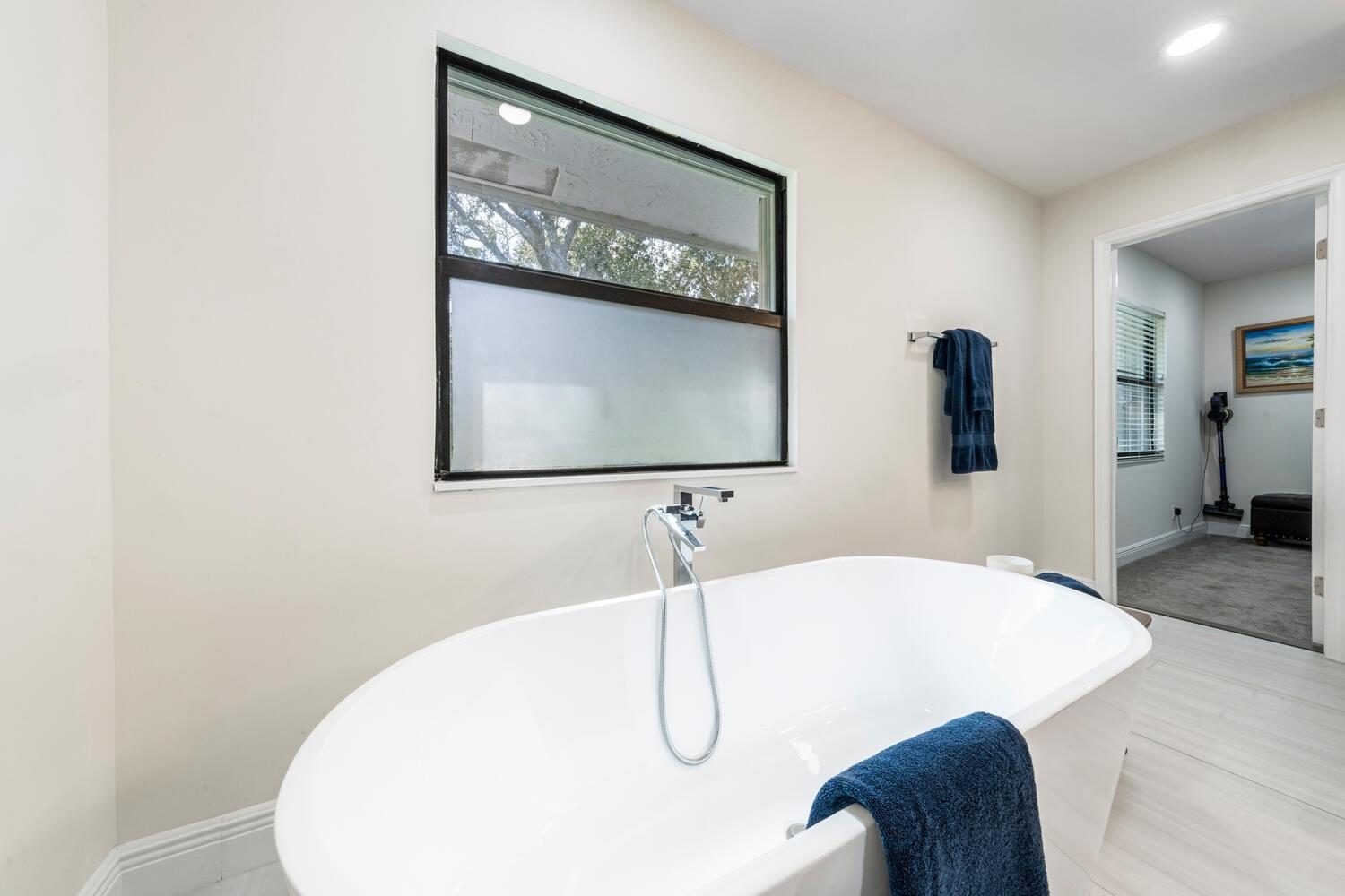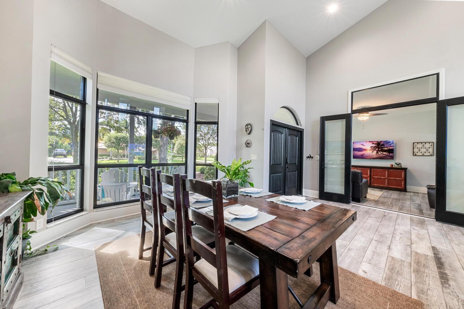 Step into STUNNING in this .79-acre estate-completely remodeled & exquisitely appointed! The charming front porch invites you into a spacious great room, featuring a floor-to-ceiling brick fireplace. Directly off the foyer is a spacious den/office. Open & light, the soaring, volume ceilings accentuate the space. Bathrooms have been recently & beautifully updated--especially the primary, w/the free-standing tub, frameless shower & double vanity. Only the lovely, primary bedroom suite is upstairs, w/his & her closets & a private balcony. The chef's kitchen boasts top notch appliances, including a gas cooktop, gorgeous, white cabinets & quartz countertop. A large, covered patio overlooks the pool & amazing yard! Extras include 4-car garage w/AC, roof 2018 & all impact windows & doors!