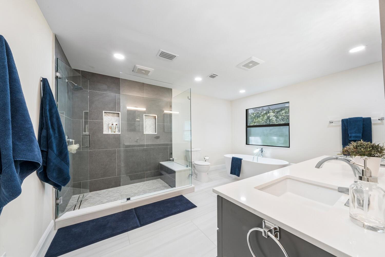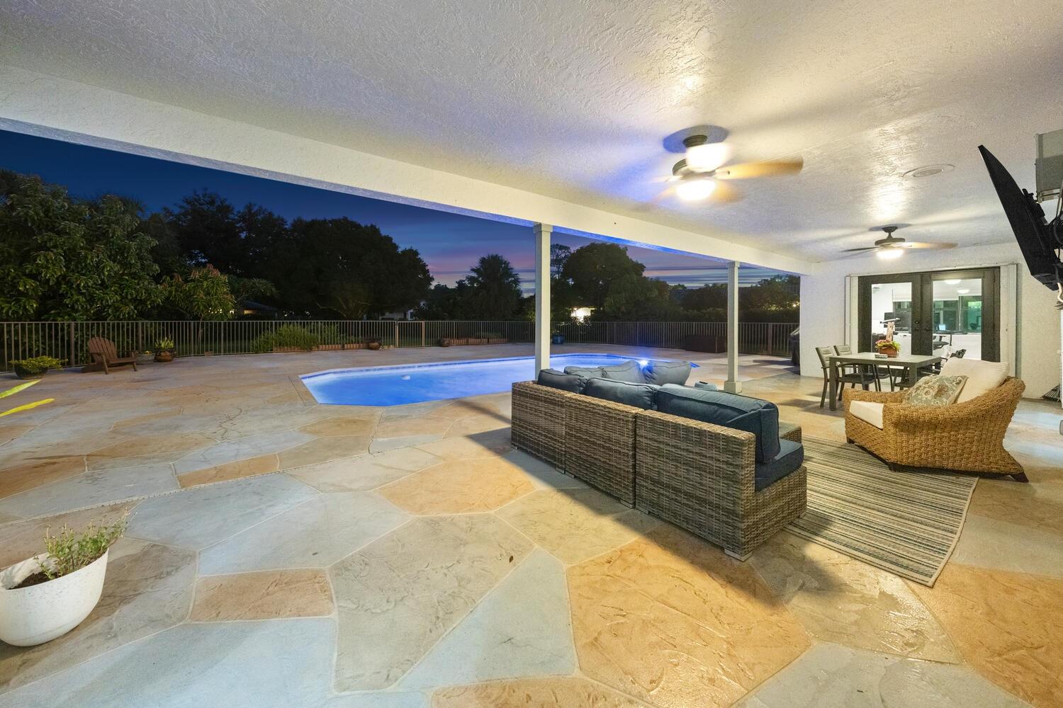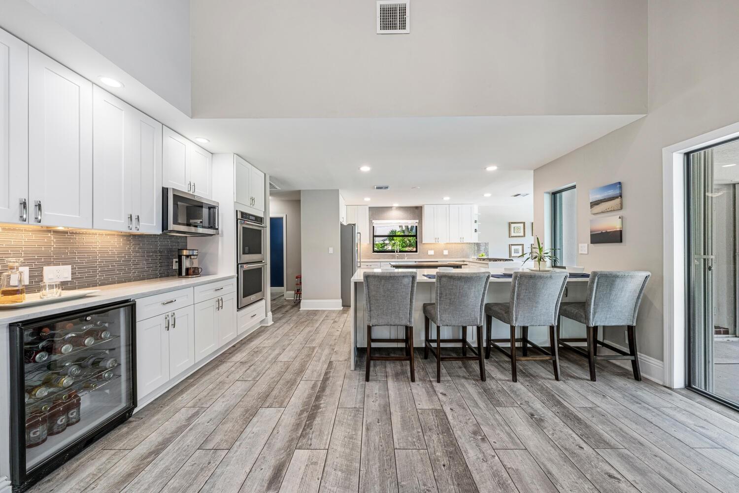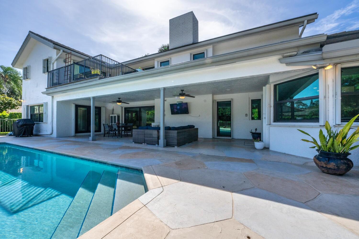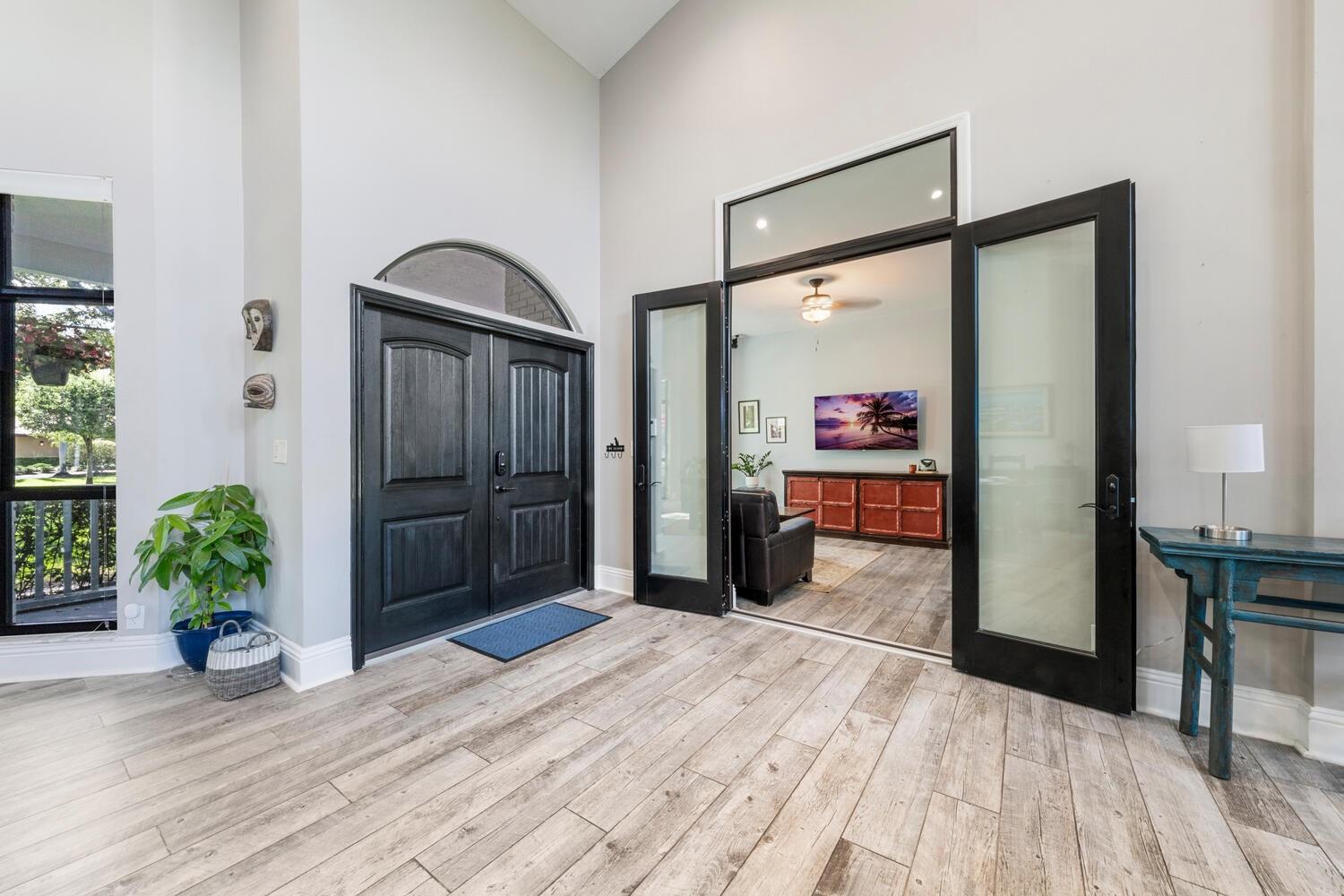 Step into STUNNING in this .79-acre estate-completely remodeled & exquisitely appointed! The charming front porch invites you into a spacious great room, featuring a floor-to-ceiling brick fireplace. Directly off the foyer is a spacious den/office. Open & light, the soaring, volume ceilings accentuate the space. Bathrooms have been recently & beautifully updated--especially the primary, w/the free-standing tub, frameless shower & double vanity. Only the lovely, primary bedroom suite is upstairs, w/his & her closets & a private balcony. The chef's kitchen boasts top notch appliances, including a gas cooktop, gorgeous, white cabinets & quartz countertop. A large, covered patio overlooks the pool & amazing yard! Extras include 4-car garage w/AC, roof 2018 & all impact windows & doors!