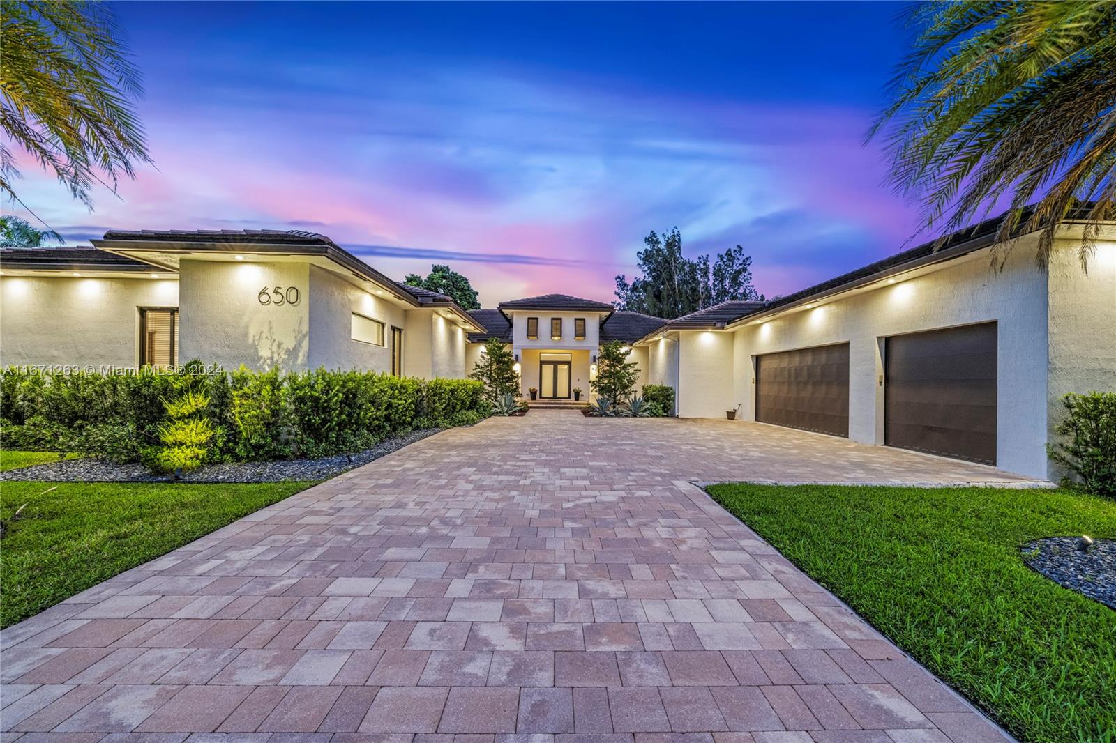 Step into modern elegance with this 2020-built, single-story luxury home, offering 5 spacious bedrooms, each with its own en-suite bathroom, plus a stylish half-bath. The open layout boasts sleek, massive porcelain floors throughout, while the chef’s kitchen features top-of-the-line appliances, perfect for culinary enthusiasts. A grand entrance welcomes you to a private oasis with meticulously designed landscaping. The expansive covered terrace, complete with a fully equipped summer kitchen, is ideal for entertaining. A 3-car garage with EV charging provides convenience, and the home’s clean, contemporary architecture creates an effortlessly stylish ambiance. This stunning property offers privacy, modern amenities, and sophisticated living at its finest. You will love this home! Walk to AH