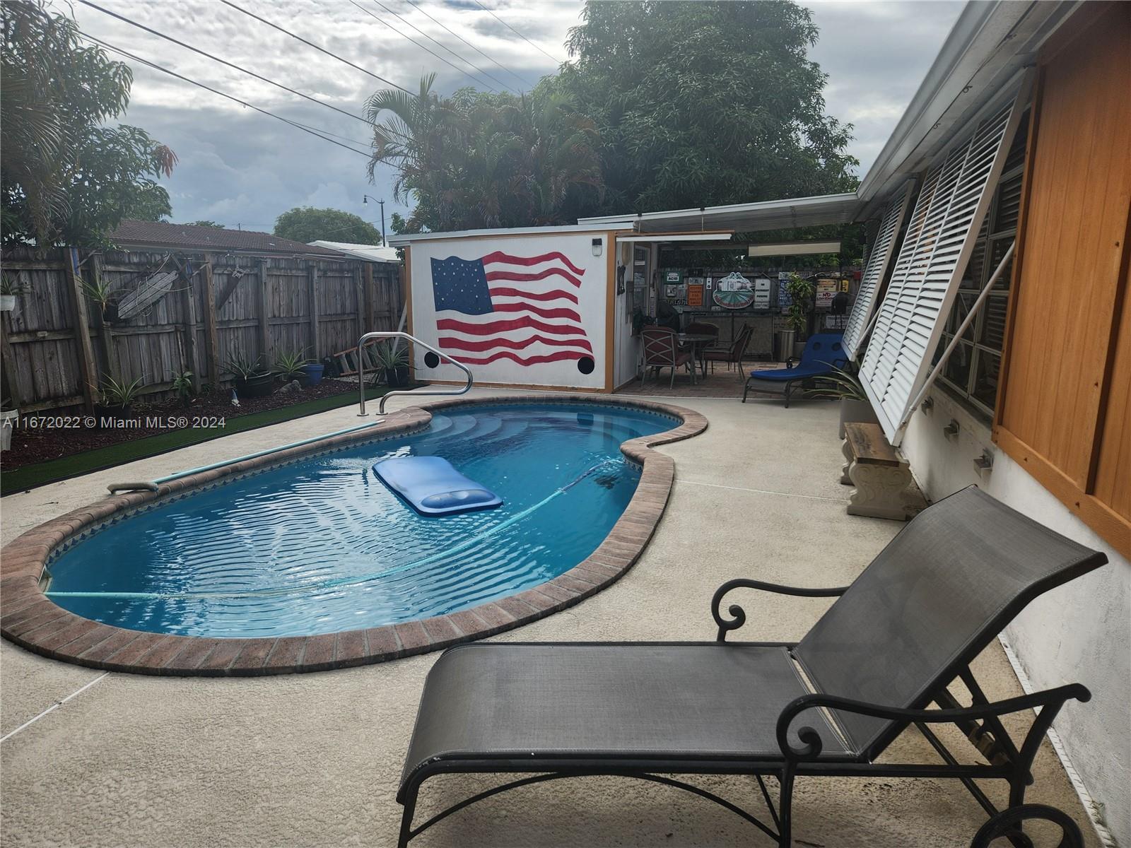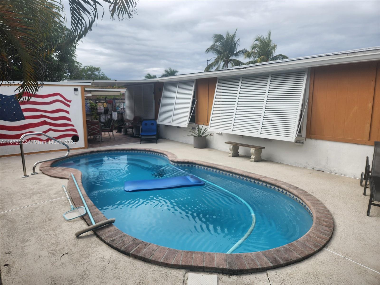 Make this 3 bed/2 bath, pool home your own. Living/dining area and separate family room with built in bar area. "cabin-like" vibe throughout home-easily removable wallpaper. Newer refrigerator and a/c unit. Hurricane protection with window awnings and impact doors. Attic storage with pull down stairs, lots of storage/closet space. Enjoy the tropical oasis of your private, well manicured, fully fenced yard. Extended patio area, relaxing pool, the attached spacious shed and covered patio. Side yard has room for a trailer/boat behind the fence/gate. Long Lasting metal roof! No HOA!! Walking distance to elementary school. Close to shopping, Hospitals, restaurants & major roads I-95. minutes to the beach