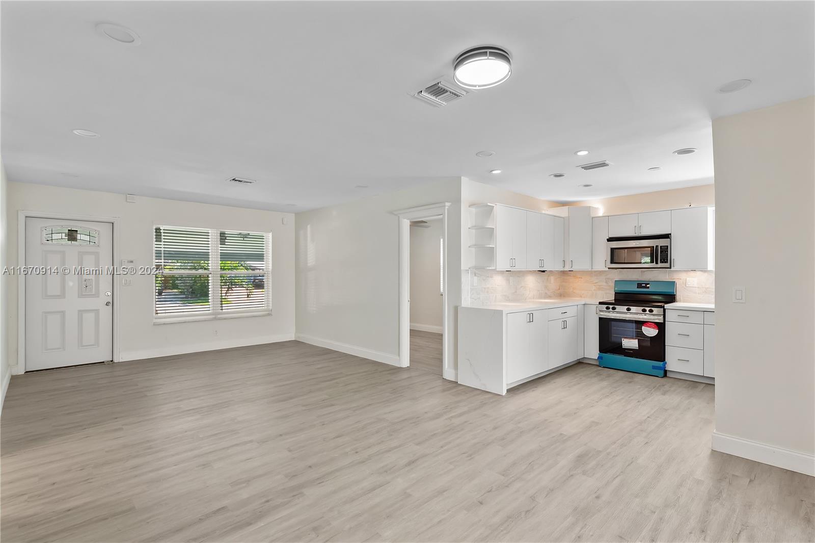 Stunning modern renovation of single-family home in a booming area of Hallandale Beach. Property includes 3 bedrooms and 2 bathrooms. Master bedroom has a walk-in closet with large attached bathroom with double vanity sink. Renovations include new roof, new hurricane windows/doors, new waterproof flooring, quartz countertops in kitchen, appliances, washer/dryer, updated bathrooms and kitchen, lighting improvements, and paved driveway. Property has open layout with designated dining area, living room, and entertainment room. Covered patio and shed in backyard along with a new PVC fence. Landscaping improvements give the property great curb appeal. This property won't last long, so come and take a look!