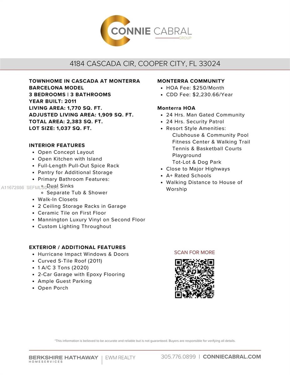 MOTIVATED SELLER ! WELCOME TO COOPER CITY'S MOST SOUGHT AFTER GATED COMMUNITY! THE 3 BEDROOMS, 3 FULL BATHS BARCELONA MODEL TOWNHOME FEATURES CERAMIC TILES ON THE FIRST FLOOR AND MANNINGTON LUXURY VINYL ON THE SECOND. ADDITIONAL FEATURES INCLUDE NICELY UPGRADED MASTER BATH WITH PORCELAIN TILE, OPEN KITCHEN WITH ISLAND AND FULL LENGTH PULL OUT SPICE RACK, NEWLY UPGRADED 3 TON AC UNIT. THE 2 CAR GARAGE HAS EPOXY FLOORING AND 2 CEILING STORAGE UNITS. THE GATED COMMUNITY OF CASCADA AT MONTERRA OFFERS RESORT STYLE AMENITIES, A+ RATED SCHOOLS, MINUTES FROM ALL MAJOR HIGHWAYS AND THE AIRPORT. PRICE IS FIRM.