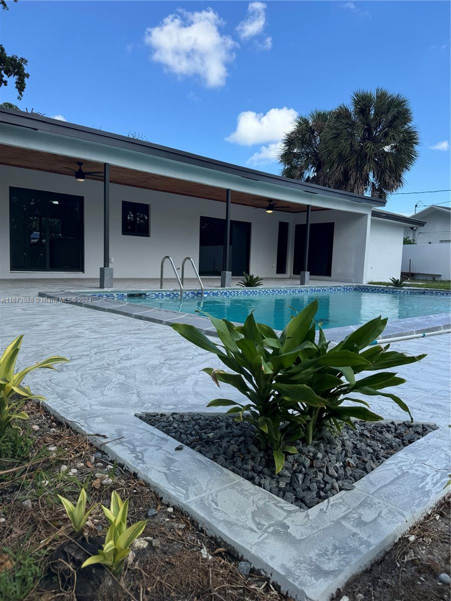Stunning corner pool home, 2 bedrooms, 2 bathrooms, and a 1-car garage, which can easily convert into an additional room. Offering 1,687 sq. ft. of living space (1,530 under AC + 158 sqf of covered Patio with new Flat roof) the layout is perfect and comfortable for living and entertaining. Kitchen is equipped with new stainless steel appliances, and the expansive 10,666 sq. ft. backyard provides ample space for outdoor enjoyment. New Impact Windows and Doors. No HOA and all ages welcome. Located in a peaceful neighborhood, steps from a community park, and close to shopping and highways.