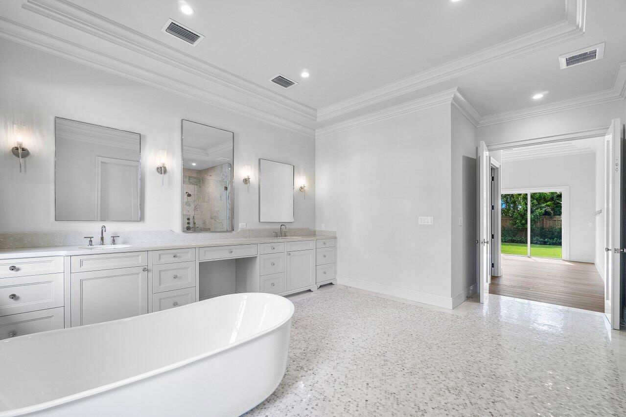 Introducing your dream residence: custom built 4 bedroom, 4.5 bath home nestled on a tree lined street East of Olive and only 8 home sites from the Intracoastal Waterway in the highly desirable Soso district. Crafted with meticulous attention to detail, this dream oasis boasts high end finishes and luxurious touches throughout. Step into the heart of the home, where you will be enamored with the custom kitchen cabinetry, state of the art Monogram appliances, and ample space for entertaining. Ensure your favorite vintages are perfectly chilled in the temperature controlled wine fridge. The spacious living areas are adorned with wood floors and custom millwork bringing warmth and elegance to the space.