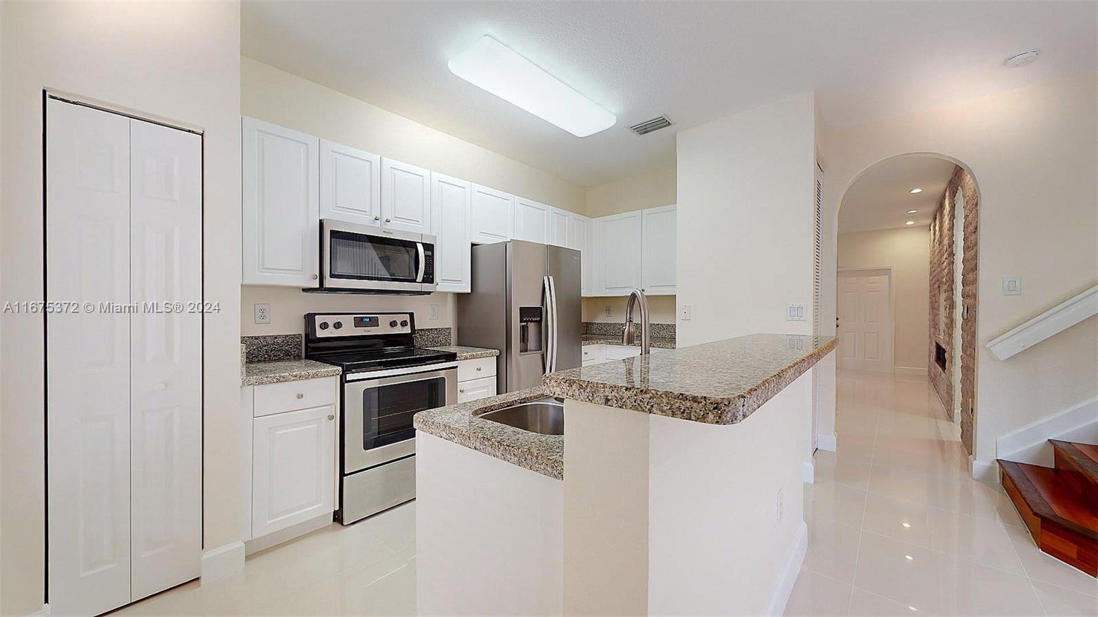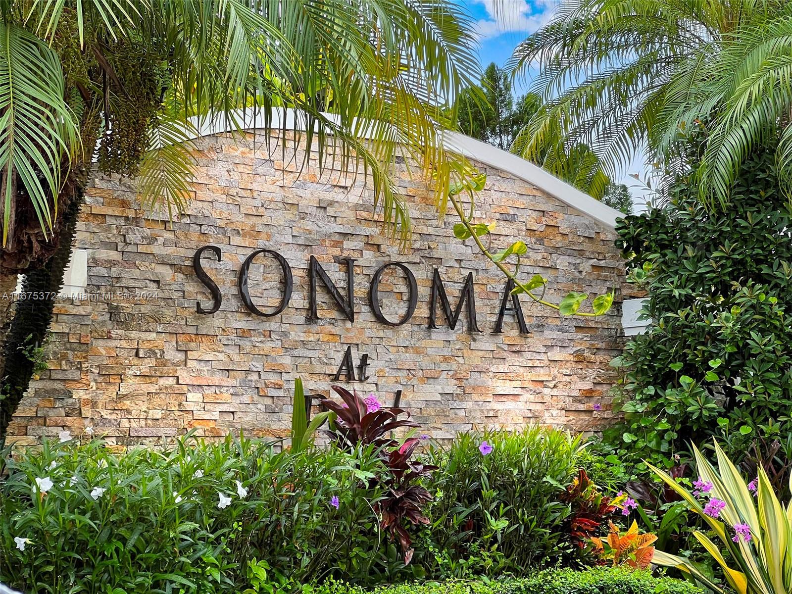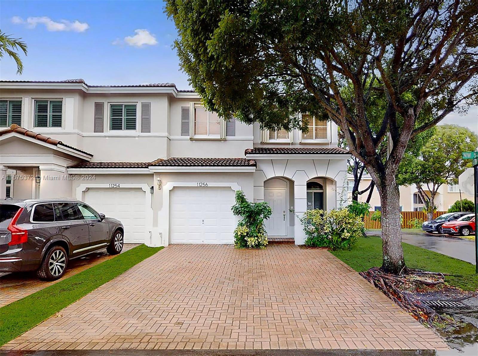 Welcome to the gated community of Sonoma at Doral! Beautifully remodeled corner townhome features 3 bed,2.5 baths, washer & dryer, accordion shutters, and 1-car garage. Living room features a beautiful stone wall, adding a touch of elegance to the living area. Family room and open kitchen are filled with abundant natural light, the kitchen is equipped with stainless steel appliances, new refrigerator & granite countertops. Recently installed ceramic flooring downstairs. Upstairs, you will find elegant Brazilian Cherry flooring, a spacious primary bedroom with a tray ceiling and a walk-in closet, and two additional bedrooms with ample closet space. The upstairs bathrooms have been recently remodeled to include stunning walk-in showers, with the primary bathroom featuring a dual sink vanity.