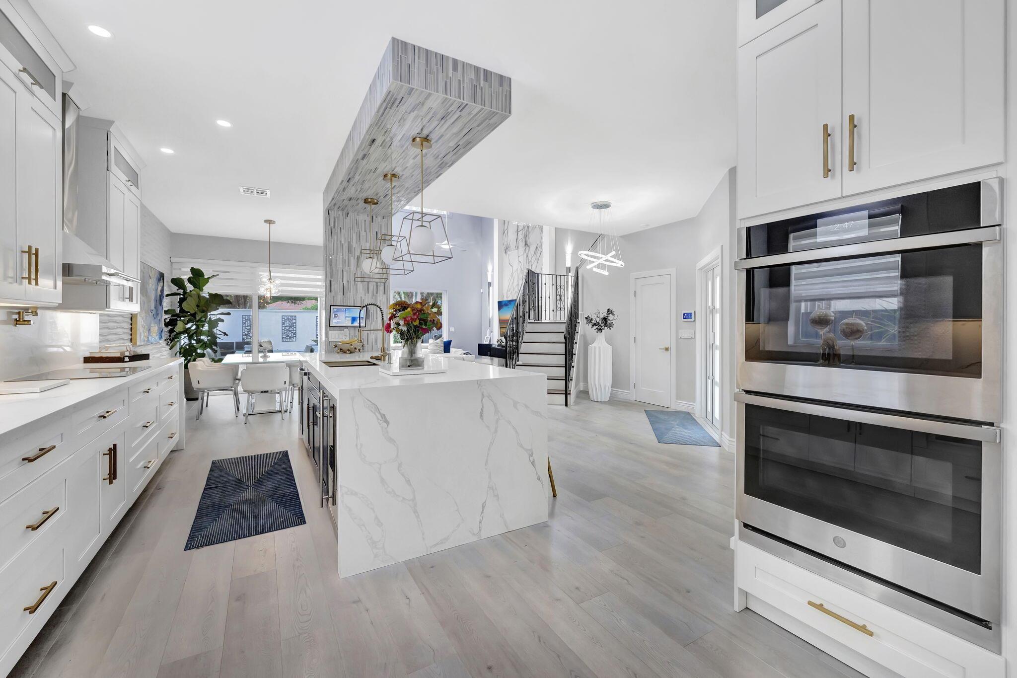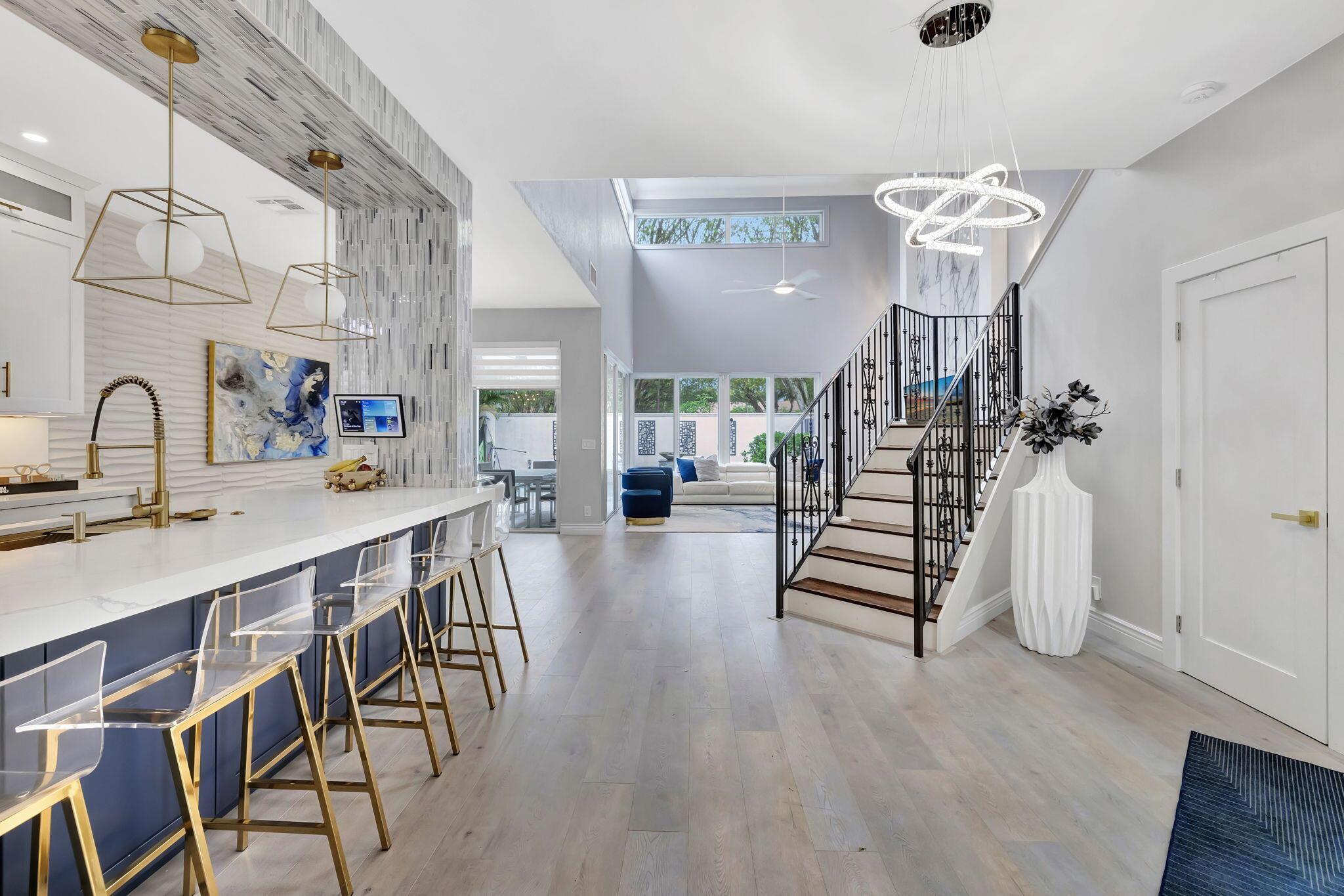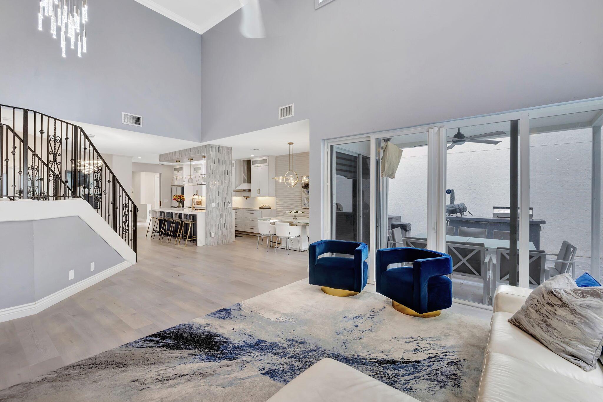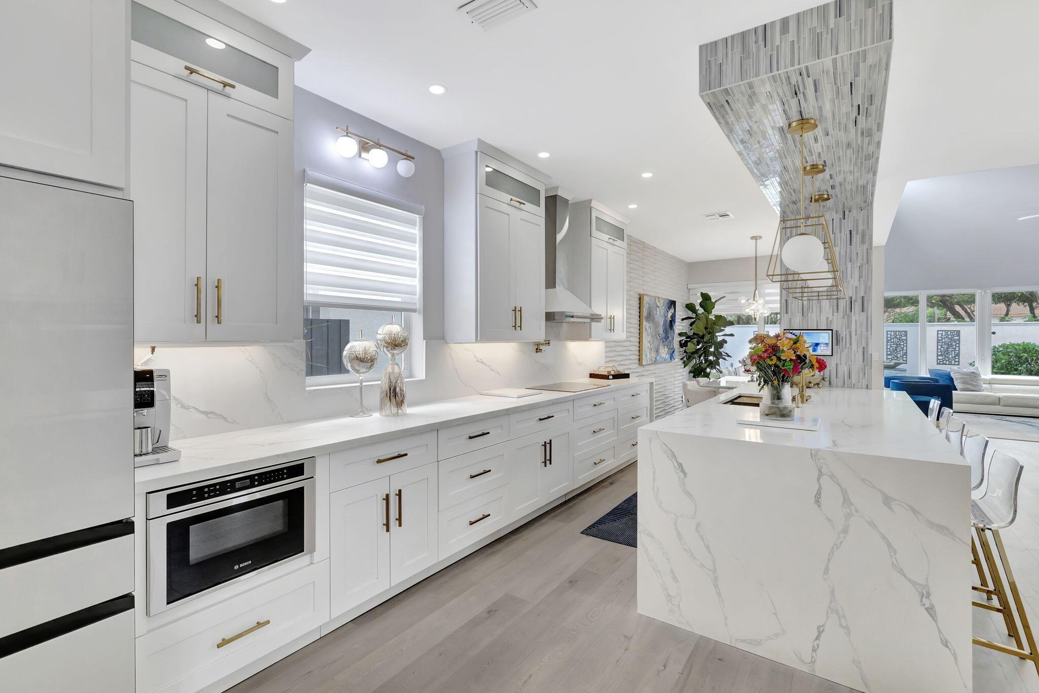Experience a 5-star resort lifestyle in the exclusive Banyans at Broken Sound. This highly sought-after community located in the heart of Boca Raton with offers top-rated schools. This private community offers an unparalleled array of amenities, two beautiful championship golf courses, 23 Har-Tru tennis courts, and 8 pickleball courts. Step into this stunning renovated home through a brand-new front door and be greeted by an open floor plan with luxury vinyl flooring, volume ceilings, and a striking feature wall of tile. The expansive windows bathe the home in natural light, seamlessly blending the living spaces. The gourmet kitchen, embellished with designer appliances, quartz countertops, and a remarkable oversized island, is perfect for entertaining.