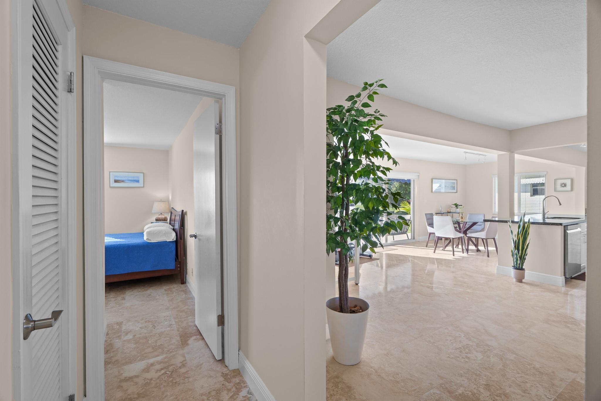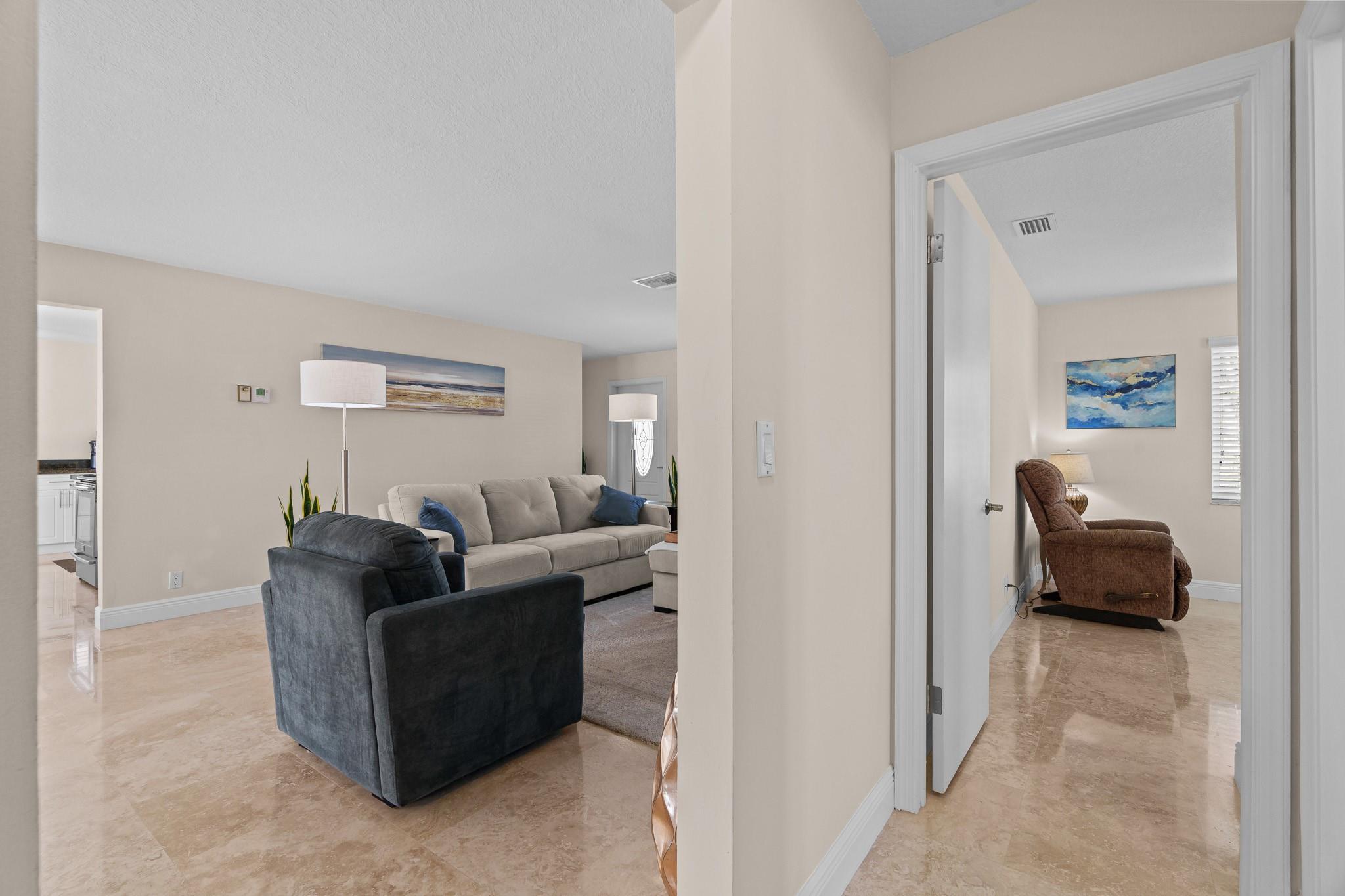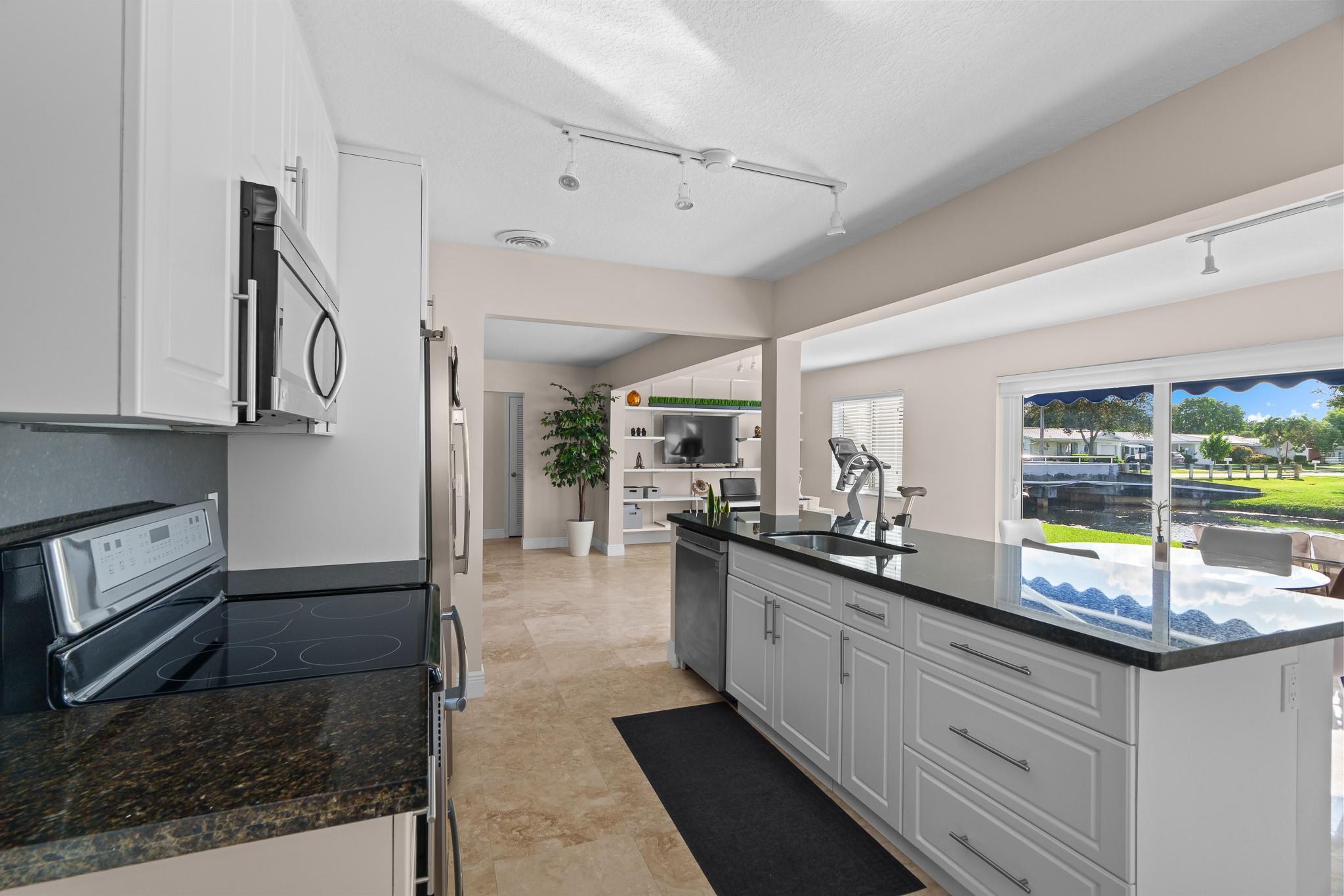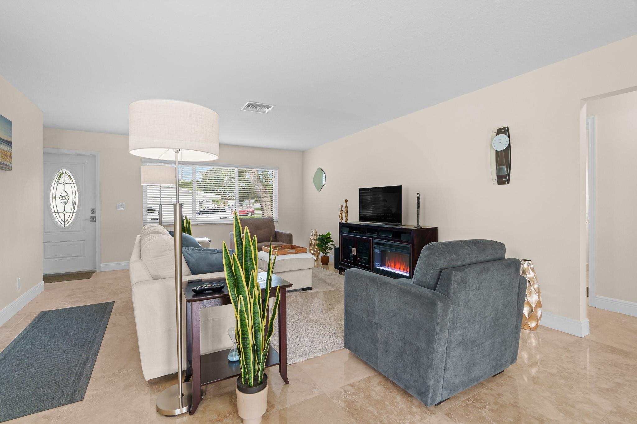 Lauderdale West, prestigious 2/2 waterfront home w/garage. 55+ active community. All impact windows/doors, tile roof 2022, impeccable home w/hi-end Travertine flooring through-out, open kitchen with granite counter tops, double wide concrete driveway, front/rear patios, luxurious home that is extremely well kept & move in condition. Low monthly maintenance includes Cable TV & Wi-Fi, repair/replace roof, exterior painting, swimming pools (2), active clubhouse, tennis, pool tables, ping pong, professional shows, courtesy bus at your door, social clubs, card rooms, fitness center and much more. Near to restaurants, shopping, beaches, airport, cruise ships and more. Do not miss this one!