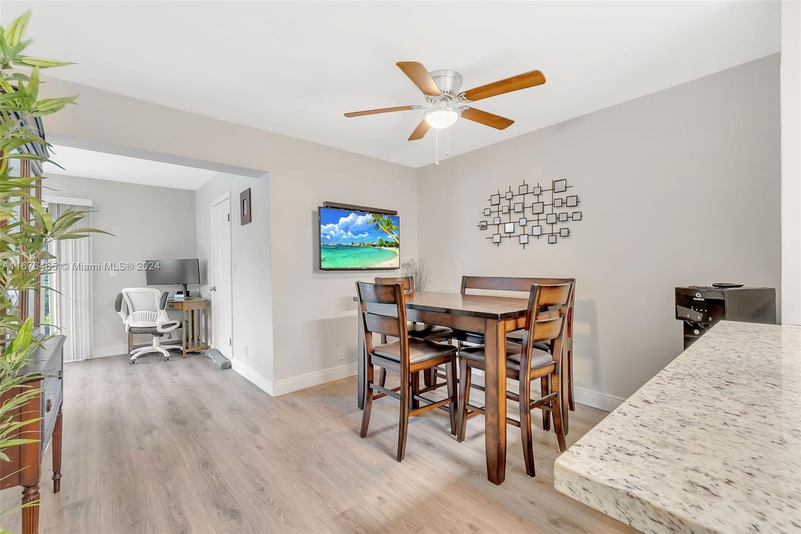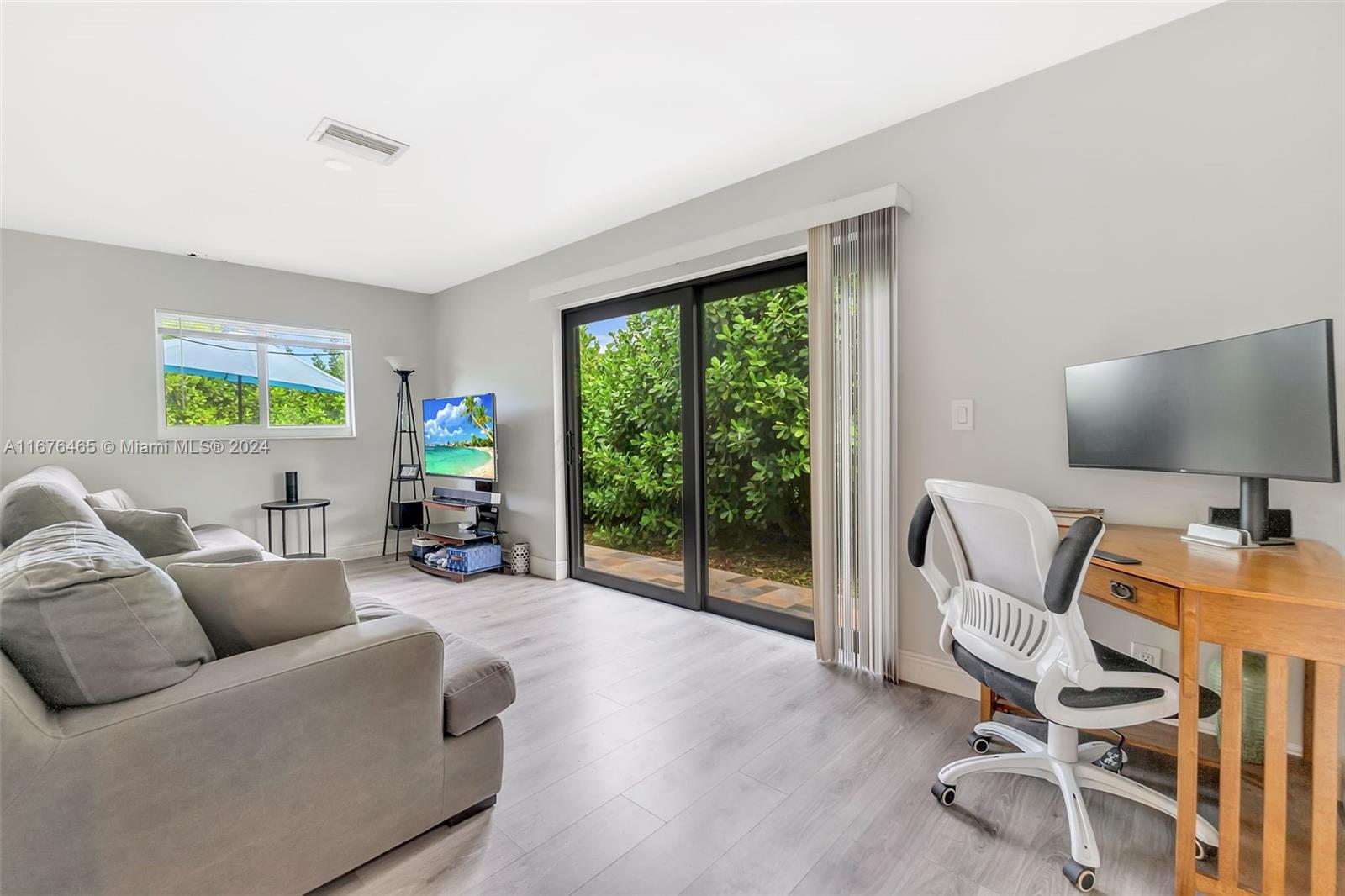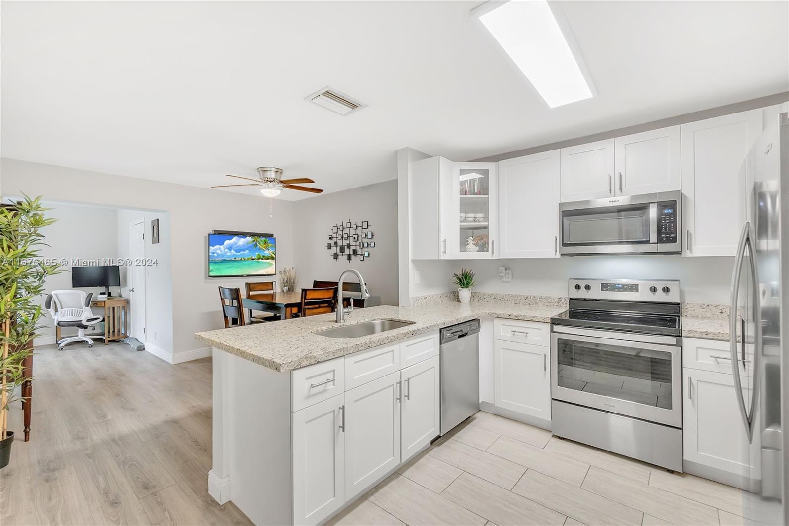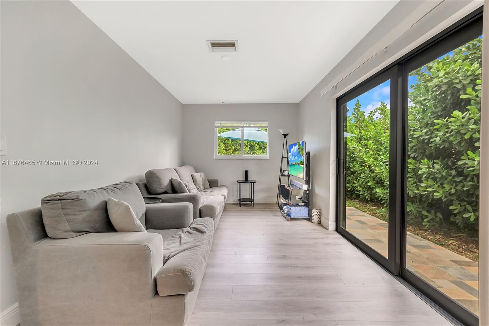 This renovated half-duplex in Coral Springs features 3 bedrooms, 2 bathrooms, and a spacious driveway for up to 4 cars, plus a lovely garden patio. Situated in a quiet cul-de-sac, the home boasts a modern kitchen with granite countertops, white cabinets with glass fronts, and stainless steel appliances. Both bathrooms are updated with granite and ceramic tile finishes; the master bath includes a walk-in shower, while the guest bath offers a tub/shower combo. A bonus room at the back provides extra space for an office, playroom, or gym. There's also a convenient laundry room. The expansive, pie-shaped backyard offers plenty of room for a pool. Ideally located near shops, restaurants, and all that Coral Springs has to offer—plus, no HOA!