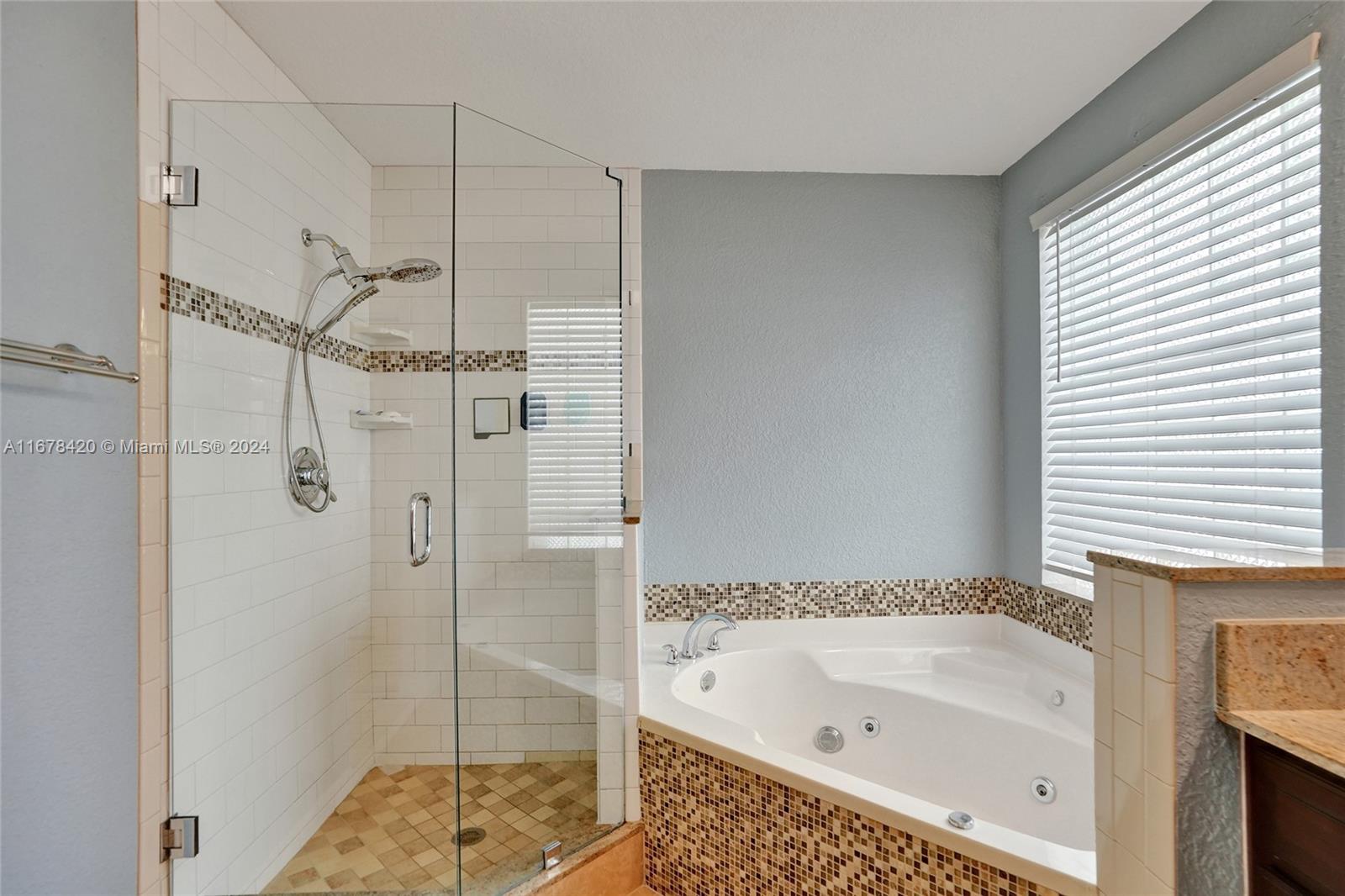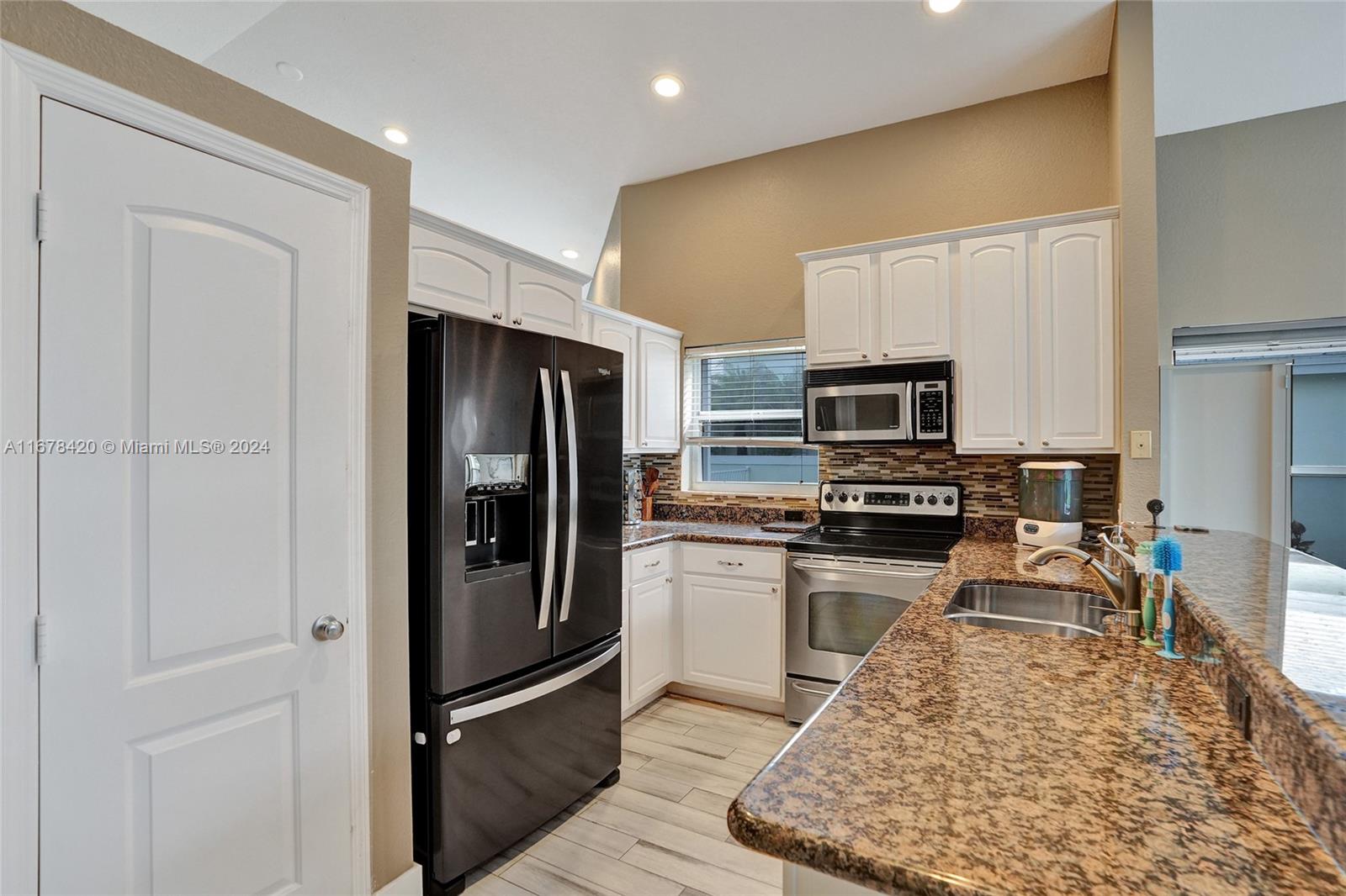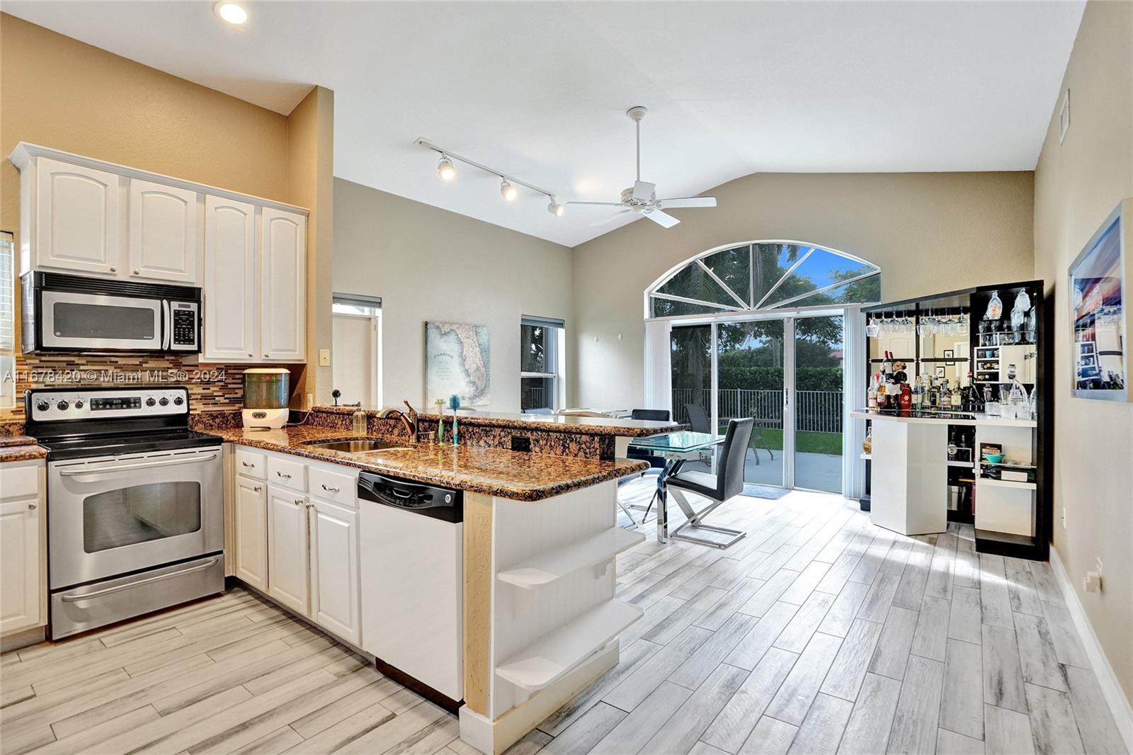 Discover this stunning single-story home in the prestigious Grand Palms, a 24/7 gated community. This impeccably maintained residence boasts a bright, open floor plan with vaulted ceilings, recessed lighting, and oversized windows that flood the space with natural light. Enjoy tile flooring throughout and a modern kitchen with sleek stainless steel appliances and granite countertops. The spacious primary suite features a walk-in closet and an ensuite with dual sinks, a soaking tub, and a separate shower. Step outside to a fenced backyard perfect for outdoor living. Additional perks include a 2-car garage, hurricane accordion shutters, and HOA coverage for lawn care, cable, ADT security, and more. Conveniently located near shopping, dining & I-75. A must-see!