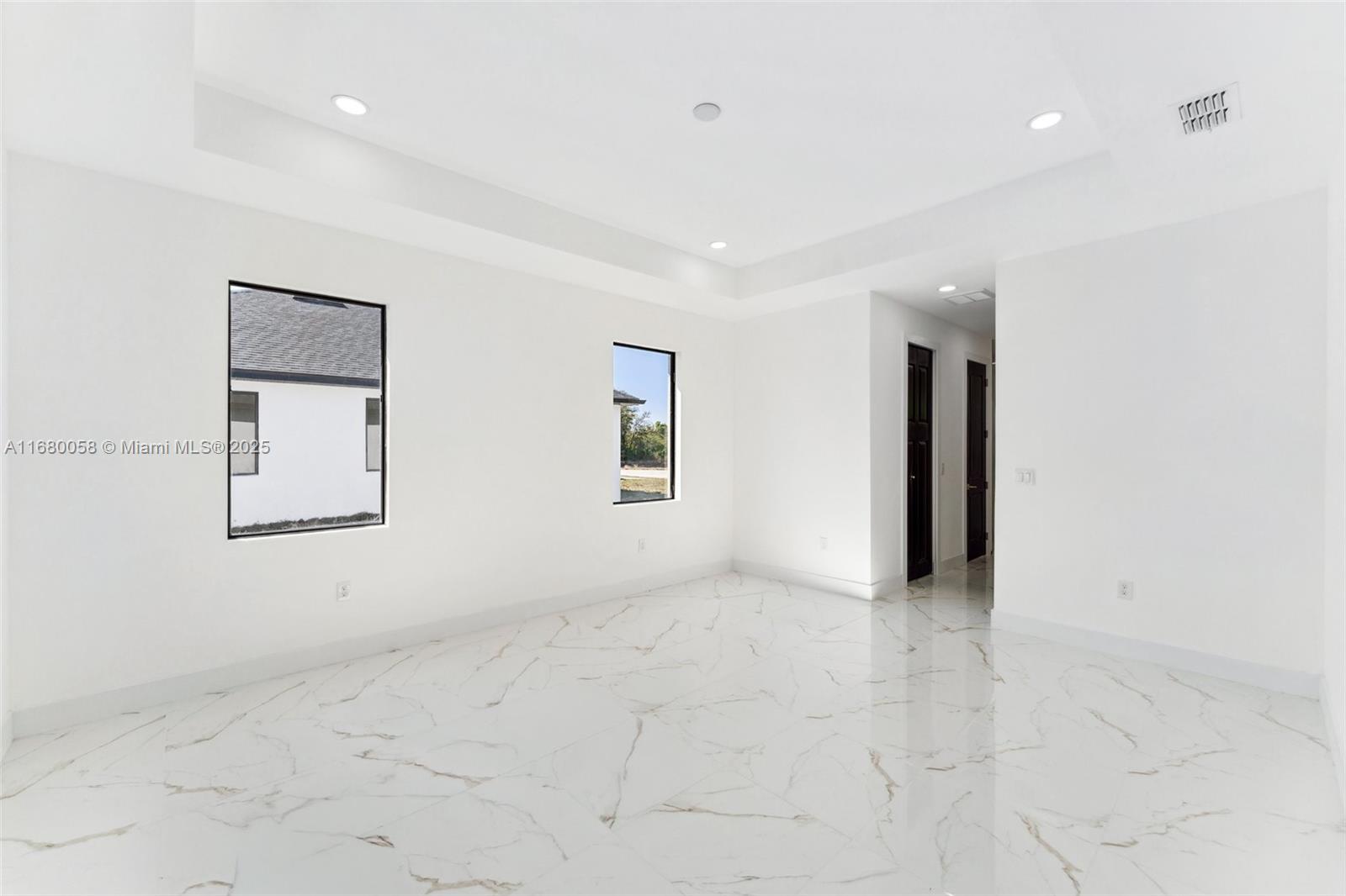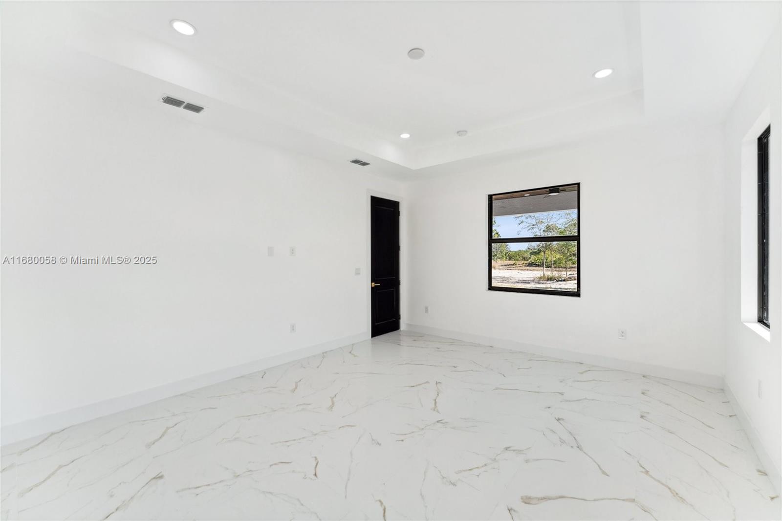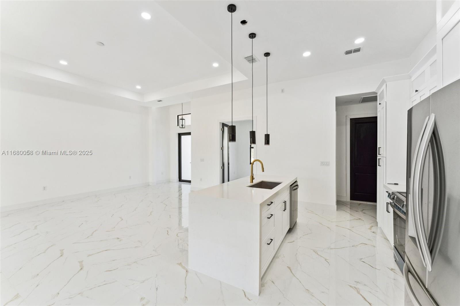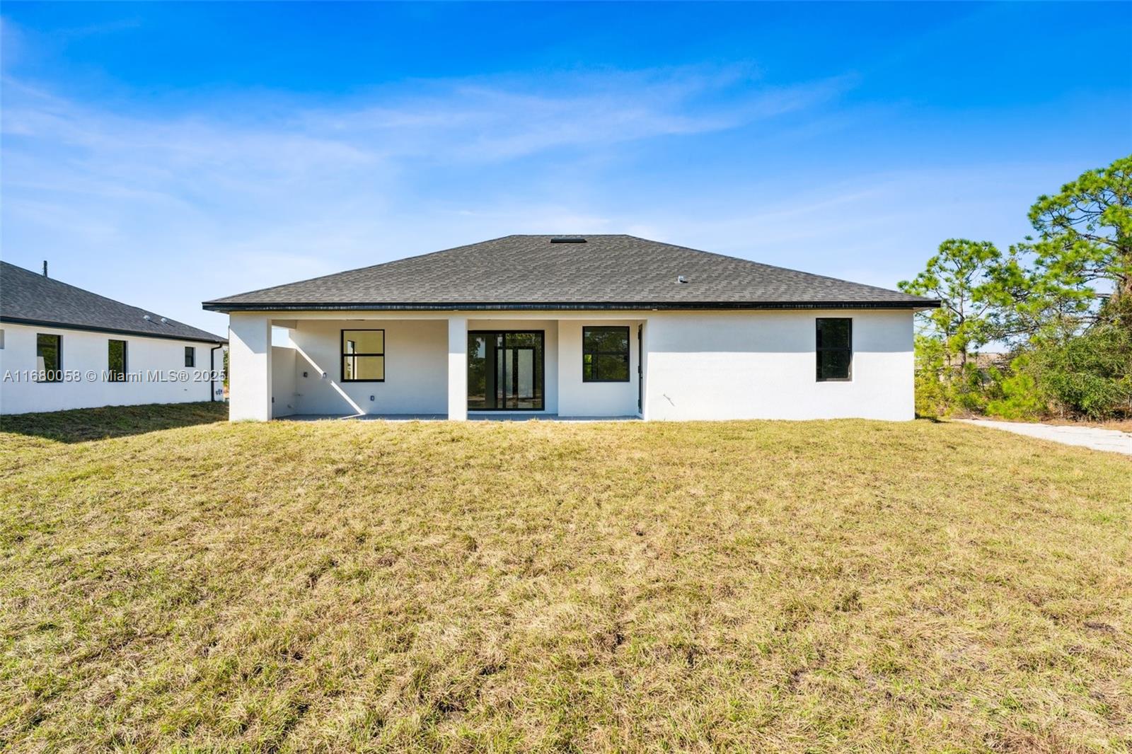 Welcome to your dream home! This stunning designer-grade single-family residence features 3 spacious bedrooms, 2 elegant bathrooms, and a versatile den, perfect for an office or playroom. As you step inside, you'll be greeted by the exquisite porcelain tile flooring and soaring 14-foot ceilings that create an open and airy ambiance. The 8-foot tall doors enhance the grandeur of this beautiful space. The heart of this home is the expansive living area, ideal for entertaining family and friends. The modern kitchen boasts a generous island, providing ample prep space and a perfect spot for casual dining. Step outside to the extended patio to its own outdoor kitchen, where you can enjoy outdoor gatherings. Safety and peace of mind are assured with impact windows throughout the home.
