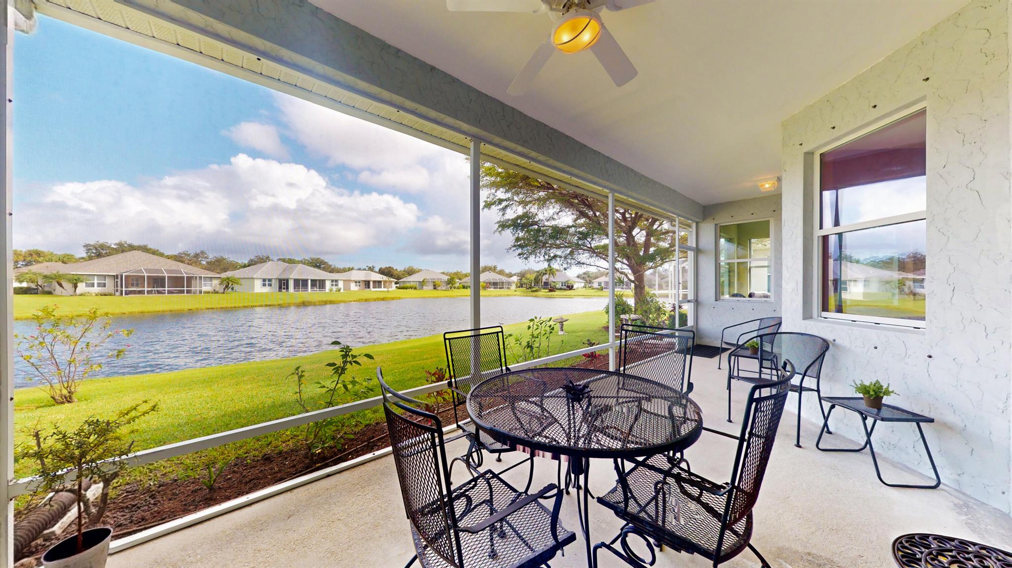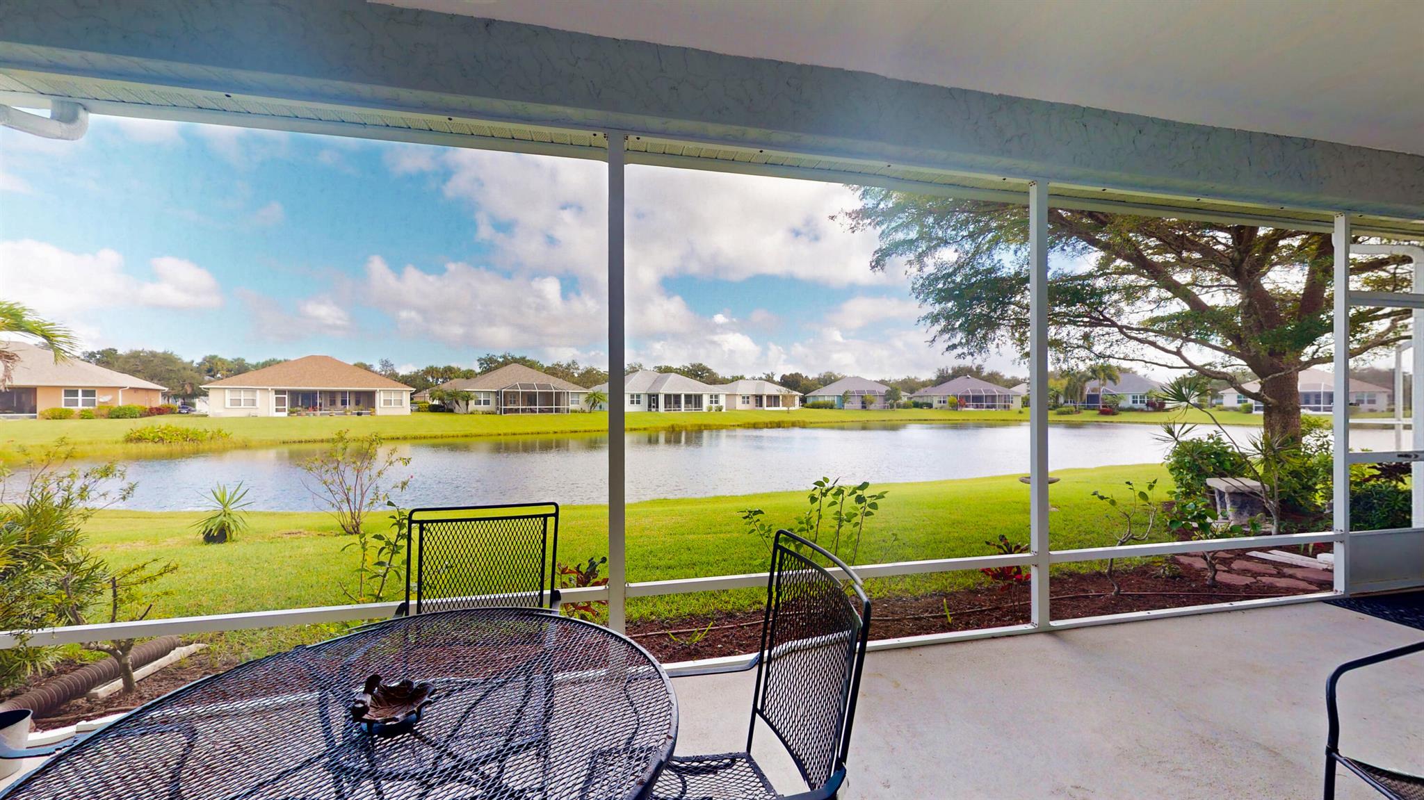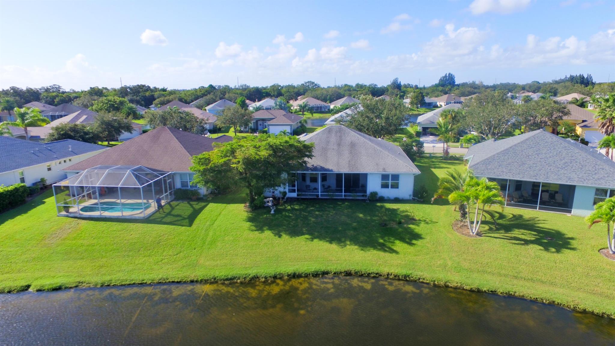 Lakefront 3 bedroom 2 bath home boasts natural gas piped to house, split floor plan with den, laundry room, eat-in kitchen and dining room. Screened lanai with panoramic lake view. Automatic irrigation system, hurricane shutters. Nice gated community with clubhouse, pool, hot tub, tennis, pickleball and basket ball court. Close to shopping and beaches. Located in a low-risk flood zone (insurance not required by lenders). Low HOA fees. Very well-maintained community.Close