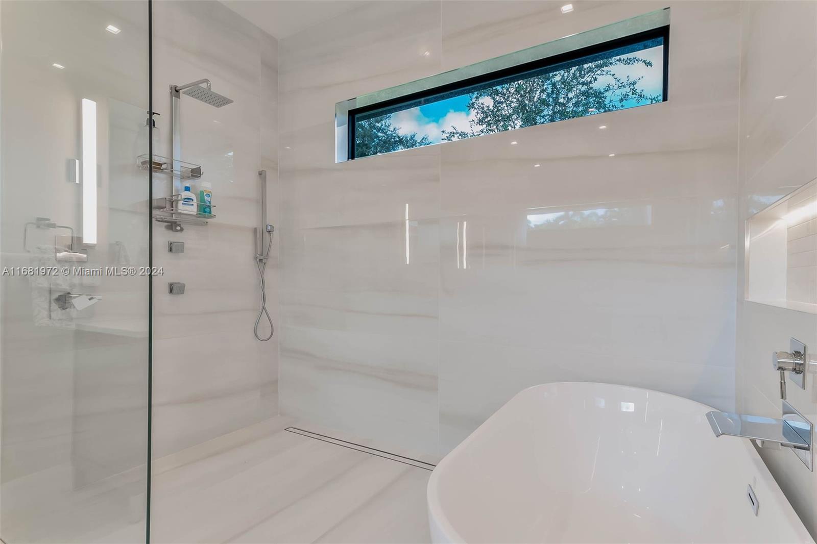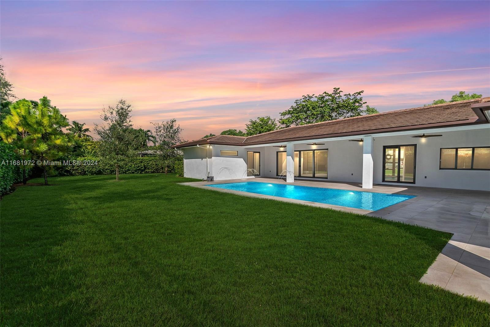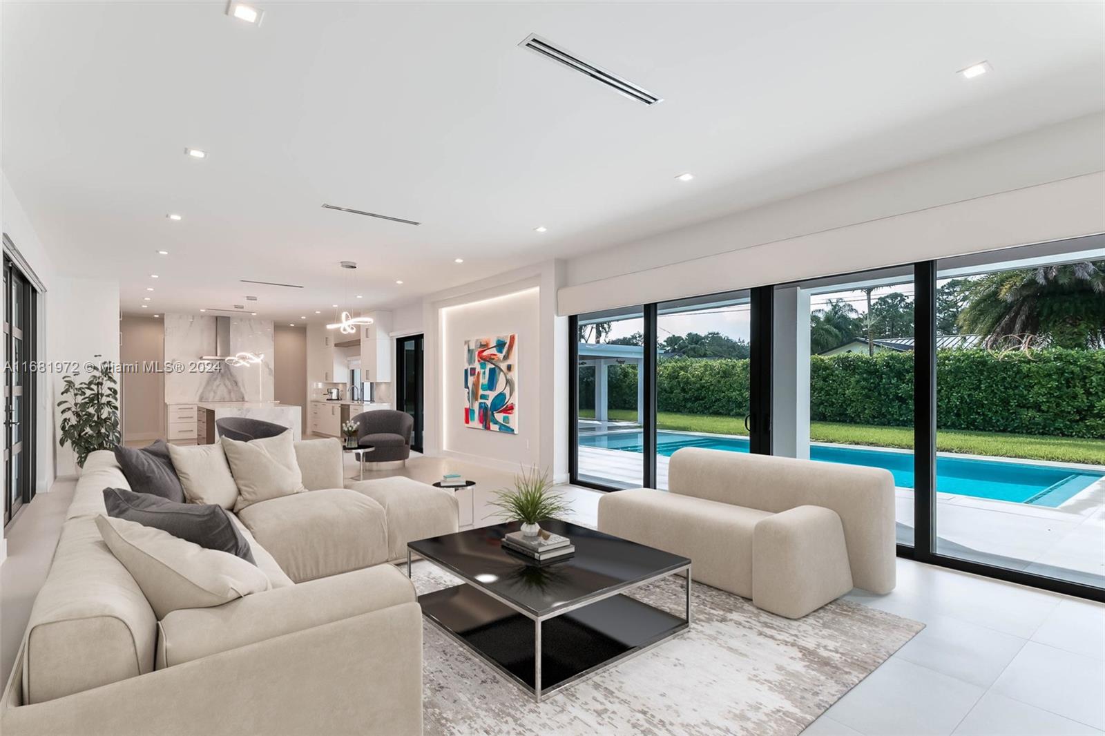 Sophisticated & modern 4 bdrm, 4.5 bath masterpiece, remodeled to perfection in 2021 on a serene half acre lot in the Village of Pinecrest. Fabulous open living area w/ 10 ft ceilings & sliding glass doors w/ views of the pool & garden. Gorgeous kitchen w/ quartzite countertops, handcrafted cabinetry, oversized island w/ seating, Thermador smart appliances. The ultimate formal dining rm perfect for a holiday gathering. Ideal split floor plan w/ en suite guest bdrms & secluded primary suite w/ stunning bath, complete w/ wet room, & walk-in closet. Impact windows/ doors, custom window treatments. Deep covered terrace, inviting saltwater pool w/ water features, summer kitchen, Bose surround sound. 2 car side entry garage w/ excellent storage. Centrally located near shops, restaurants & parks.