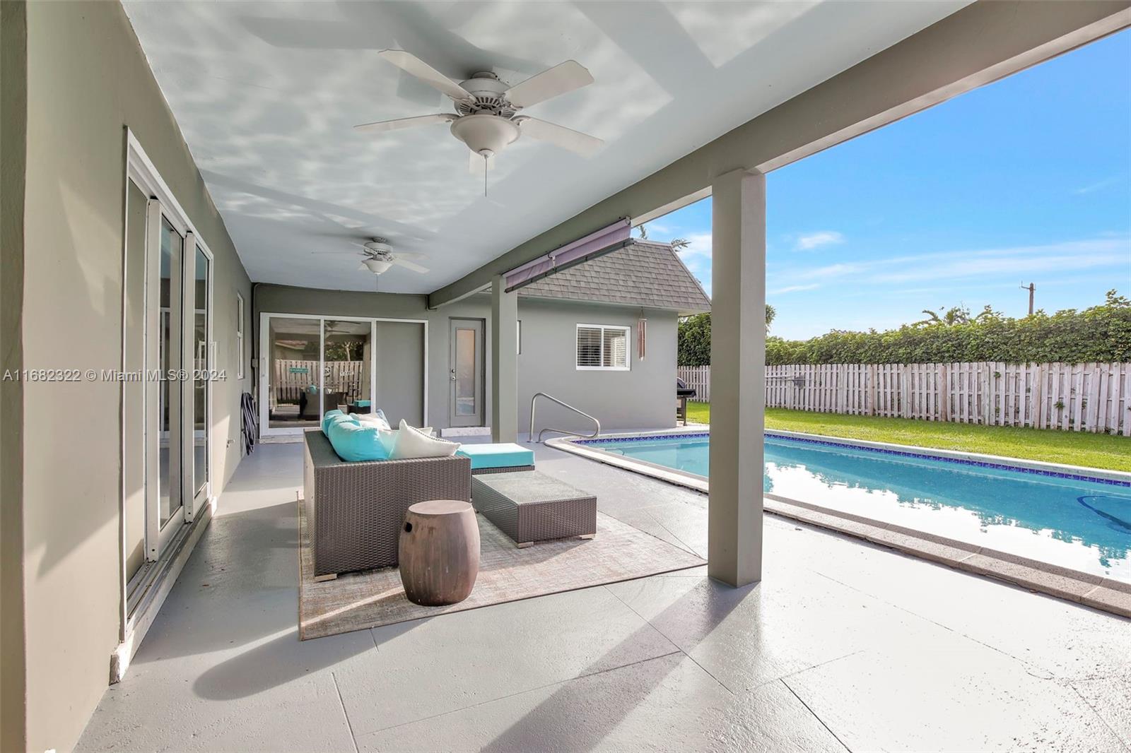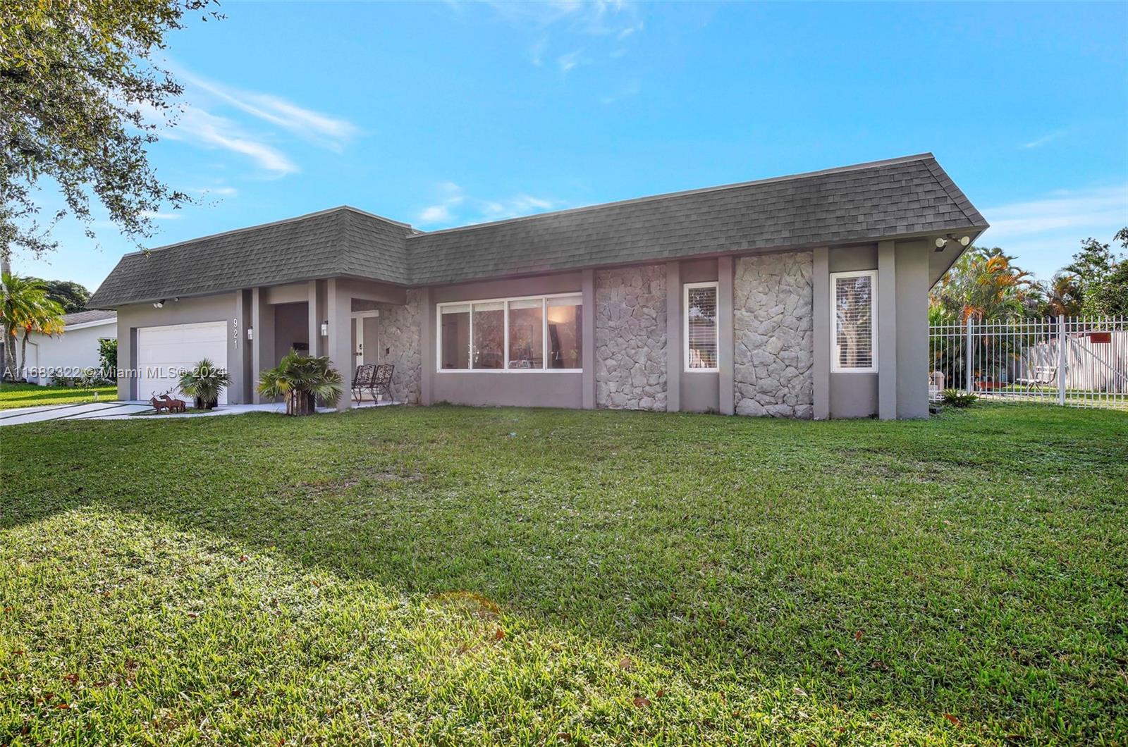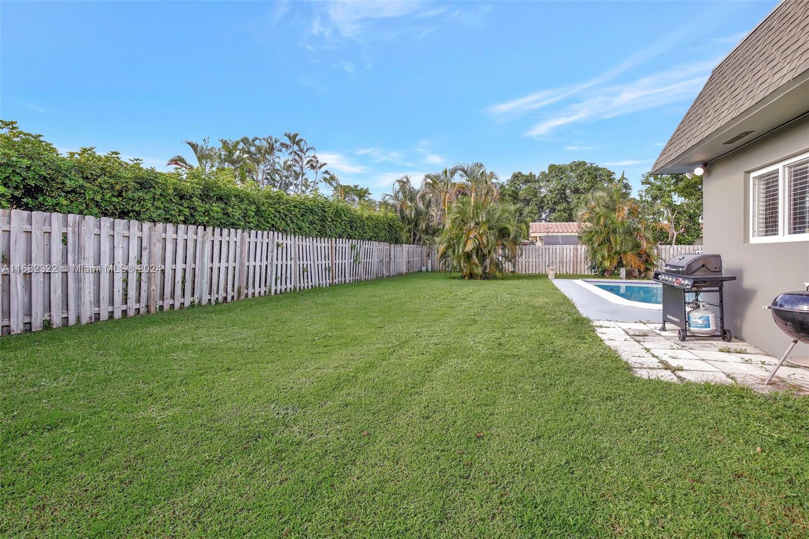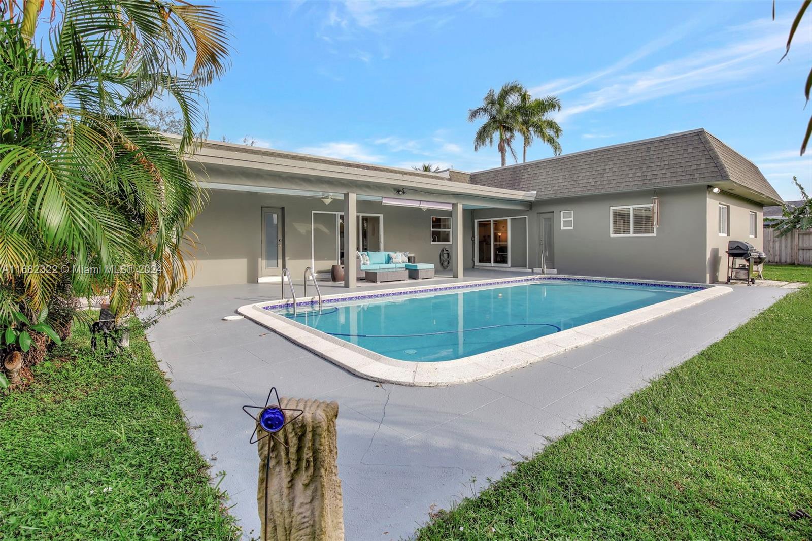 Move right into this spacious split floor plan on a quiet street with a well-manicured large private interior fenced lot. This carpet-free home is freshly painted & offers smooth flat ceilings, modern reveal baseboards,impact glass doors & windows, an updated kitchen with solid wood white cabinetry, granite counters, stainless appliances, double ovens, great storage, a pantry & nice pass-through window to a large covered patio making it great for entertaining... complete with wet bar. Enjoy Updated baths, & a cabana bath which is complete with a jetted soaking tub, PVC pipes throughout, an indoor laundry room, a great oversized private yard, & a full-size open pool. This location offers Easy access to 595, Broward Mall, Midtown Shops, The Fountains, Plantation Walk and so much more.