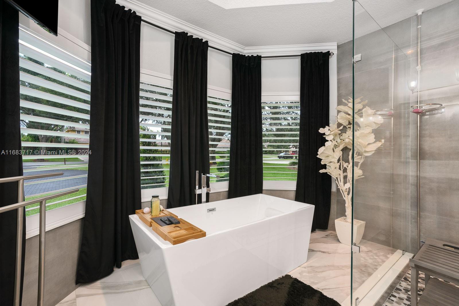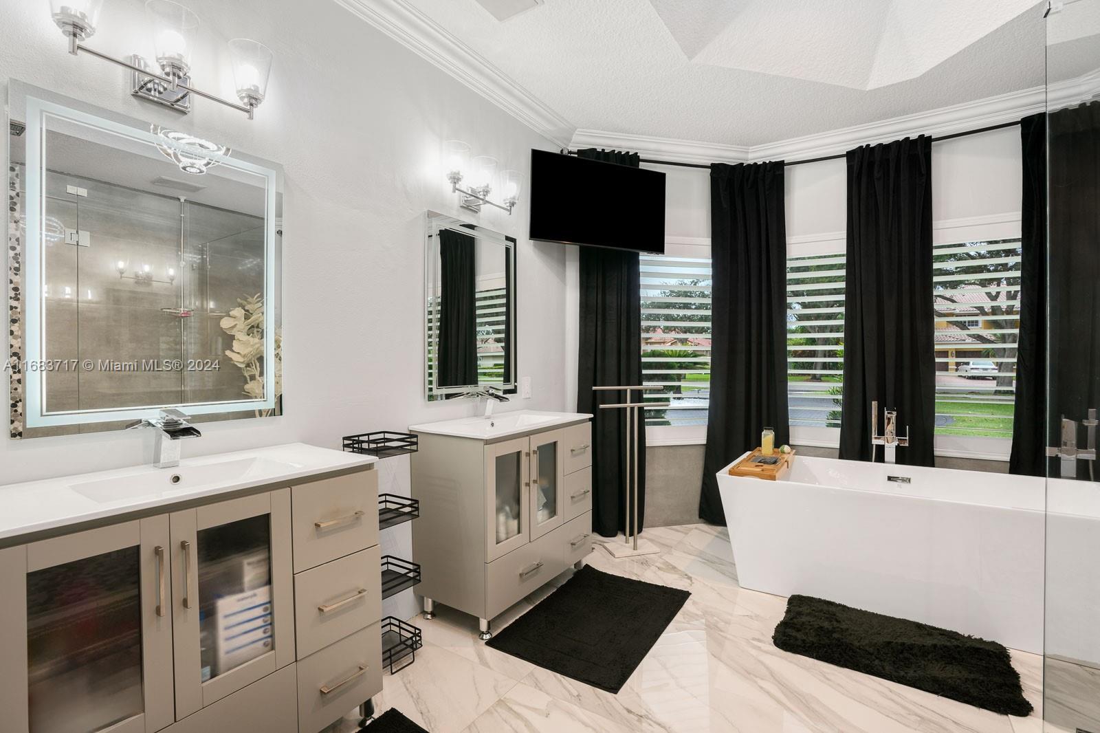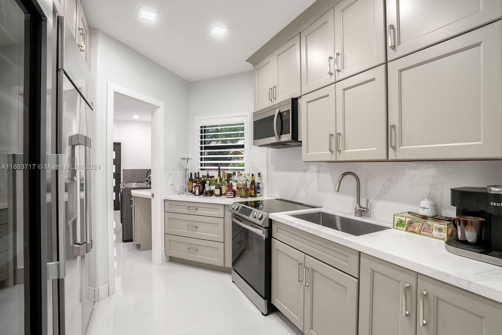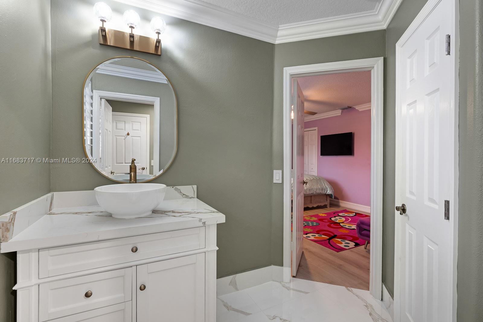 In Davie, this sprawling 7-bedroom, 4.5-bathroom estate spans 6,000+ sq. ft. with lake views, a newly remodeled saltwater pool, and outdoor kitchen. Features include high ceilings, white porcelain tile, and wood flooring on the second level. The home’s two kitchens are equipped with new appliances, while the first-floor master suite includes its own A/C and water heater. Enjoy a 10-seat theater room, generator, impact windows, and plantation shutters. Outdoors, a basketball court and mosquito system enhance the builder’s acre, perfect for luxurious entertaining and family living.
