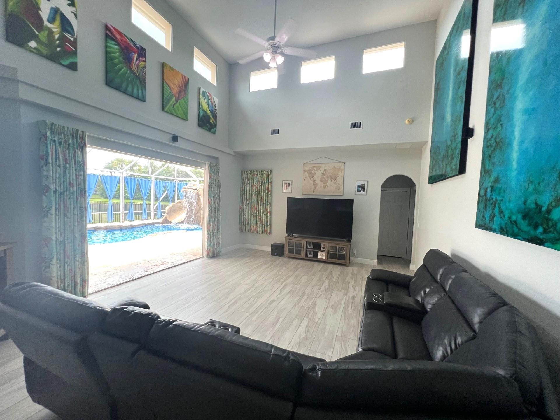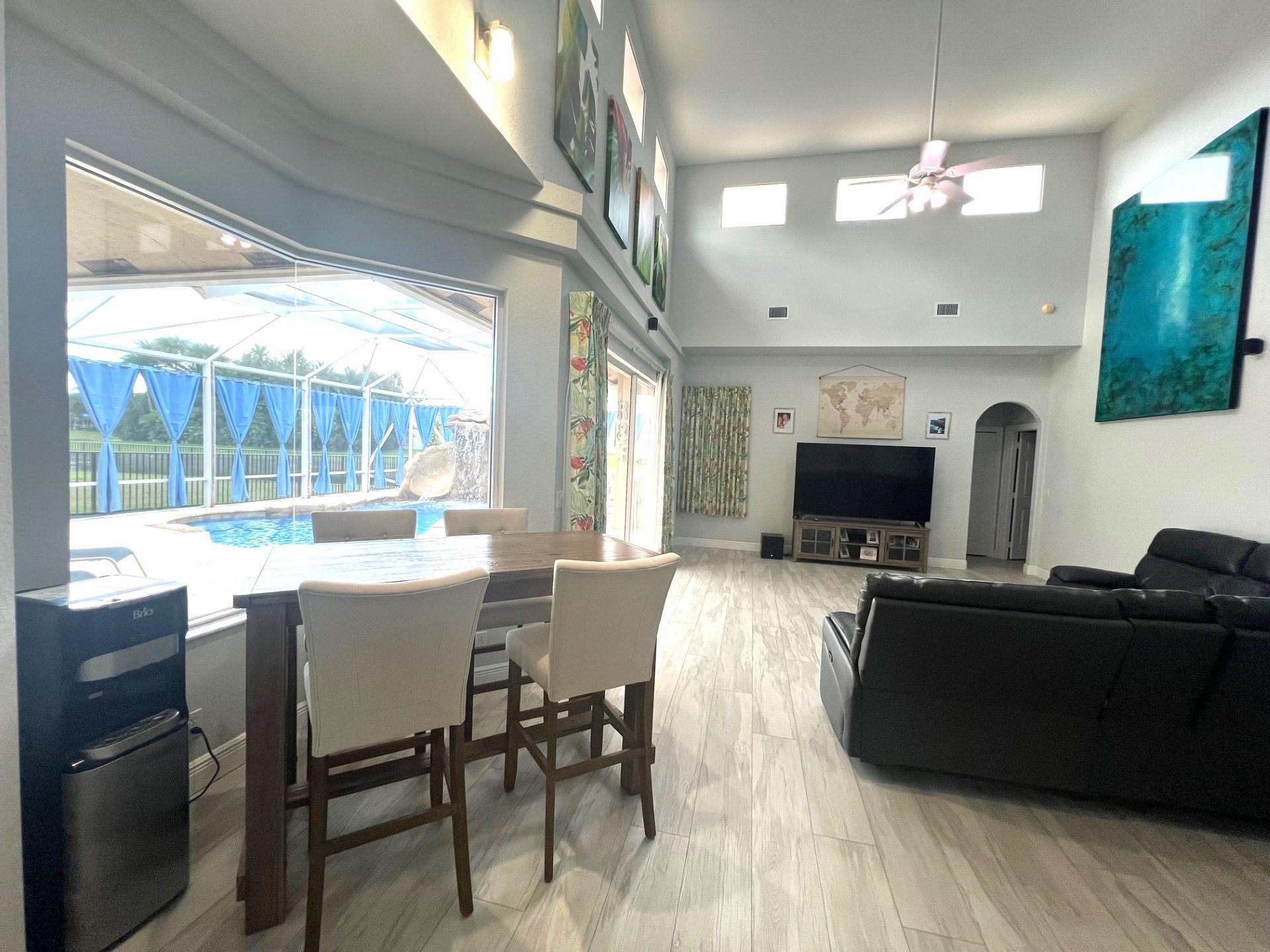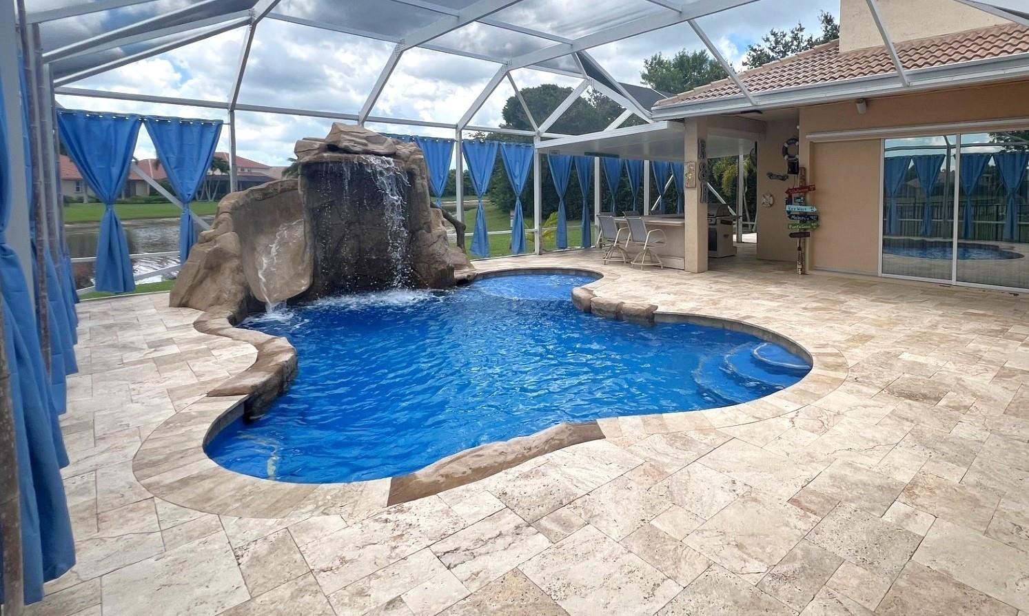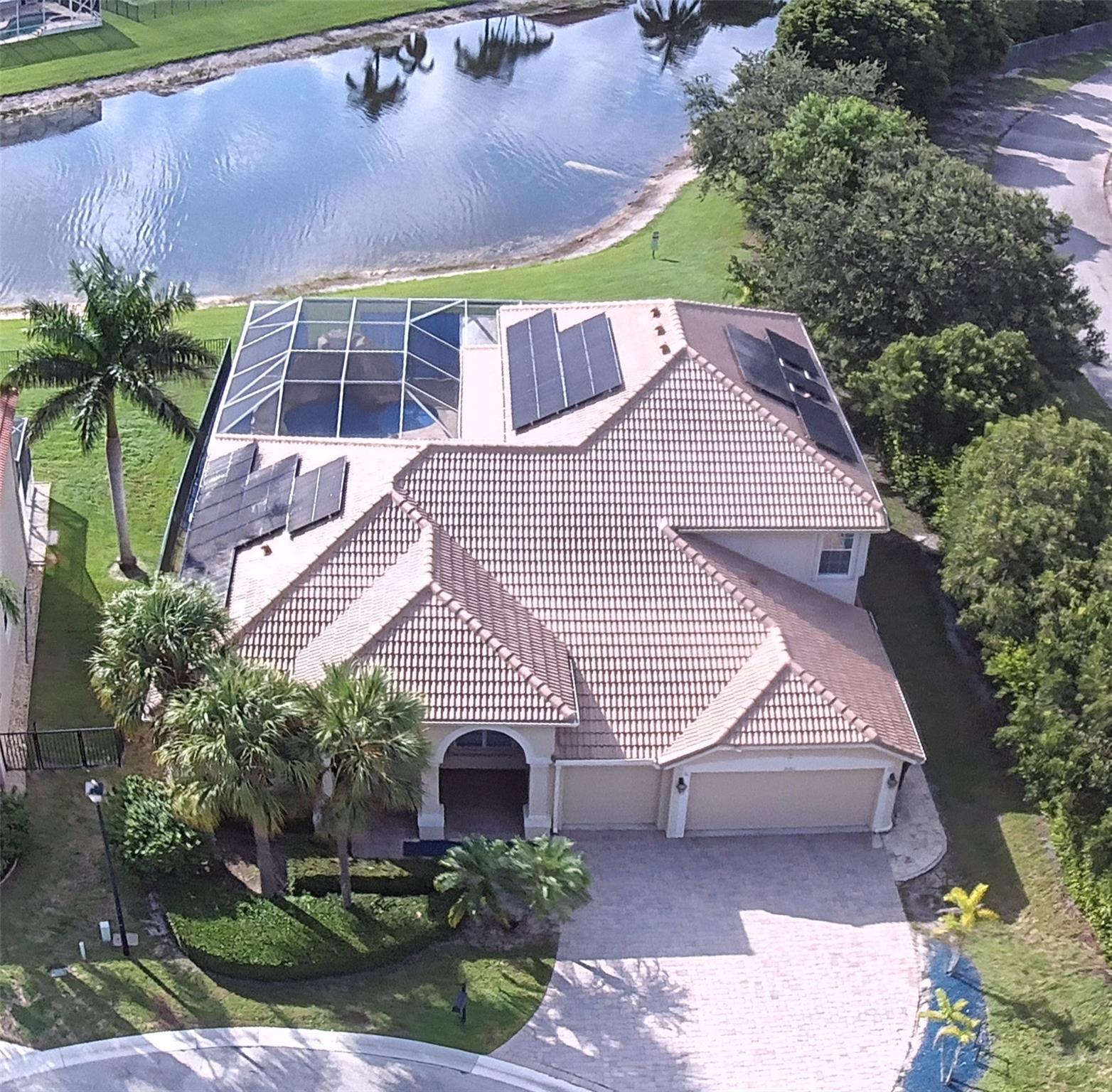 A stunning 2-story, 5-bedroom, 4-bathroom residence with a 3-car garage and spectacular screened in pool area with a waterfall, grotto, slide and outdoor kitchen. This home has over 3,400 square feet of living space and is located on a lake and quiet cul-de-sac. • SPACIOUS FAMILY ROOM: Perfect for gatherings and relaxation, the family room is the heart of this home with views of the lake, pool waterfall and sunsets. • FIRST-FLOOR PRIMARY SUITE: The primary suite offers vaulted ceilings, sliding doors leading to the pool area, dual vanities, a garden tub, and a huge walk-in shower. • UPGRADED KITCHEN: The kitchen has been recently upgraded with new appliances and countertops. • ENERGY EFFICIENT: Enjoy the benefits of whole-home solar, reducing energy bills.