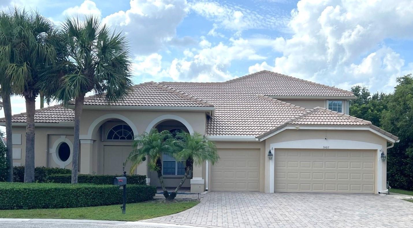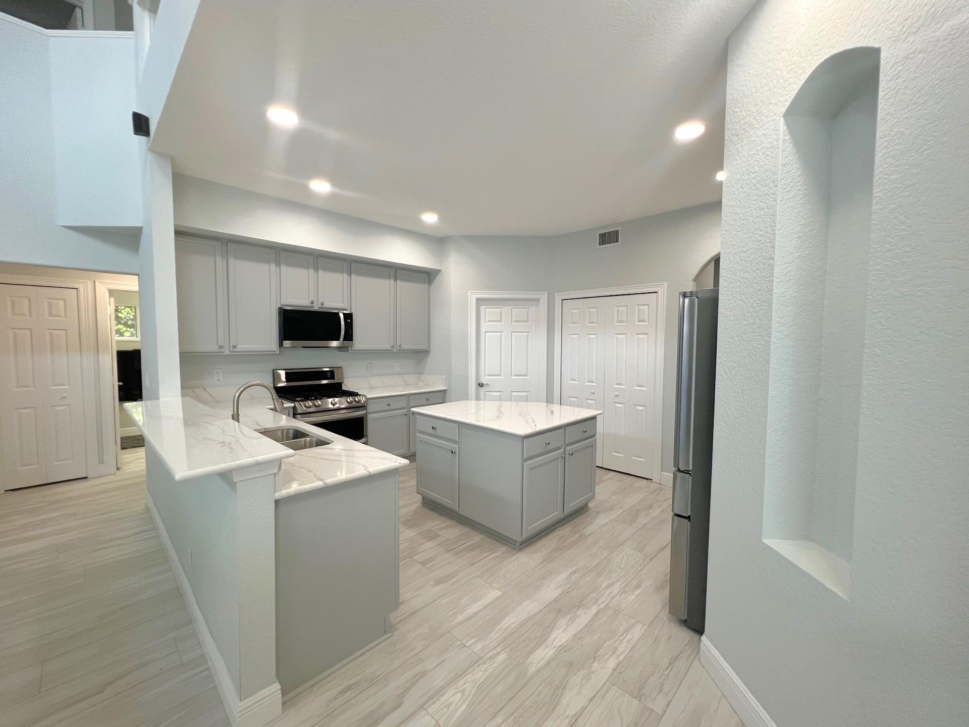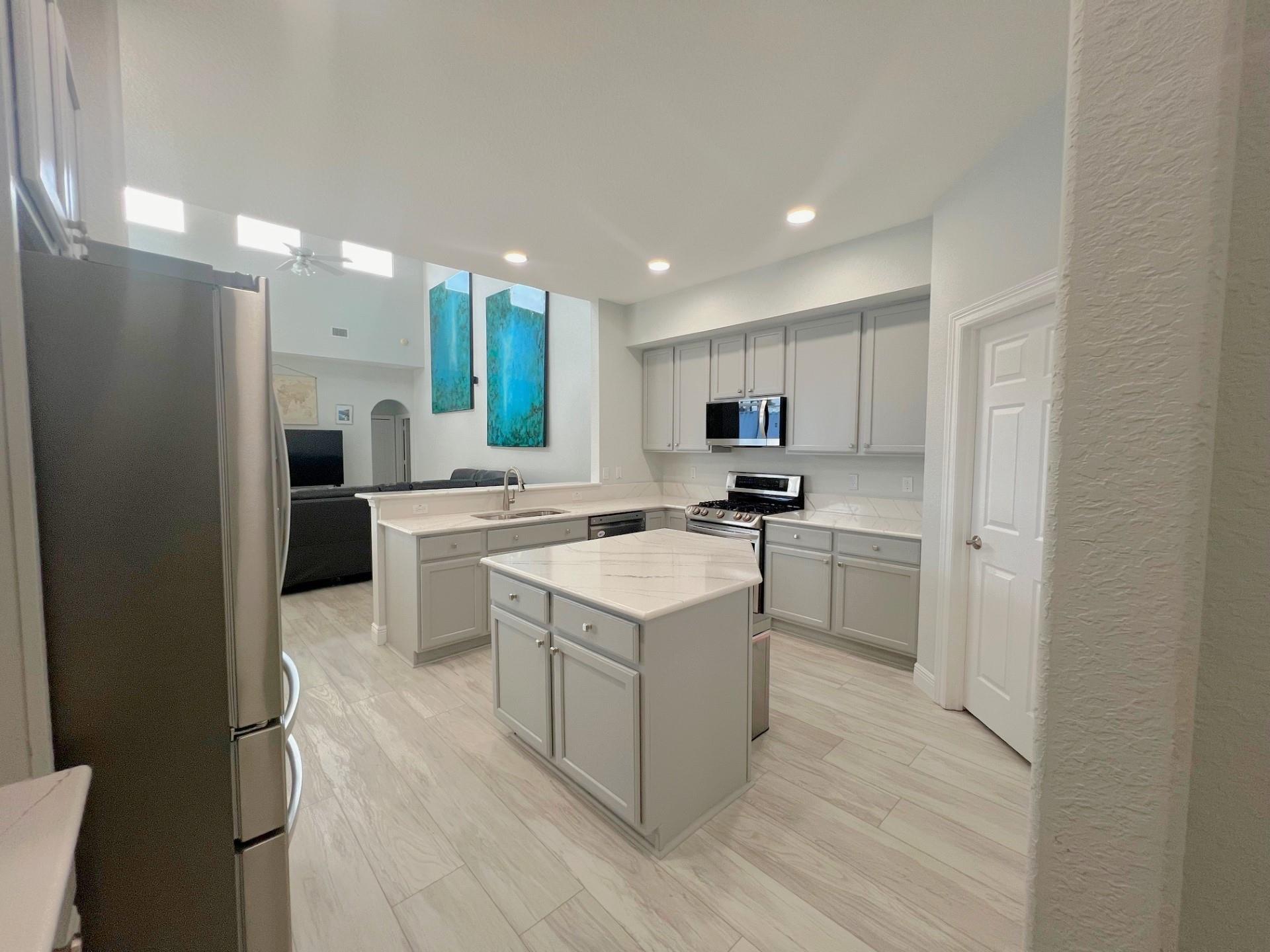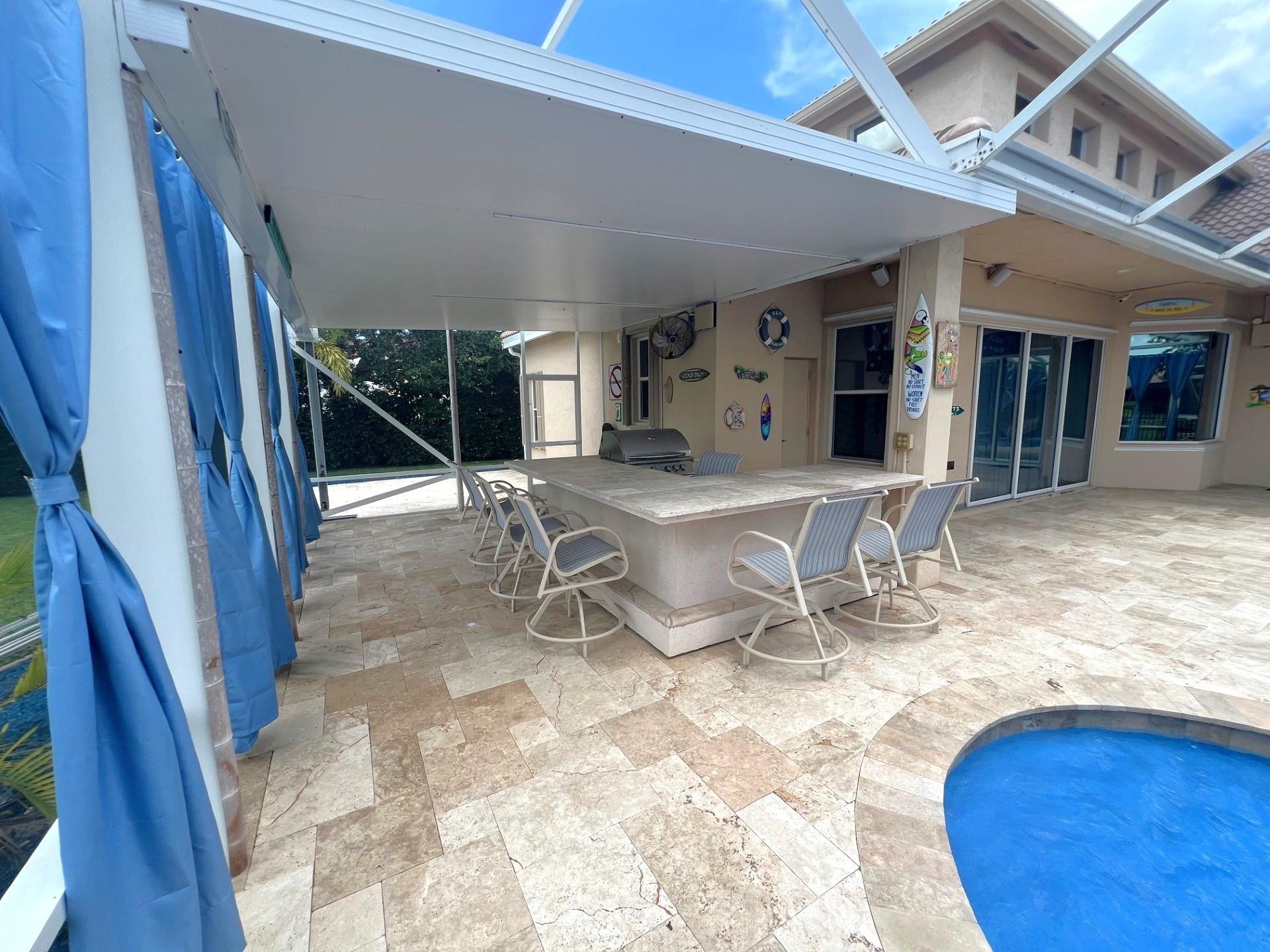 A stunning 2-story, 5-bedroom, 4-bathroom residence with a 3-car garage and spectacular screened in pool area with a waterfall, grotto, slide and outdoor kitchen. This home has over 3,400 square feet of living space and is located on a lake and quiet cul-de-sac. • SPACIOUS FAMILY ROOM: Perfect for gatherings and relaxation, the family room is the heart of this home with views of the lake, pool waterfall and sunsets. • FIRST-FLOOR PRIMARY SUITE: The primary suite offers vaulted ceilings, sliding doors leading to the pool area, dual vanities, a garden tub, and a huge walk-in shower. • UPGRADED KITCHEN: The kitchen has been recently upgraded with new appliances and countertops. • ENERGY EFFICIENT: Enjoy the benefits of whole-home solar, reducing energy bills.