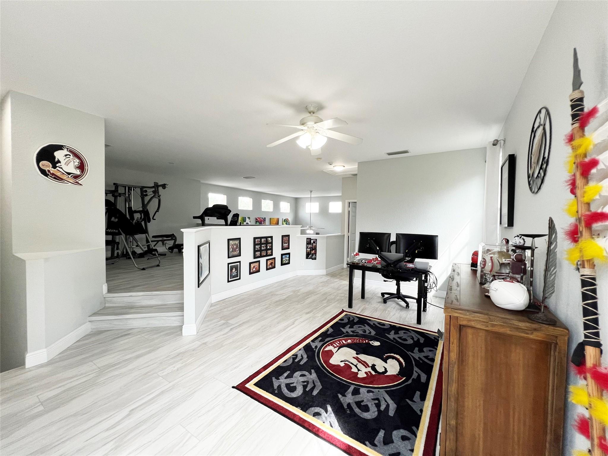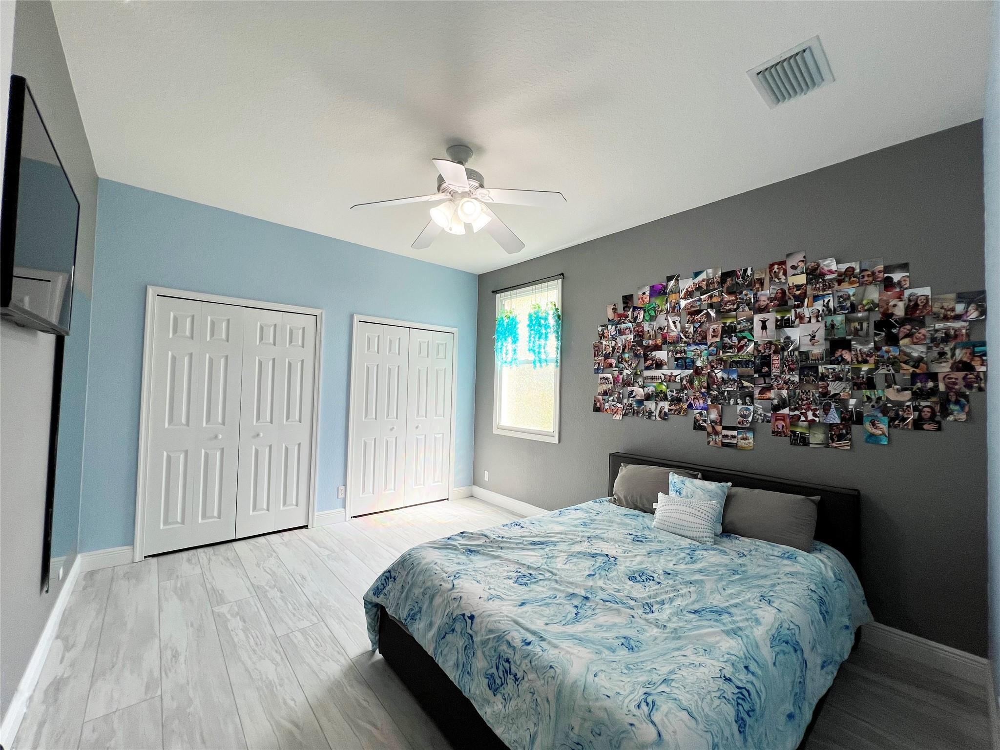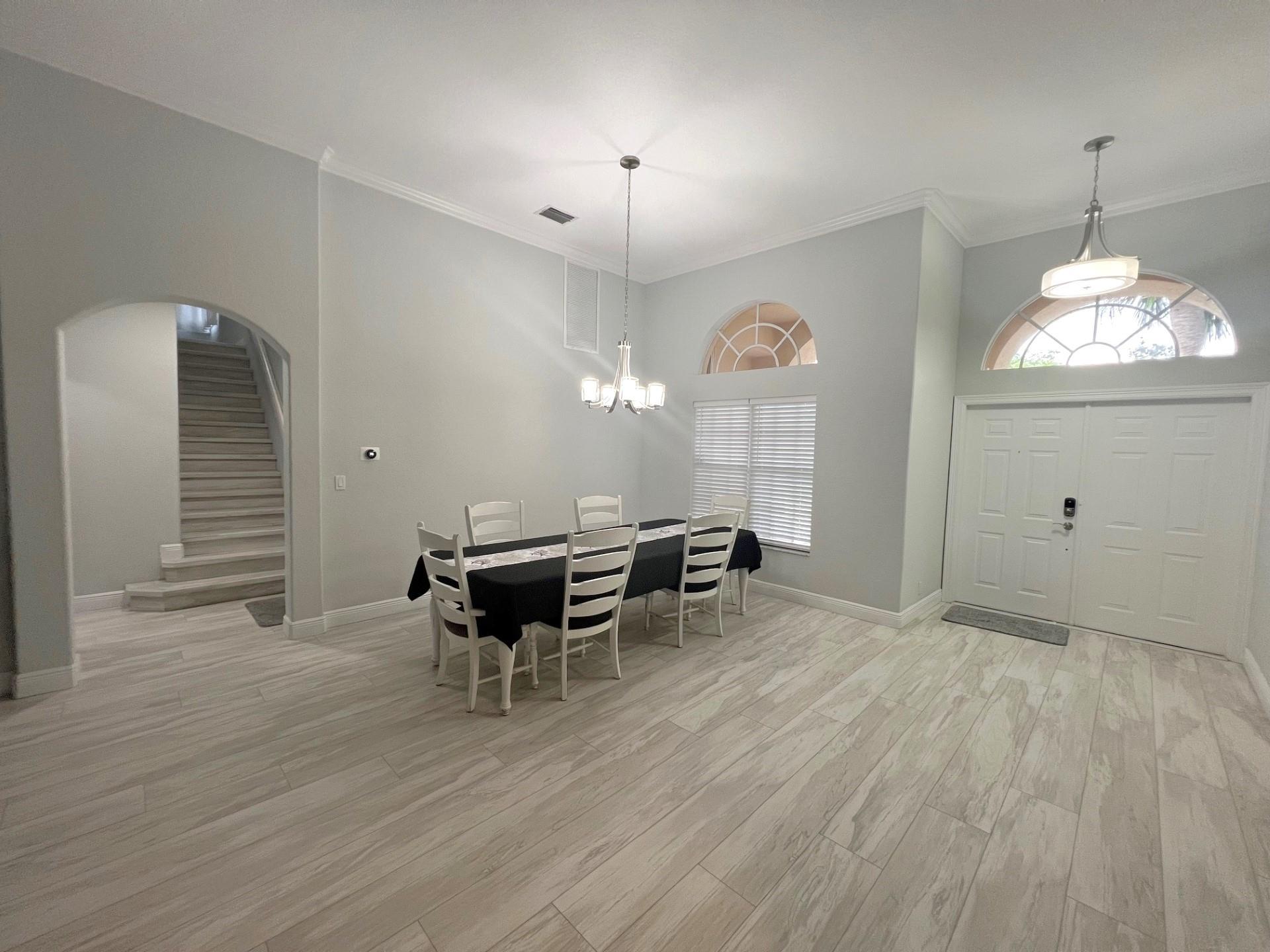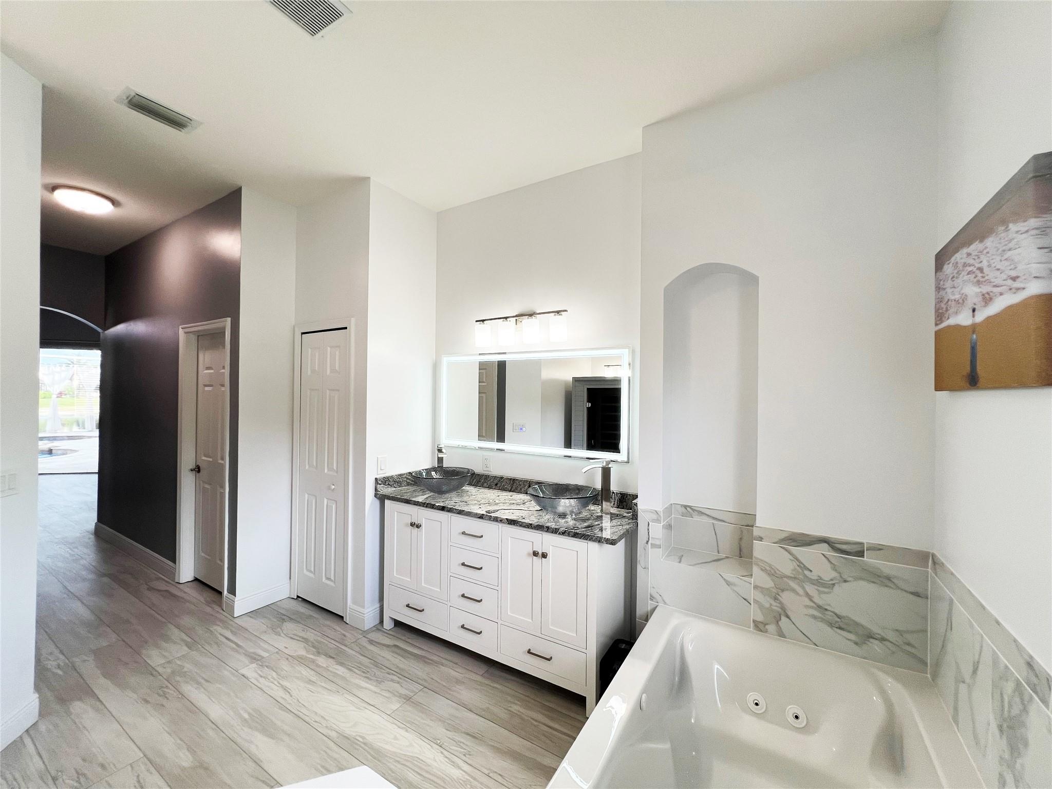A stunning 2-story, 5-bedroom, 4-bathroom residence with a 3-car garage and spectacular screened in pool area with a waterfall, grotto, slide and outdoor kitchen. This home has over 3,400 square feet of living space and is located on a lake and quiet cul-de-sac. • SPACIOUS FAMILY ROOM: Perfect for gatherings and relaxation, the family room is the heart of this home with views of the lake, pool waterfall and sunsets. • FIRST-FLOOR PRIMARY SUITE: The primary suite offers vaulted ceilings, sliding doors leading to the pool area, dual vanities, a garden tub, and a huge walk-in shower. • UPGRADED KITCHEN: The kitchen has been recently upgraded with new appliances and countertops. • ENERGY EFFICIENT: Enjoy the benefits of whole-home solar, reducing energy bills.