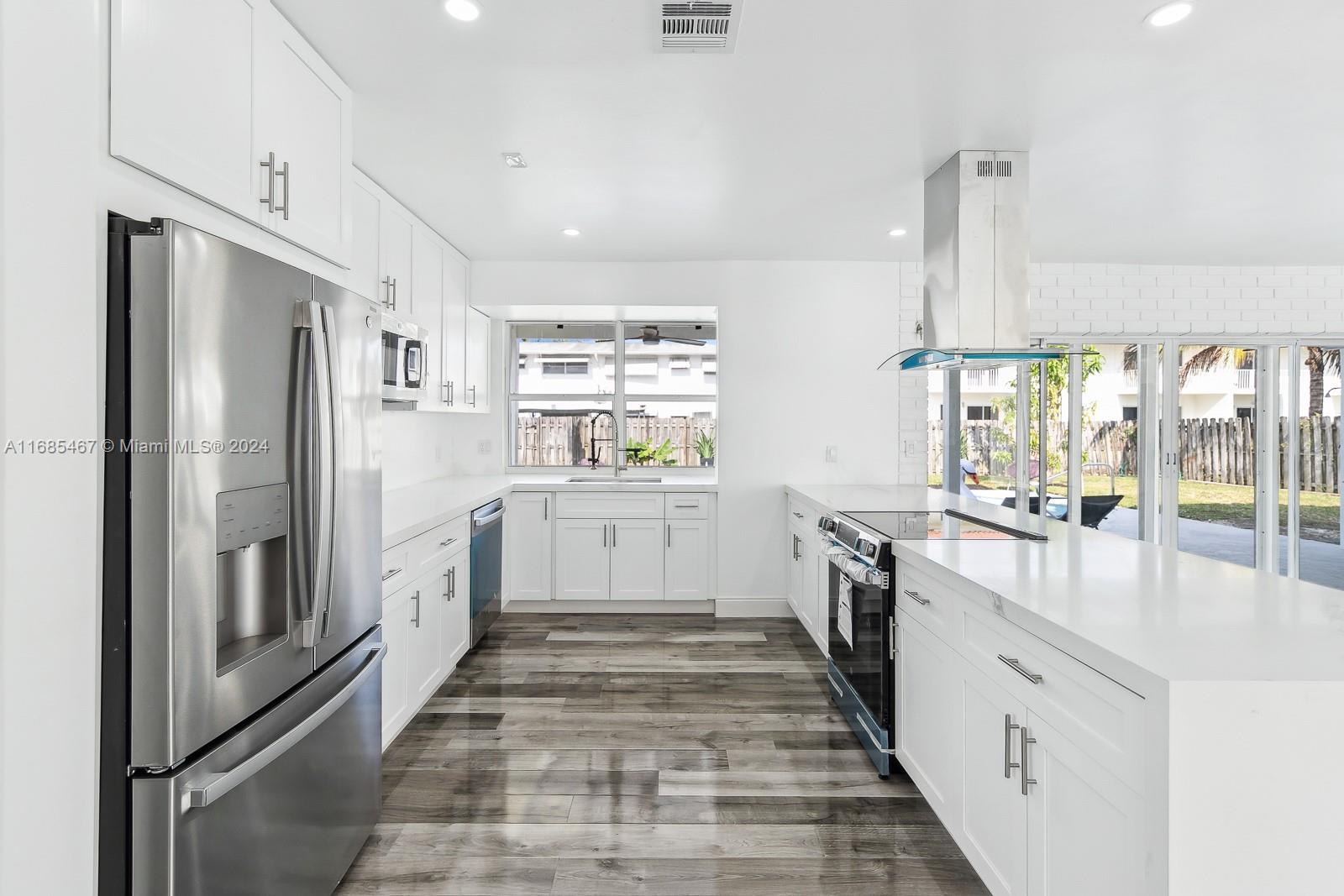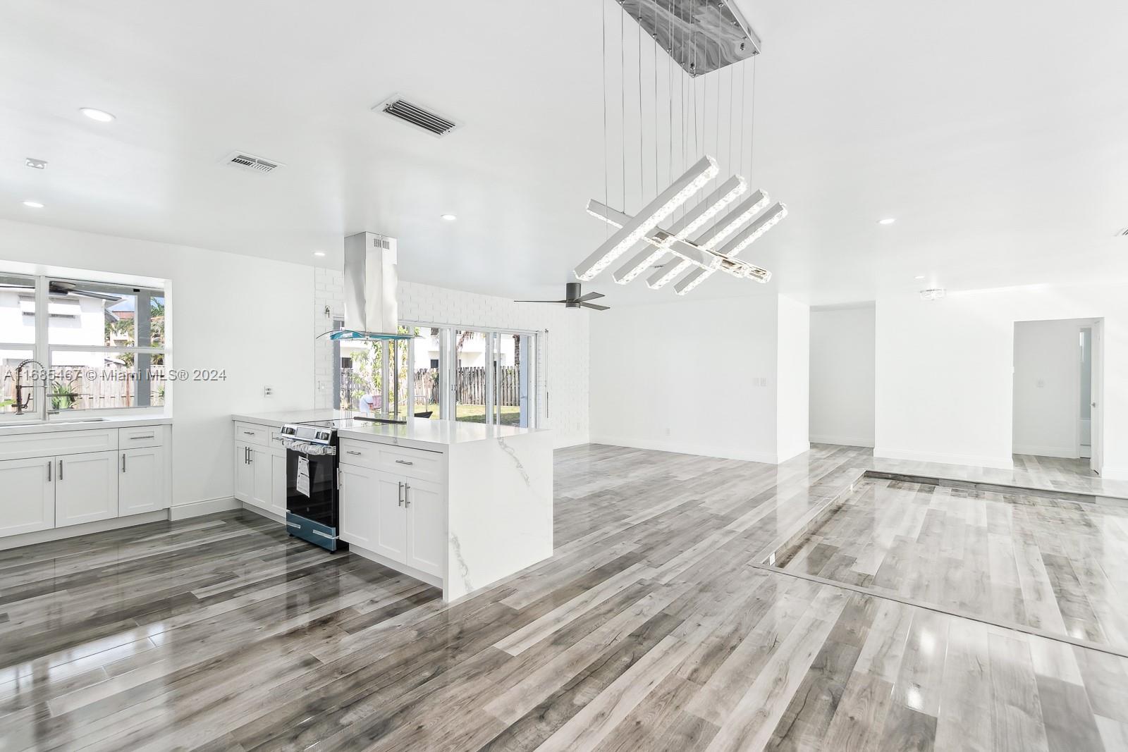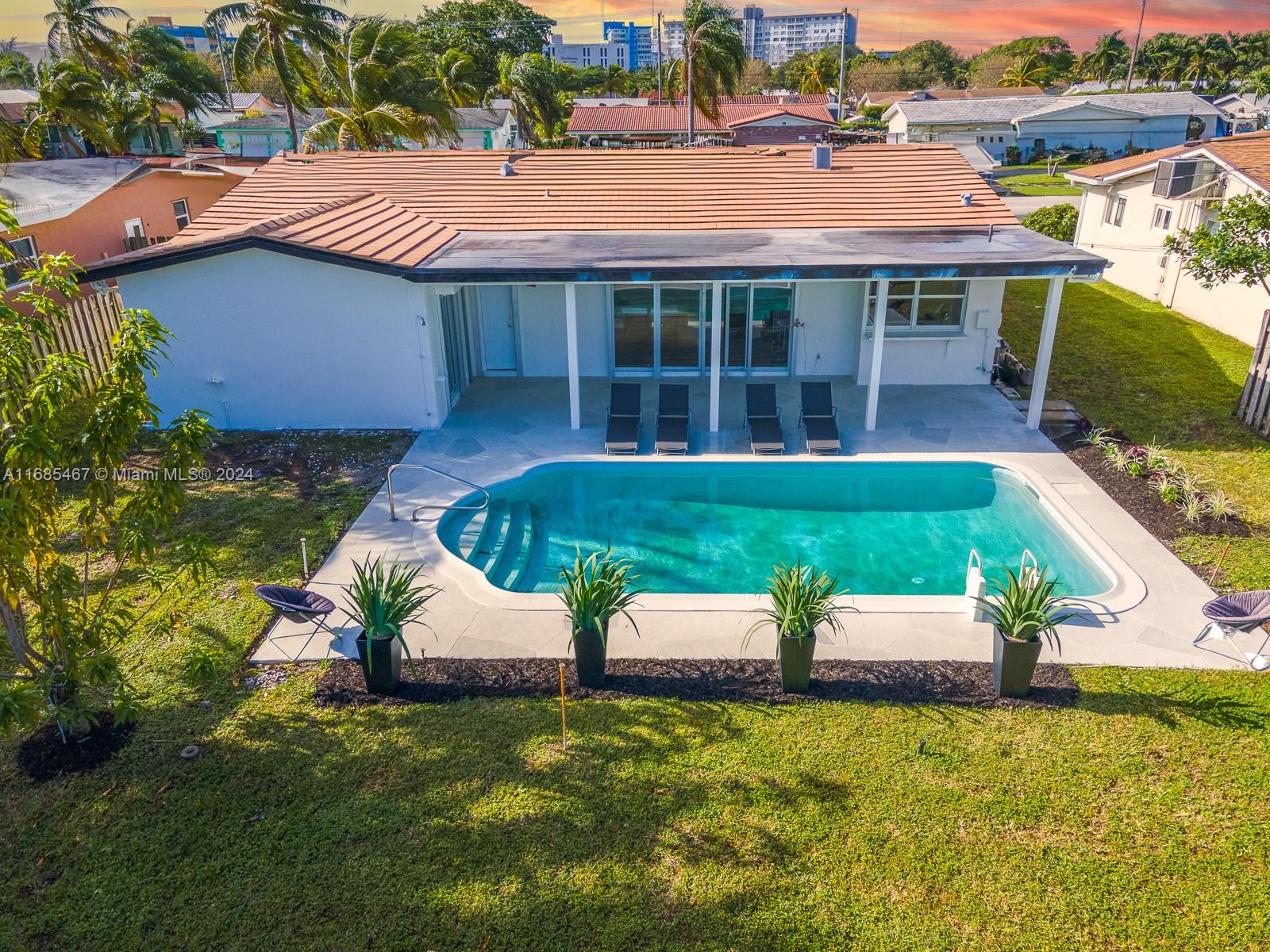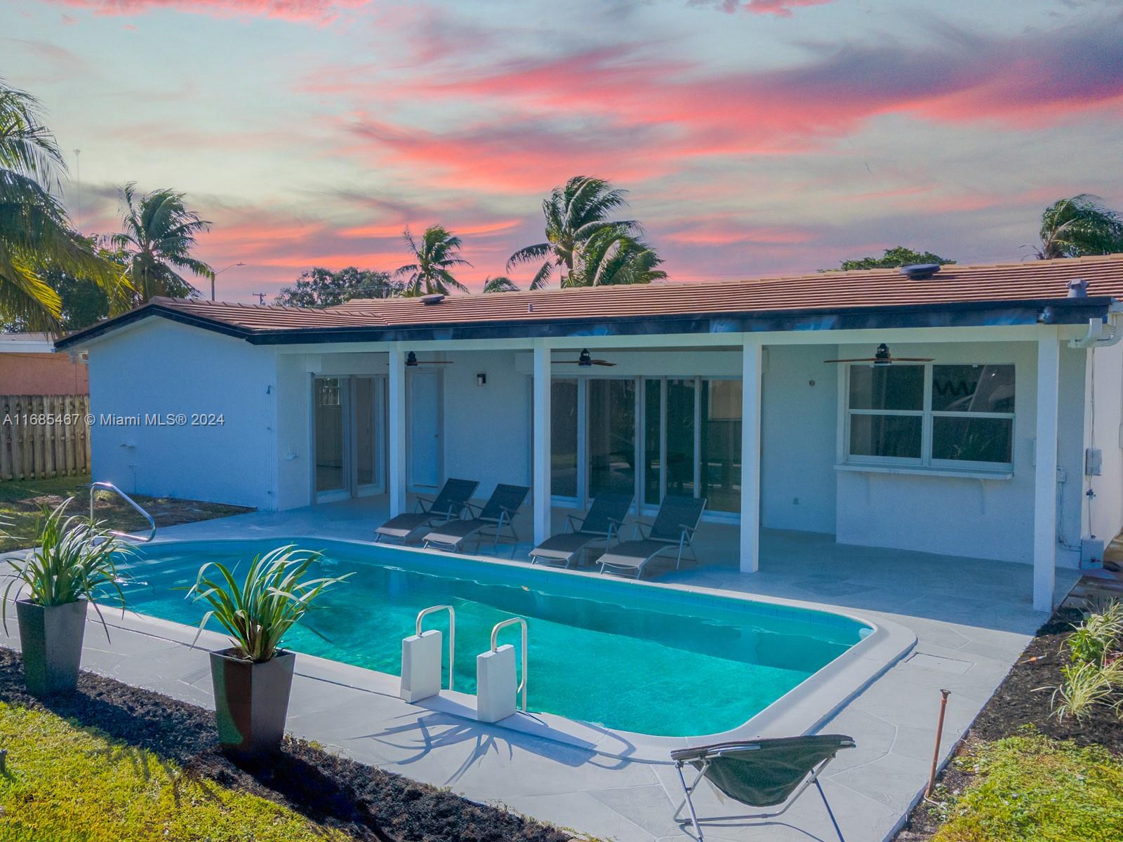 MAJOR PRICE IMPROVEMENT! Welcome to Paradise! This fully remodeled Hollywood Hills home offers prime luxury living. Highlights include recessed lighting, a stunning pool deck with European sculpted flooring, and a low-maintenance saltwater pool. Inside, enjoy new Australian piano-finish AC4 flooring, a 40-year tile roof, and impact windows and doors for security and efficiency. The open-concept kitchen features Calacatta quartz countertops, a 130" waterfall peninsula, and new stainless steel GE appliances. The updated two-car garage includes recessed lighting. The primary suite boasts an en suite bath and pool deck access. Bathrooms feature mood mirror lighting, a Jacuzzi tub, and Calacatta quartz vanities. Newer HVAC adds comfort. Your Hollywood Hills dream home awaits!