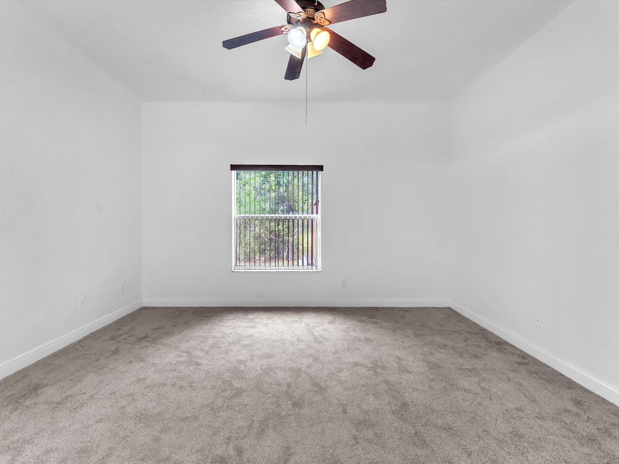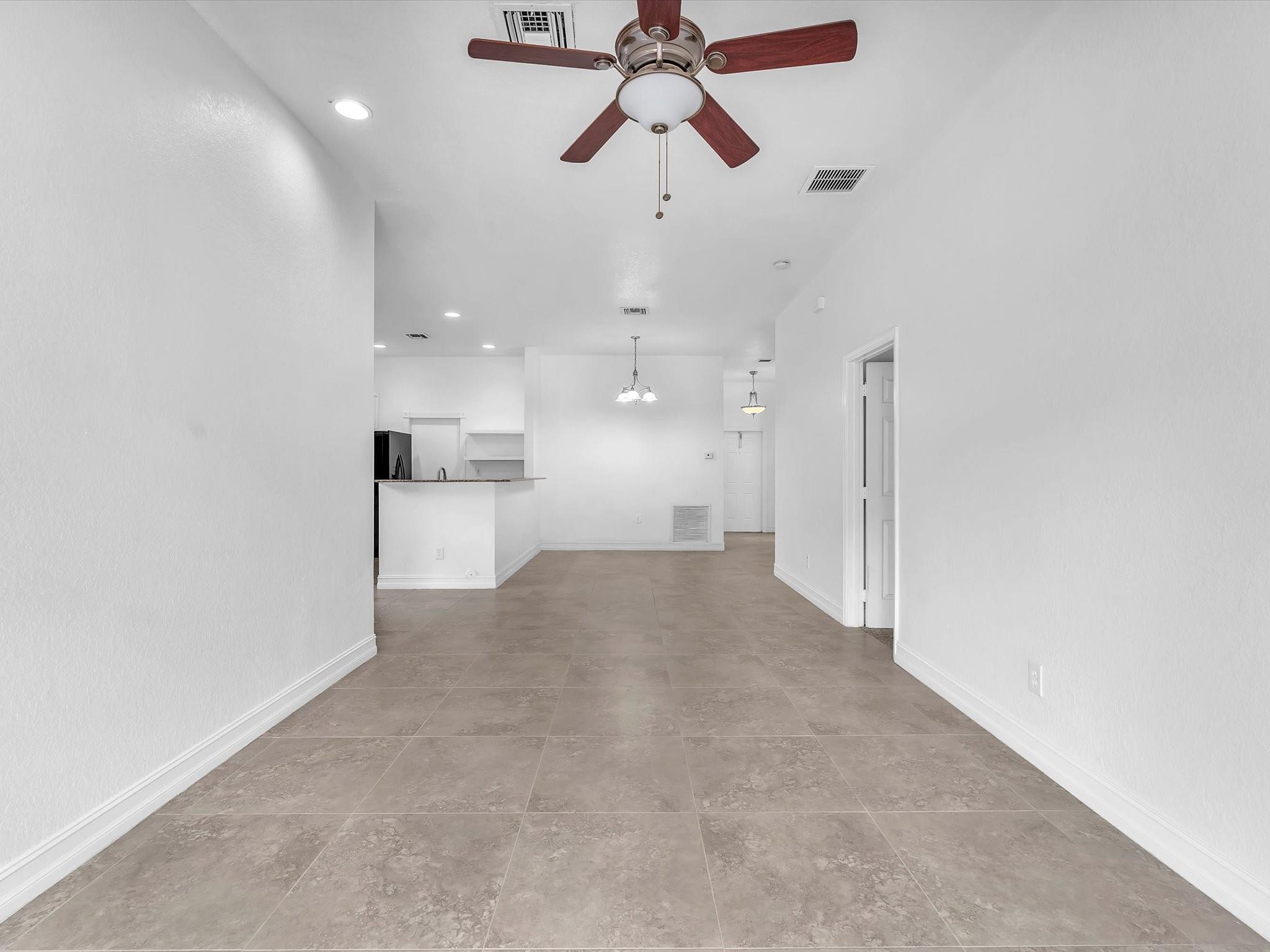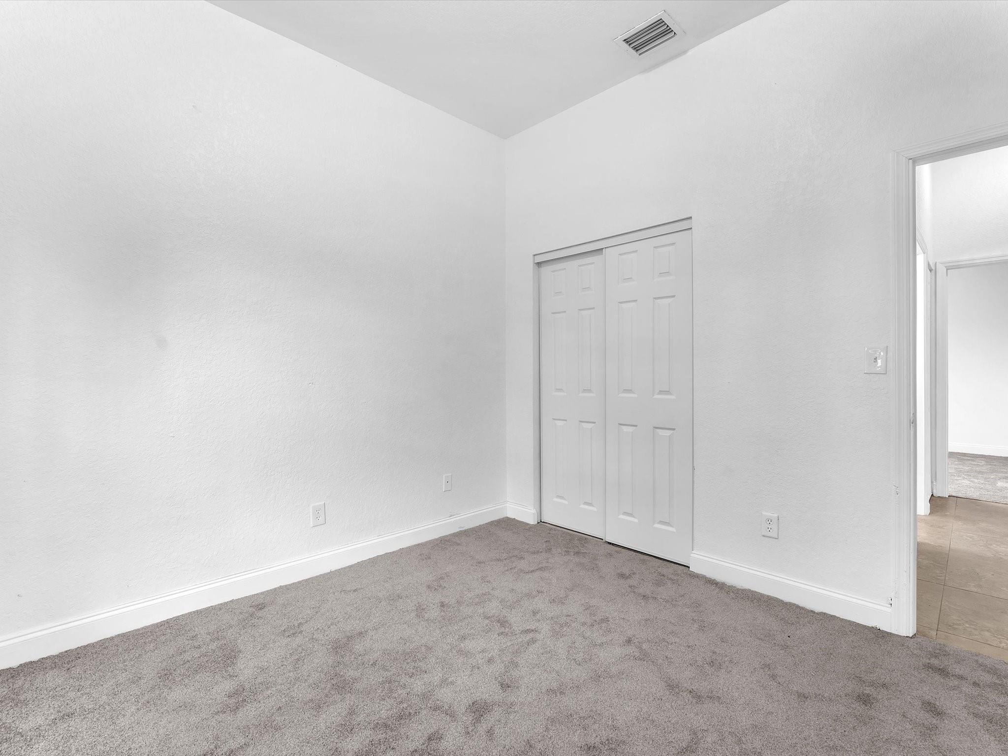This spacious 4 bedroom, 2 bathroom home boasts 10ft ceilings and a 2 car garage. The kitchen is the heart of the home offering granite counters, new cabinetry, black appliances and a breakfast bar. The large primary bedroom provides a private retreat, with an ensuite that features a modern double sink vanity, a luxurious jetted tub, a linen closet and a walk-in closet. The open floorplan includes neutral tile flooring throughout the main living areas and new carpeting in the bedrooms. Freshly painted, new roof (6/2023), new refrigerator, aluminum hurricane panels, and a timed irrigation system.