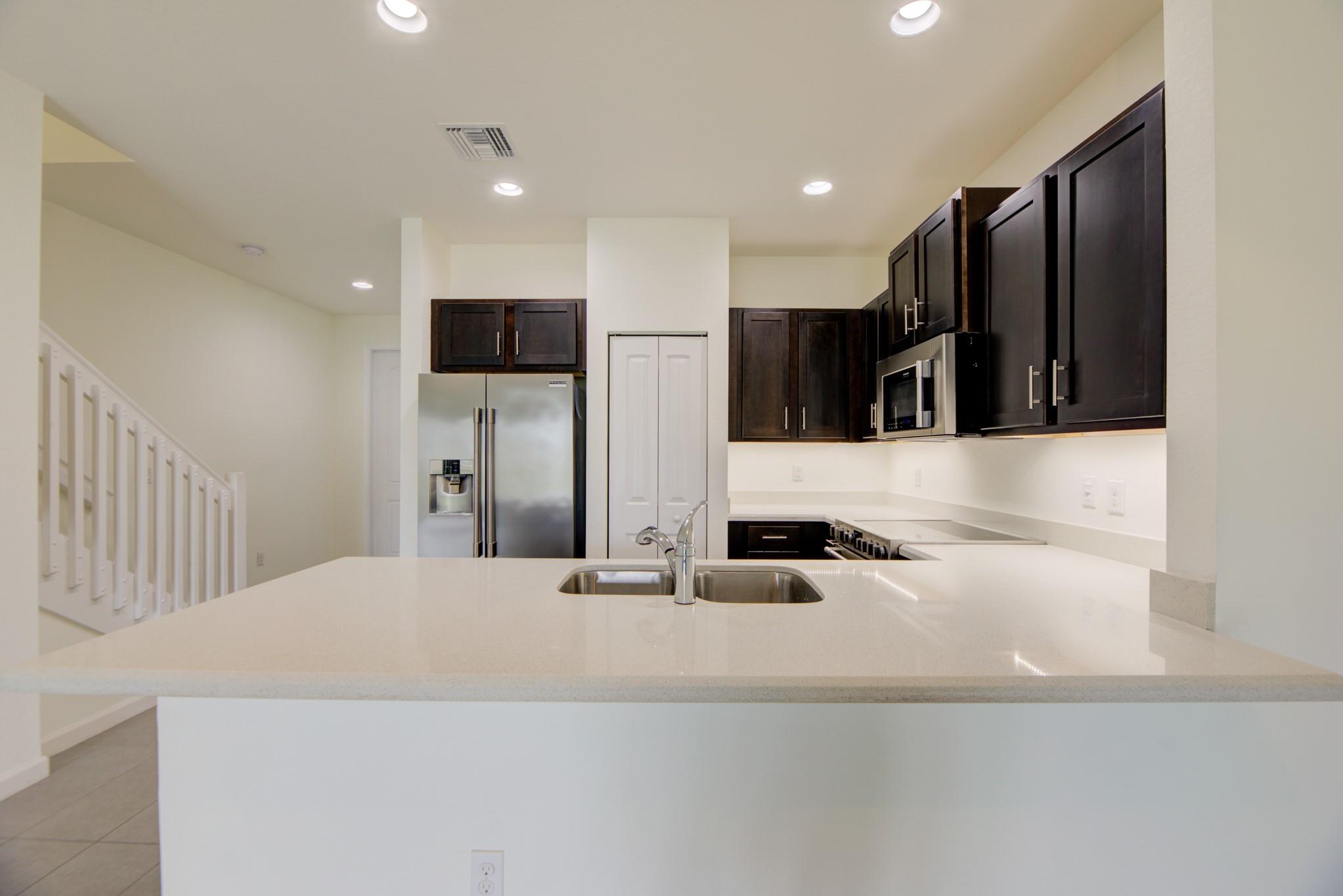 Beautiful waterfront townhome freshly painted features brand new waterproof vinyl floors on the second floor, band new washer/dryer and brand new A/C handler. Open concept kitchen with quartz countertops, wood cabinets, and stainless-steel appliances; modern bathrooms, and spacious bedrooms. It is located in the quiet and convenient Eastside Village community near the amazing and booming Oakland Park downtown!. The complex features a pool, running/walking track, private lake, kids park/playground area and plenty of guest parking. This is a pet-friendly community with a low monthly HOA. Take advantage of this prime location! Near to the beach, shopping, entertainment and easy access to major highways.