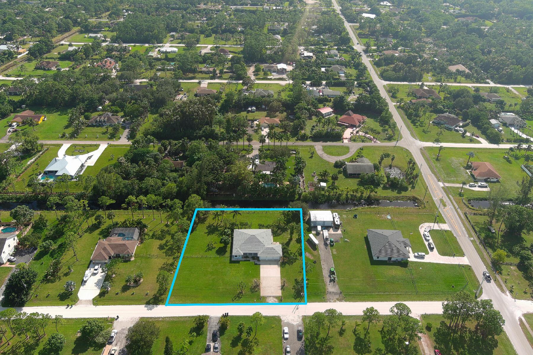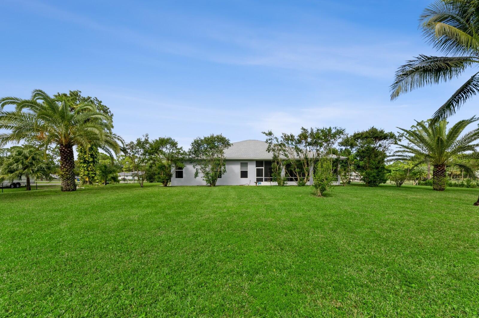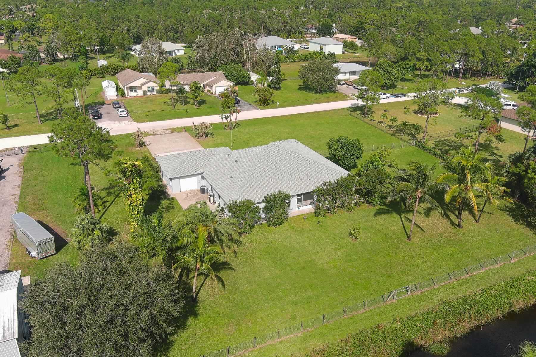 This spacious 4BR/2BA/4CG CBS SFH built in 2002, on 1.29 acres has a charming front porch & is ready for YOU! This one-level home includes IMPACT windows/doors, NEW ROOF (2024), NEW WH (2024), and fresh interior/exterior paint. This light/bright home has a split floorplan, large rooms, custom closets, new irrigation pump (2024), AC (2015), fenced backyard, canal at the rear of the property & large screened lanai w/ southern exposure. The 4-car garage (1 is tandem) has a high ceiling & is complemented by a concrete driveway (parks 9 cars), roomy attic & a sidewalk surrounding the entire home. Don't miss out on this incredible opportunity! The Acreage is a sought after community w/great schools, nice public library, many parks, community gatherings, NO HOA & several good places to eat!