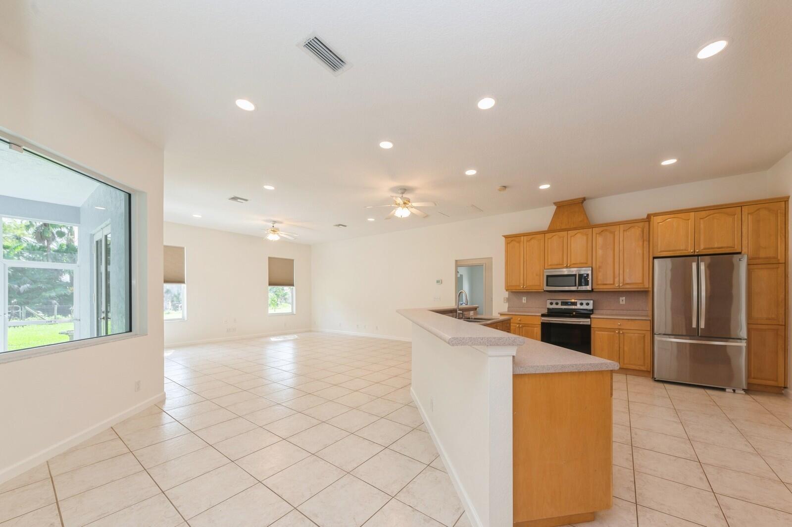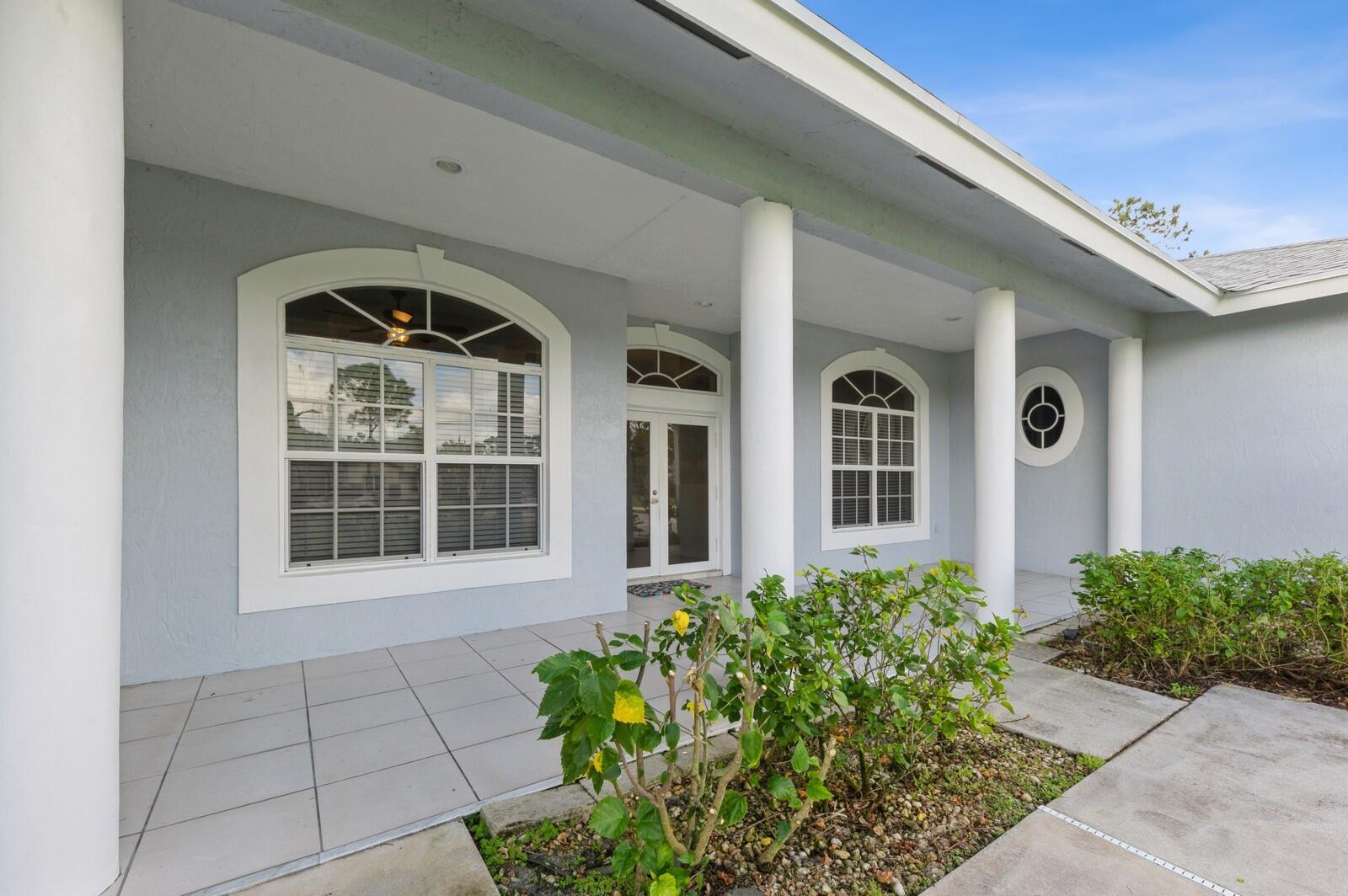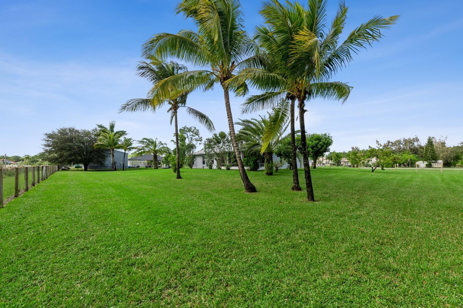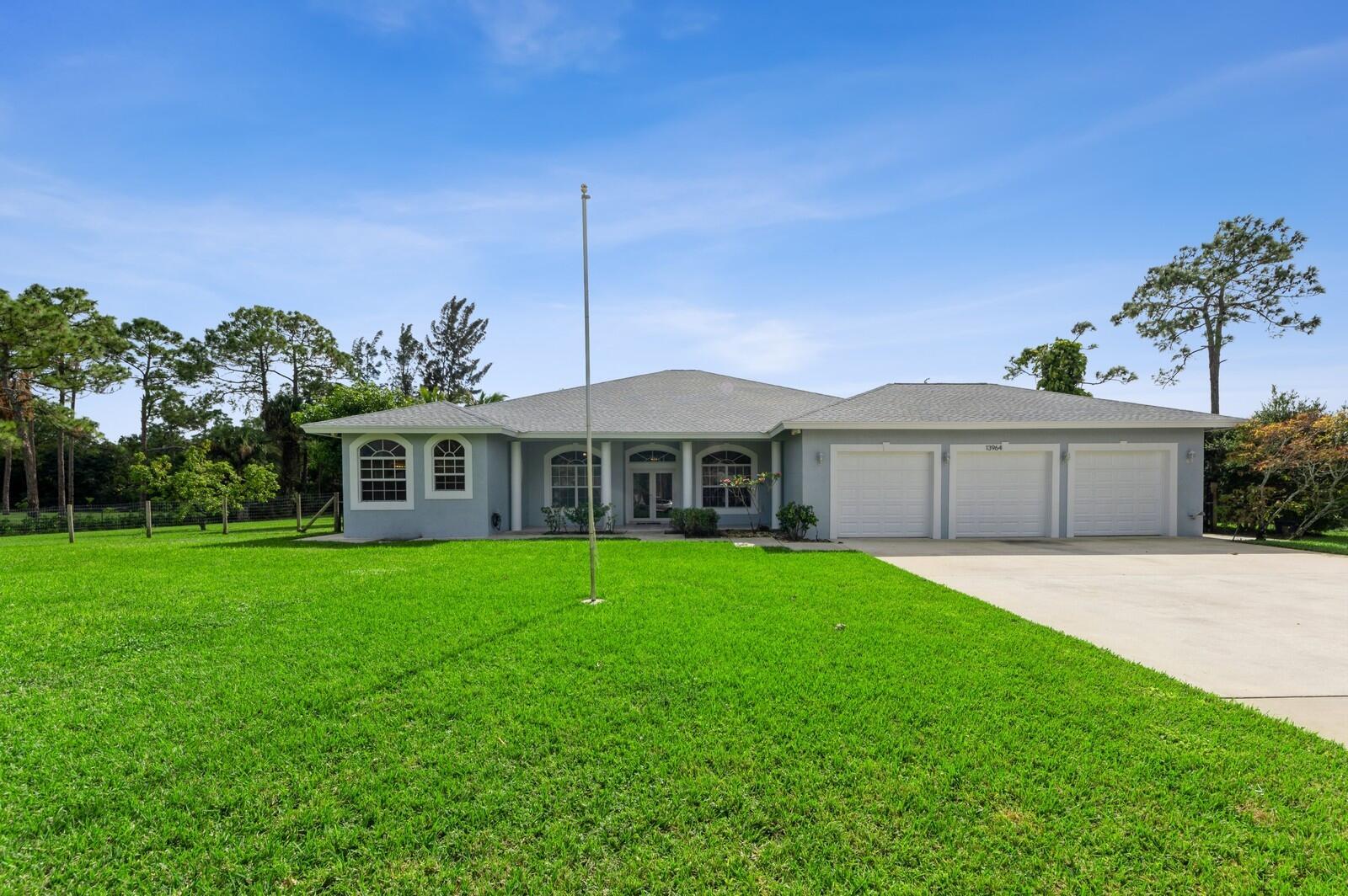 This spacious 4BR/2BA/4CG CBS SFH built in 2002, on 1.29 acres has a charming front porch & is ready for YOU! This one-level home includes IMPACT windows/doors, NEW ROOF (2024), NEW WH (2024), and fresh interior/exterior paint. This light/bright home has a split floorplan, large rooms, custom closets, new irrigation pump (2024), AC (2015), fenced backyard, canal at the rear of the property & large screened lanai w/ southern exposure. The 4-car garage (1 is tandem) has a high ceiling & is complemented by a concrete driveway (parks 9 cars), roomy attic & a sidewalk surrounding the entire home. Don't miss out on this incredible opportunity! The Acreage is a sought after community w/great schools, nice public library, many parks, community gatherings, NO HOA & several good places to eat!