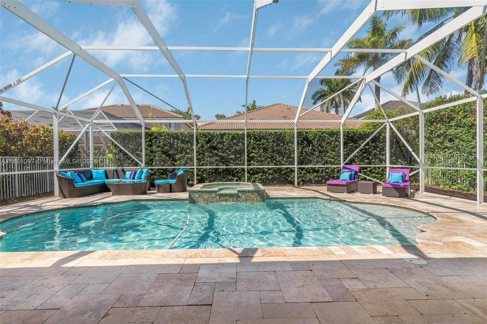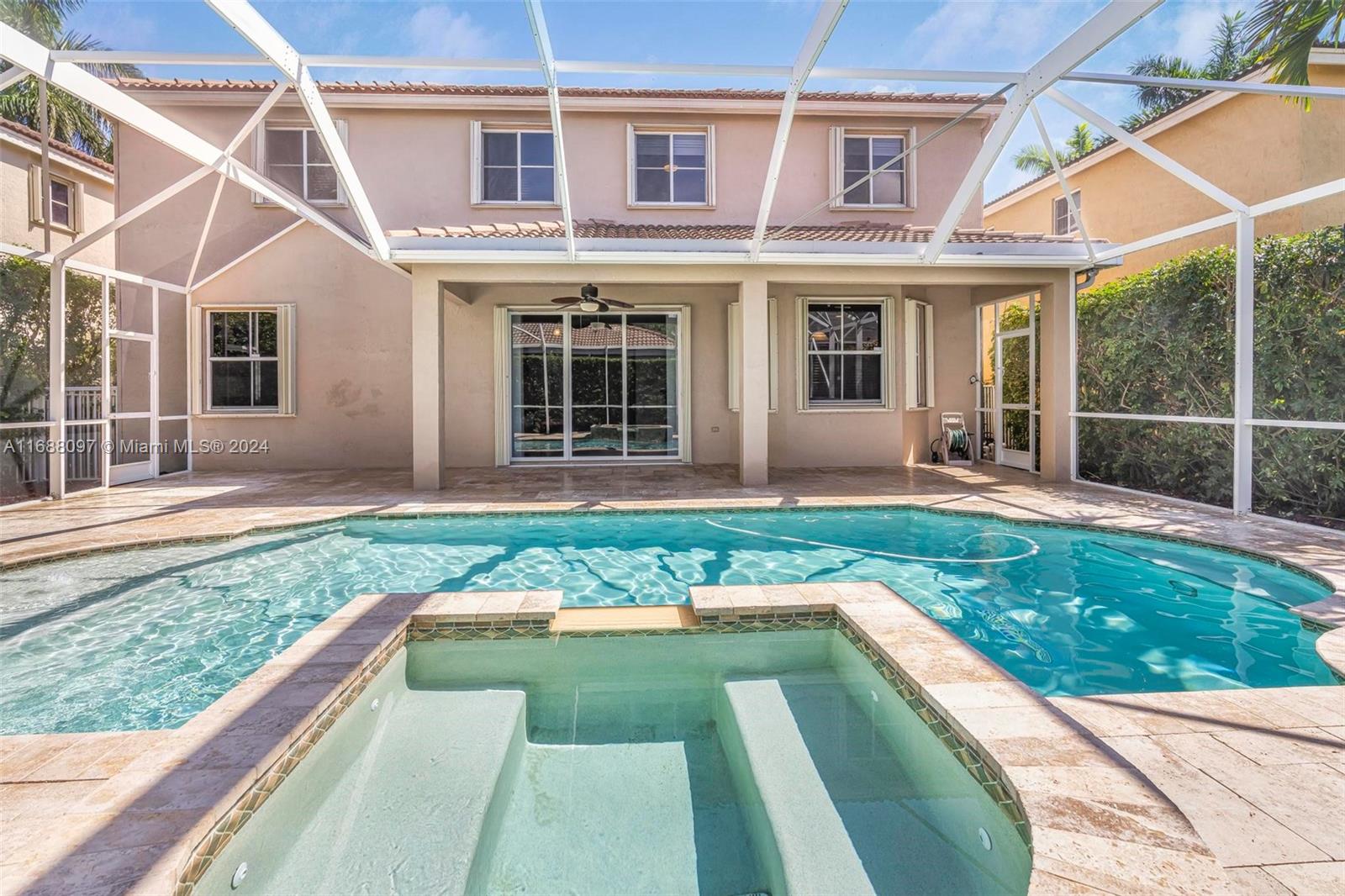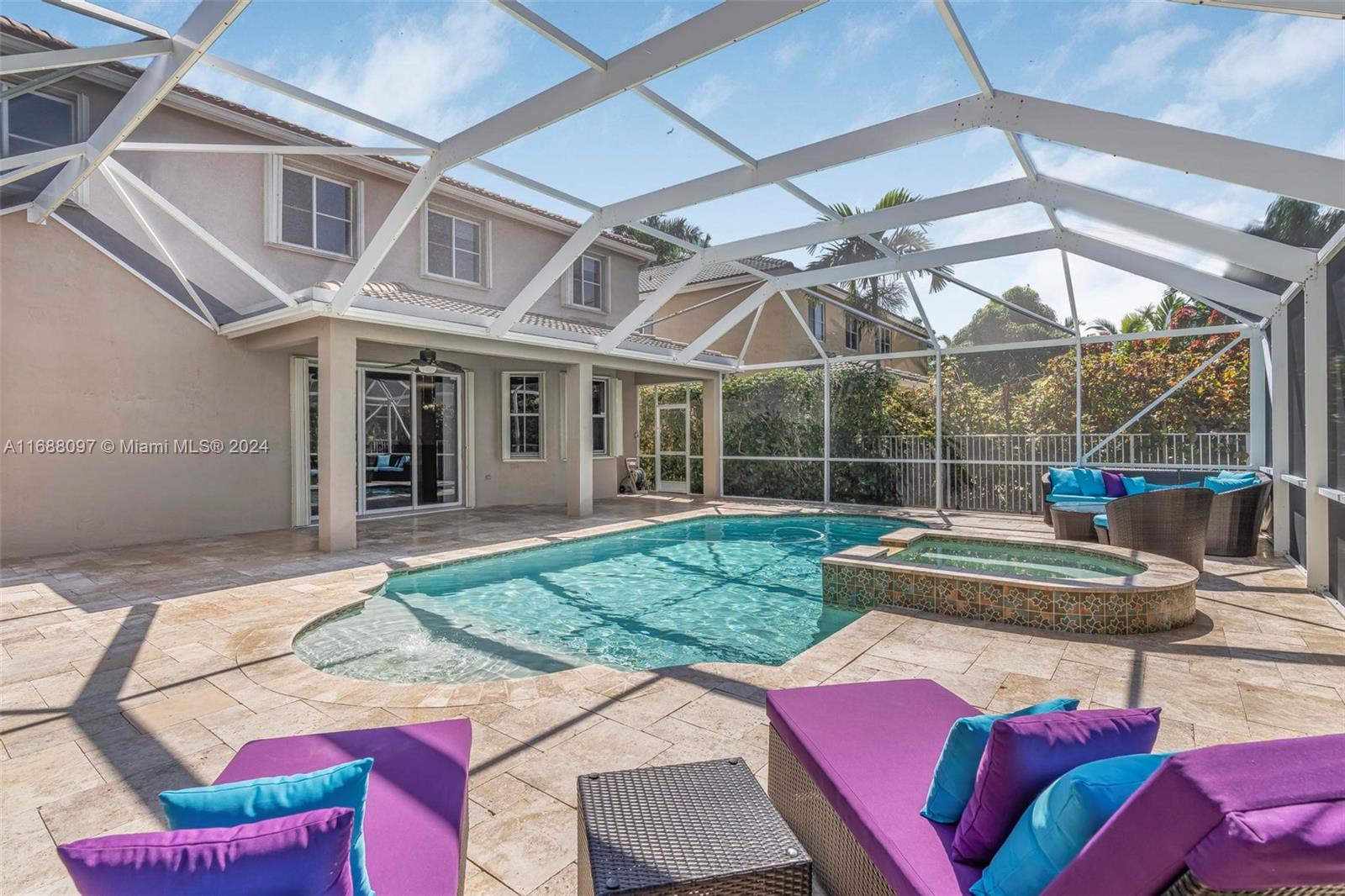 Beautiful 5/4 pool home in the A+ school district and highly sought after gated community of Savanna! This home boasts 5 spacious bedroom with one full bedroom + bathroom downstairs. Fantastic layout with the kitchen opening to a large family room which is great for families and entertaining. Dive into the heated pool & spa w/ extended travertine pool deck enclosed by a 2 story screen enclosure. New heater + pump! Perfect outdoor area to enjoy South Fl living! 2 car garage! Accordion shutters for full storm protection. The Savanna community offers resort style living + state of the art leisure & recreation! A rated schools! Within walking distance enjoy the community amenities including pool, lap pool, waterslide, children’s aquatic play area, mini golf, basketball, roller hockey rink,