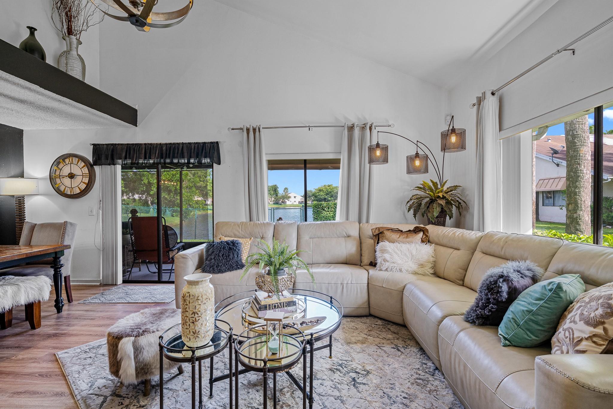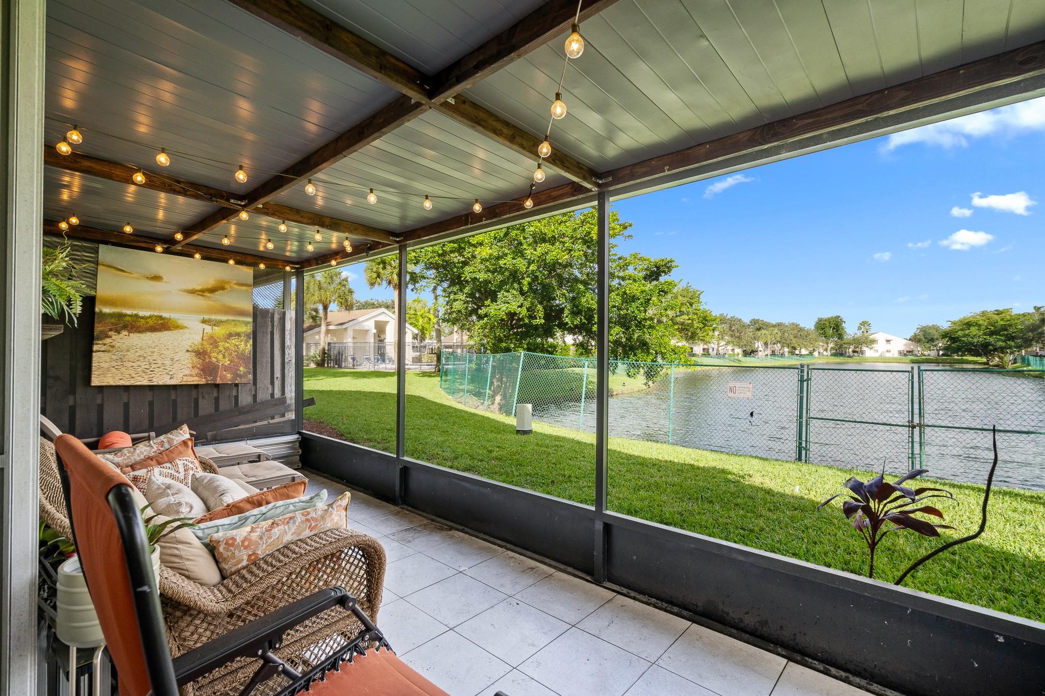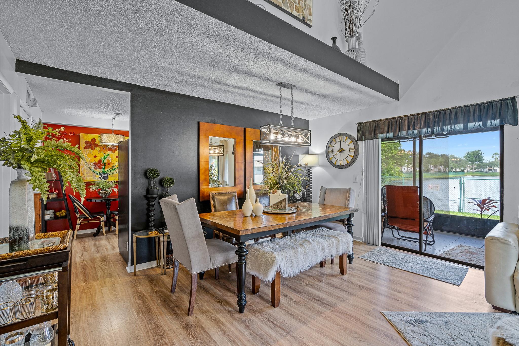 Beautiful 2 bedrooms 2 bathrooms vaulted ceiling townhouse on lake, with peaceful screen in patio over looking the lake. First floor Master bedroom has a den/office with walk-in closet which is being used as a sitting room. Very Spacious, Meticulously maintained. Move in ready. Conveniently location near shopping malls, school, restaurants, and major highways. Very nice area. Community pool. new roof installed 2023. home has accordion shutters on downstairs windows. upstairs bedroom window has hurricane panel.