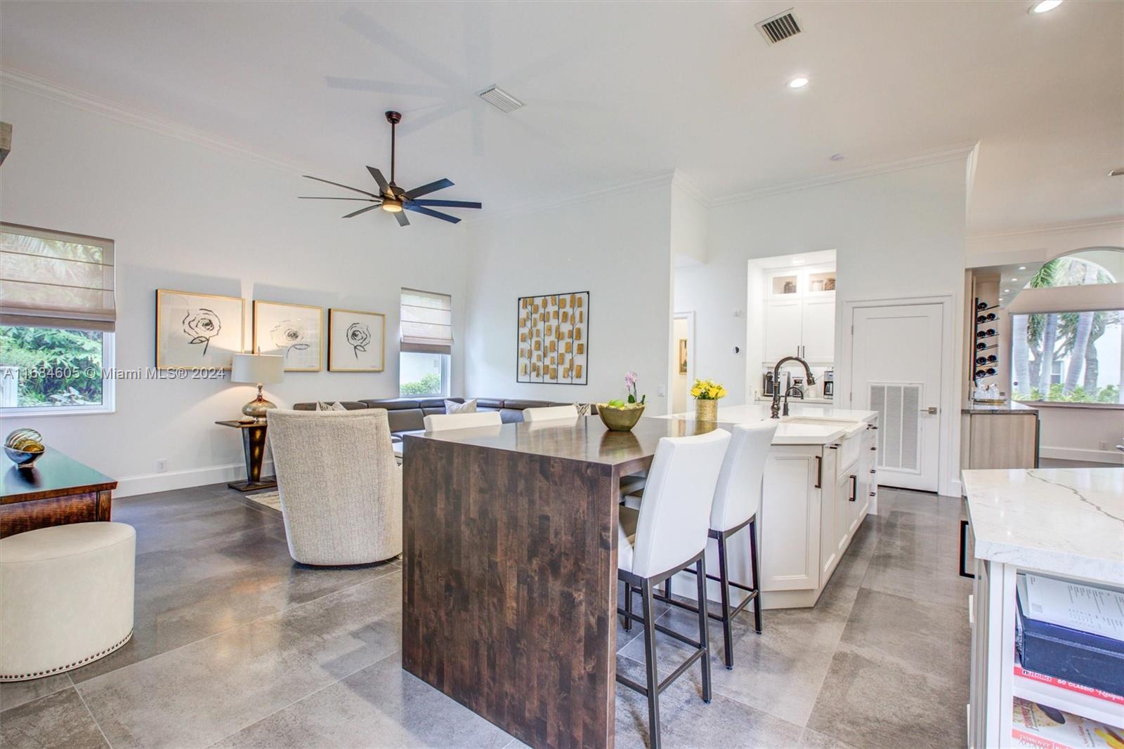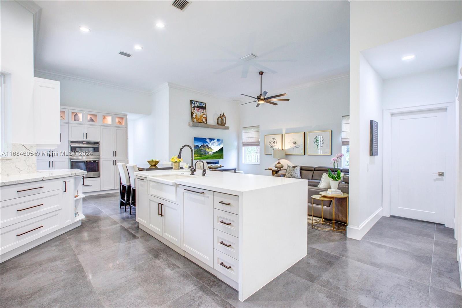 Welcome to this fully renovated, like-new home in Weston! Highlights include NEW ROOF (22), SOLAR PANELS, HVAC, IMPACT WINDOWS AND DOORS, and new paver driveway. Inside, 12-ft ceilings, imported Spanish porcelain tiles, and open concept with high-end finishes, built-in bar with Quartzite countertops, wine cooler, and bar sink. Gourmet kitchen features custom shaker cabinets, Diamante Quartz counters and backsplash, custom farmhouse sink, expansive island, and premium GE Profile appliances. Primary suite offers custom shades, built-in closets, spa-like bath with frameless shower and freestanding tub. Outdoors, heated saltwater pool/spa, covered patio, and fully fenced yard. Garage features epoxy flooring, ceiling storage racks, and 220V outlet for EV. (See attached full upgrade booklet)