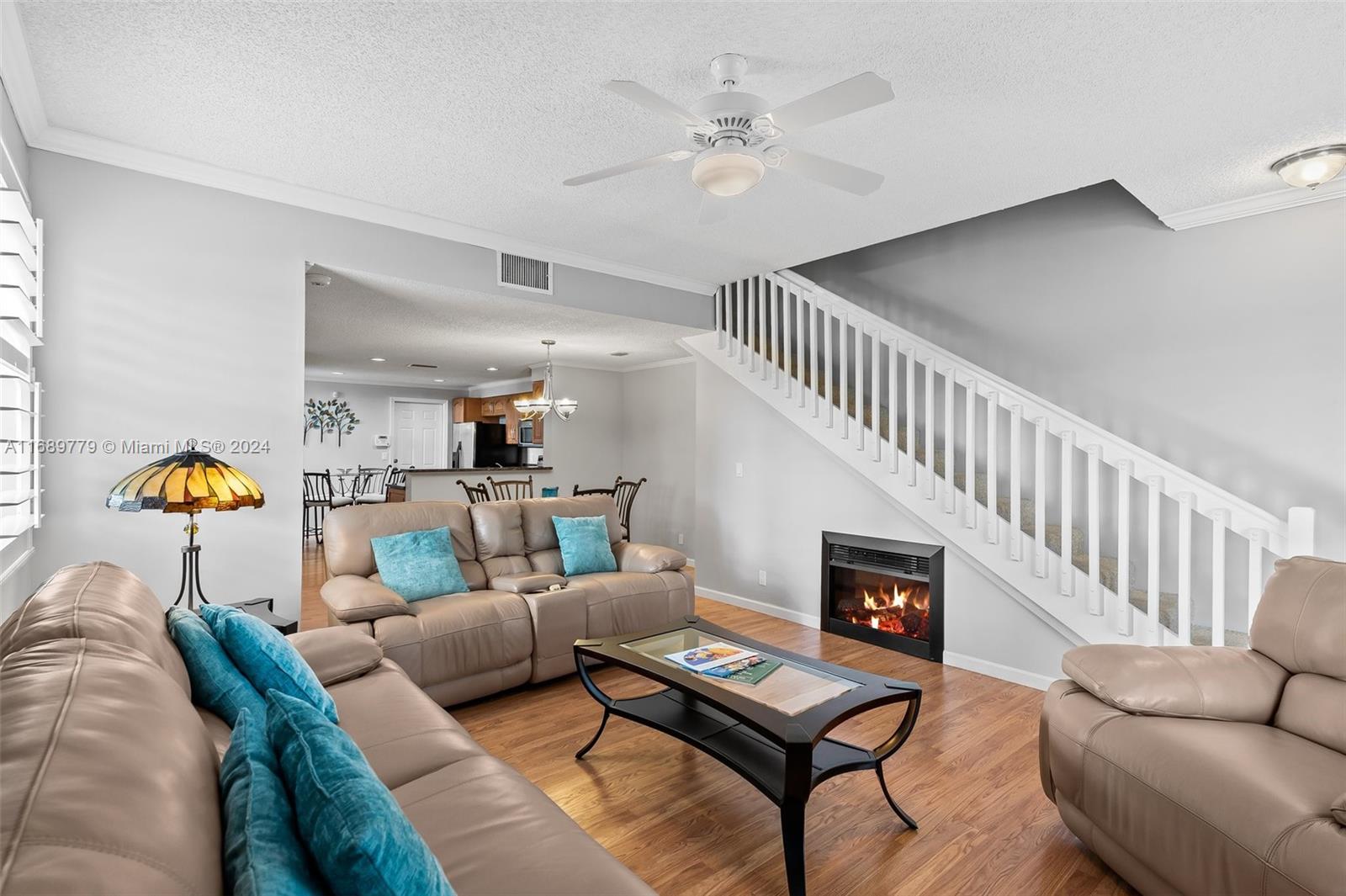 Townhome in the highly sought-after San Sebastian community in Weston! This end-unit boasts water views from every window, situated on a peaceful dead-end street. Inside, find freshly painted interiors, laminate wood flooring, crown molding throughout, and plantation shutters. The updated kitchen features granite countertops, stainless steel appliances, eat-in area perfect for casual dining. The house includes an attached garage and a comfortable living area with an electric fireplace and ceiling fans for added comfort. Step out onto the screened lanai to enjoy serene water views on both sides of the home. For peace of mind, hurricane shutters are also included. Enjoy community amenities, such as a sparkling pool and playground. Known for its A-rated schools. Quick access to I-75.