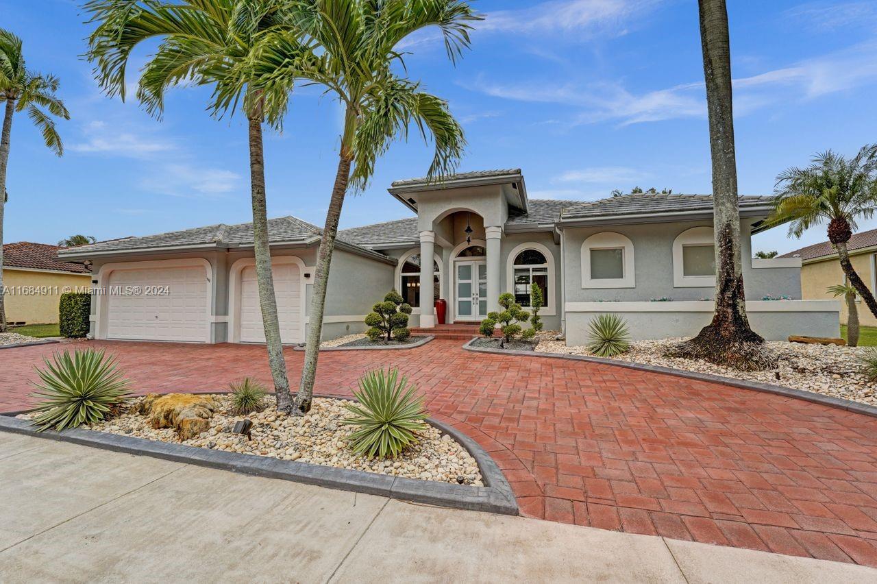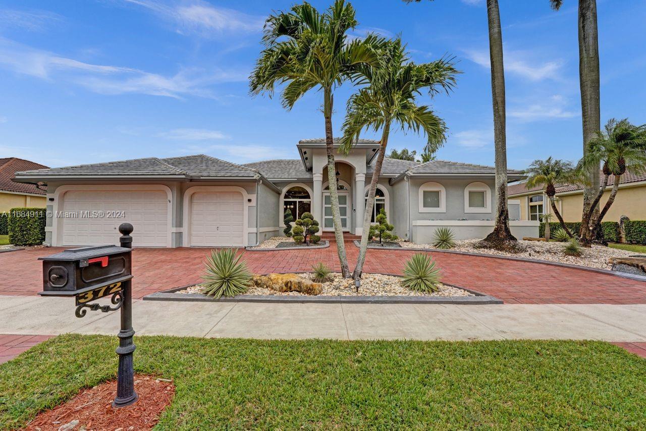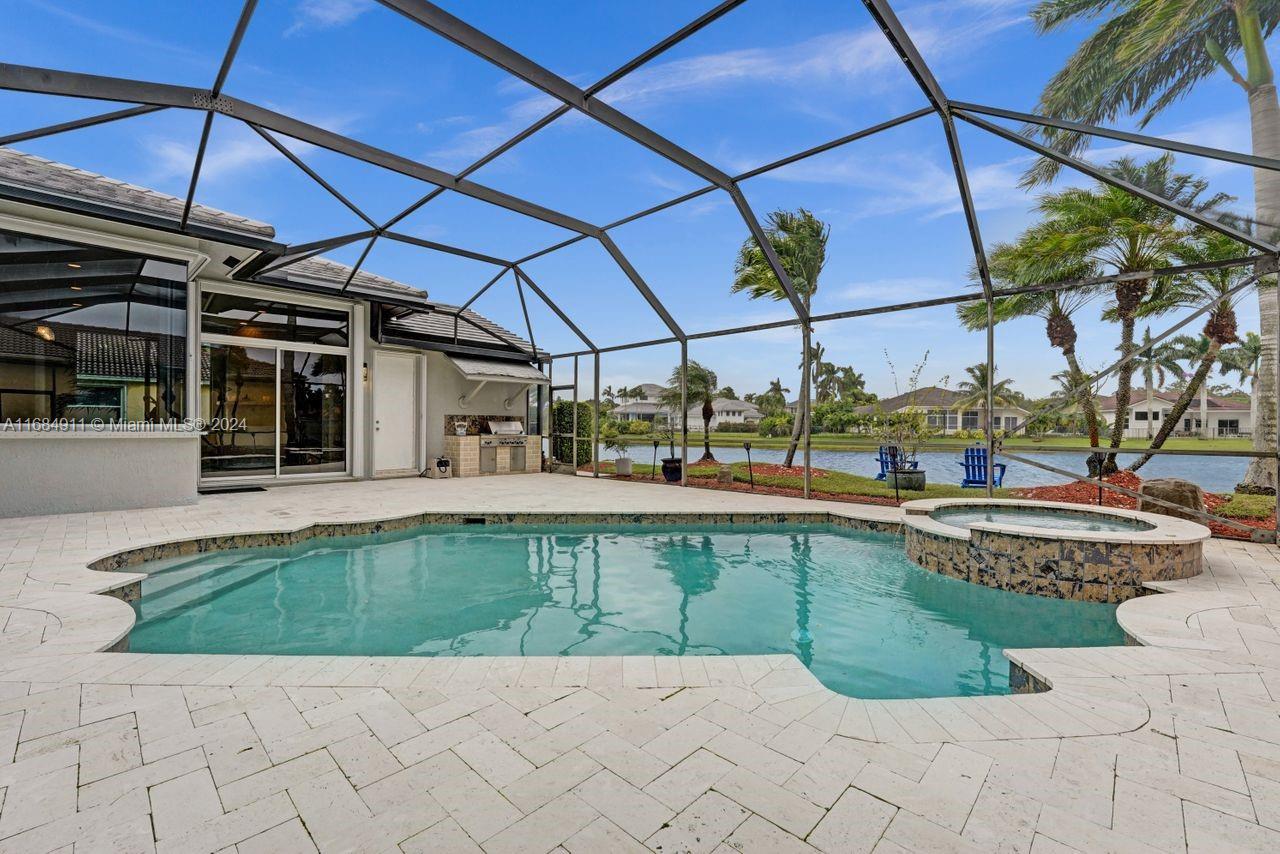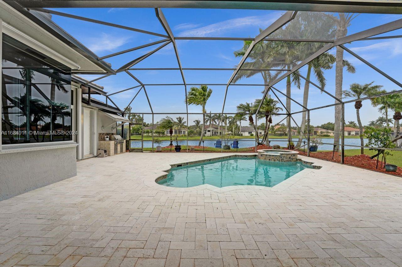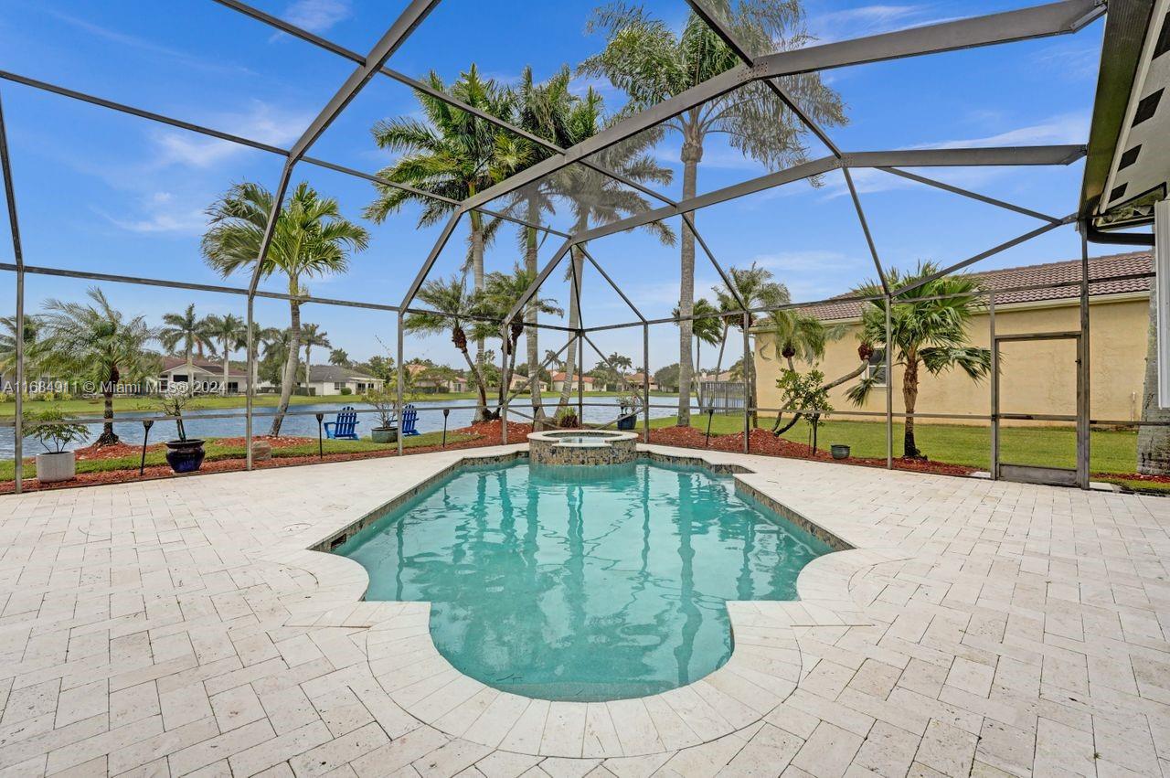 Experience luxury in the prestigious community of The Landings, Weston. This single story, spacious 5BDRM/3.5BATH, plus an Office, home boasts stunning curb appeal, circular driveway and 3-car garage. Step inside to find stunning lake views, UPDATED swimming pool, travertine marble deck. Outside patio/yard is ideal for entertaining w/ Summer kitchen. Travertine flooring, REMODELED stunning modern kitchen with wine fridge- a chef’s dream! Spacious bedrooms with custom closets, NEWER dishwasher, NEW ROOF, partial IMPACT windows/doors, accordions, NEW hot water heater, pool pump. FRESHLY painted exterior, epoxy flooring in garage, driveway resurfaced/resealed. Community includes Gated Access, Pickleball, Basketball, Playground & convenient access to shopping, dining, schools, and highways.