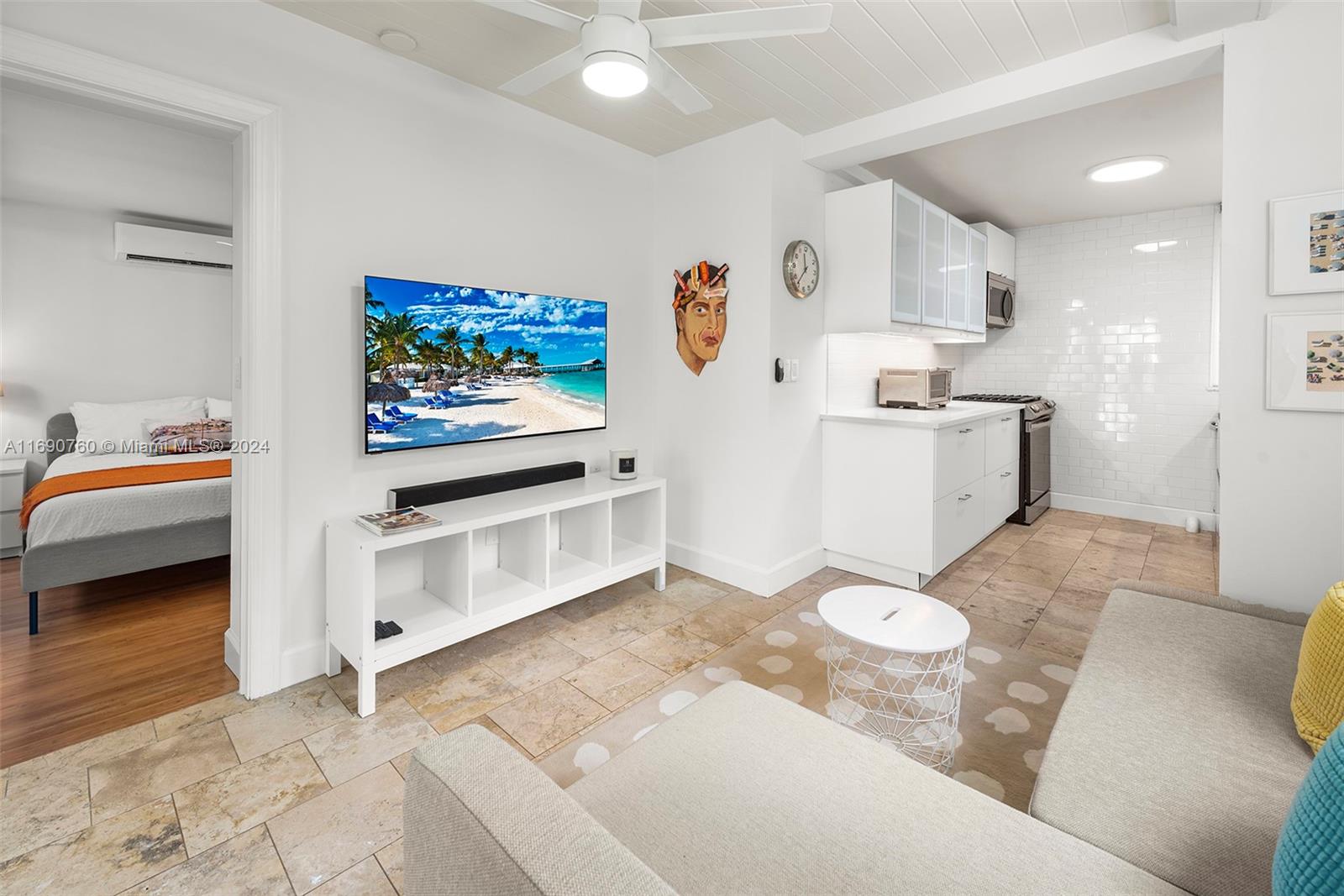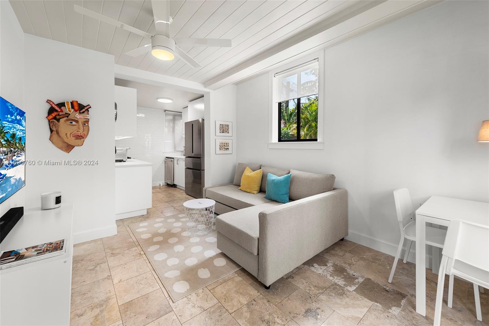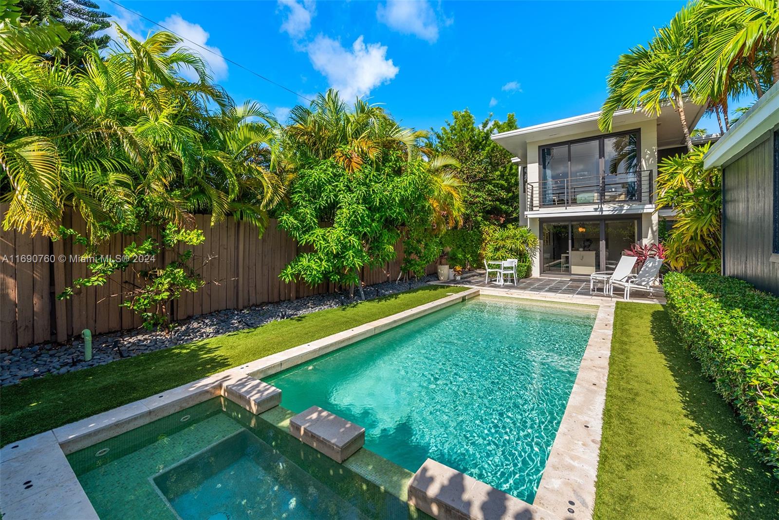 Impeccably crafted, zen-chic home built by a Frank Lloyd Wright protégé and upgraded by Nuhouse Design to amplify the quintessential Miami Beach lifestyle. An expansive entry and open staircase set the stage for the sophisticated interior. Spanning over 2,400 SF of refined living space, the main house encompasses a gourmet kitchen, a modern wood-paneled living room, 3 designer-quality baths and 3 generous bedrooms -including a decadent, spa-like primary ensuite with a spacious walk-in closet. The detached guest house (1 bed/1 bath) adds an additional 600 SF of privacy for guests, nanny or even an income producing tenant. Low-maintenance, landscaped grounds include a large, gated carpark for multiple cars, a sun-drenched pool+spa, and a tropical palm-shaded courtyard for alfresco dining.