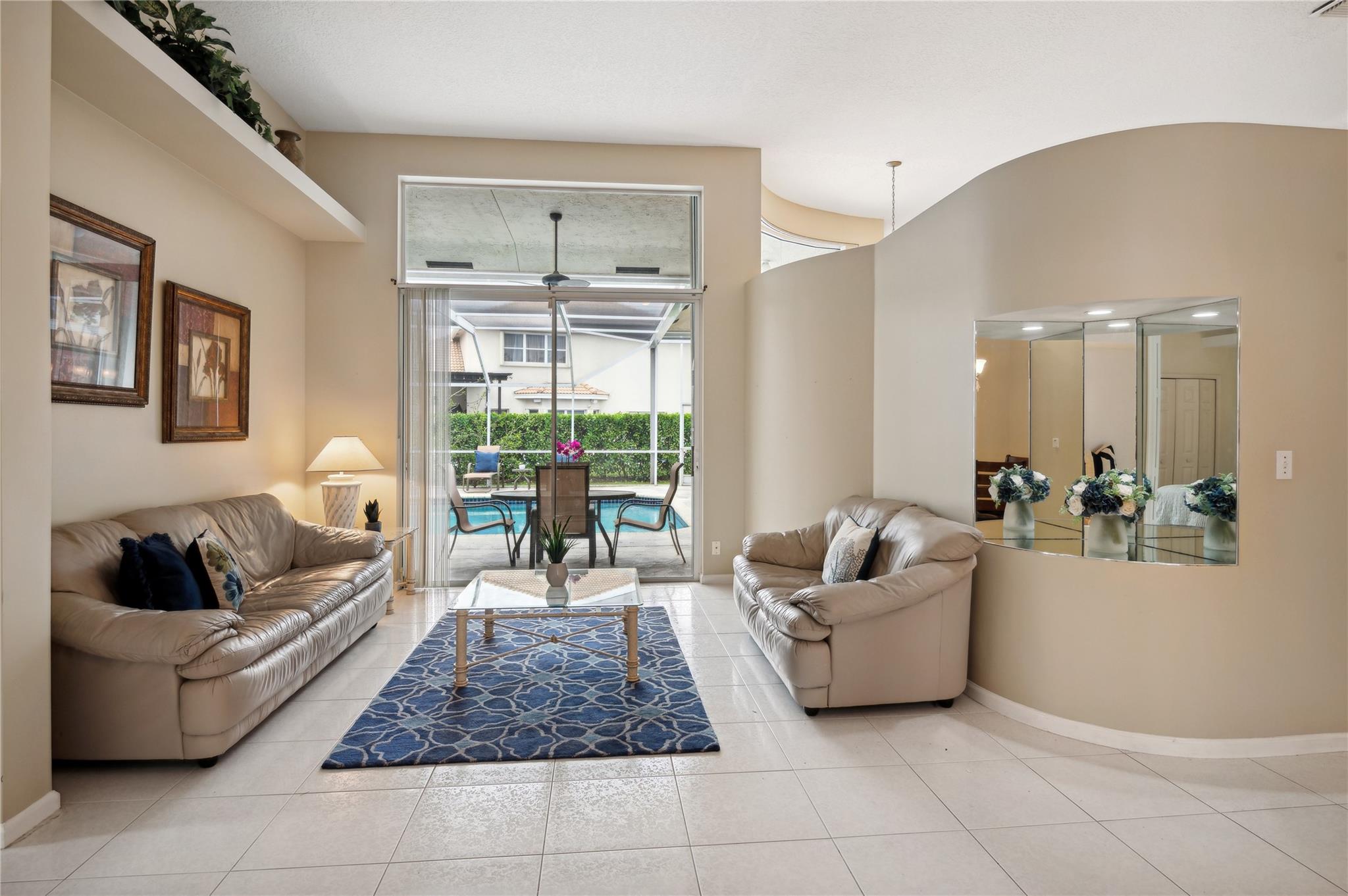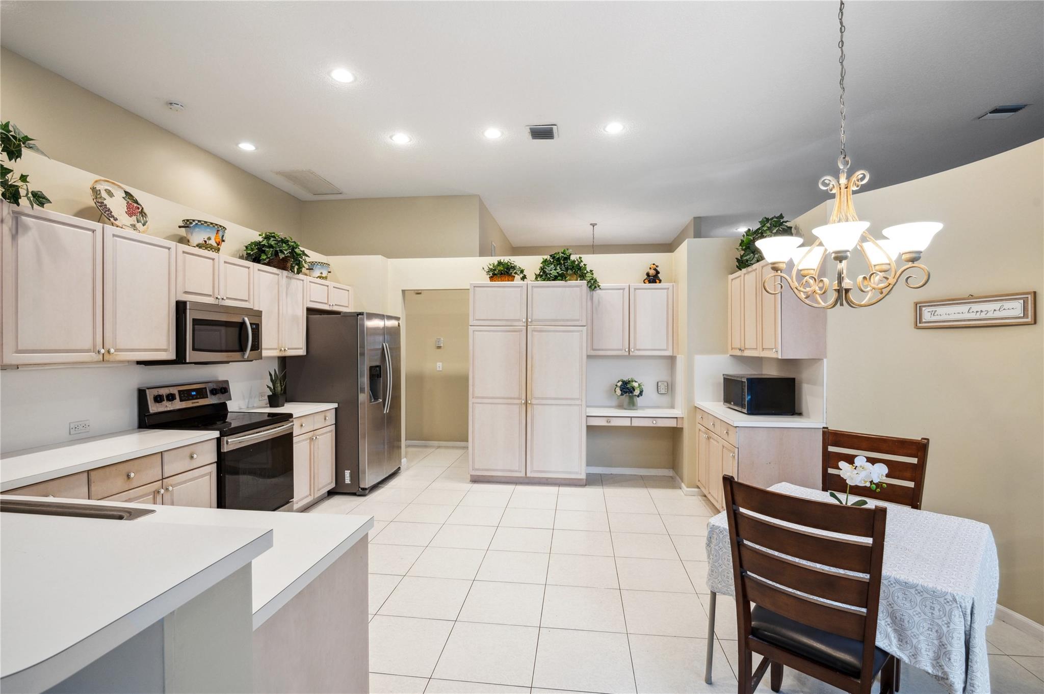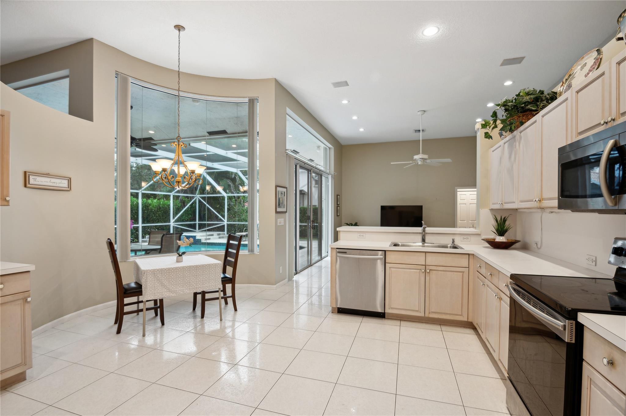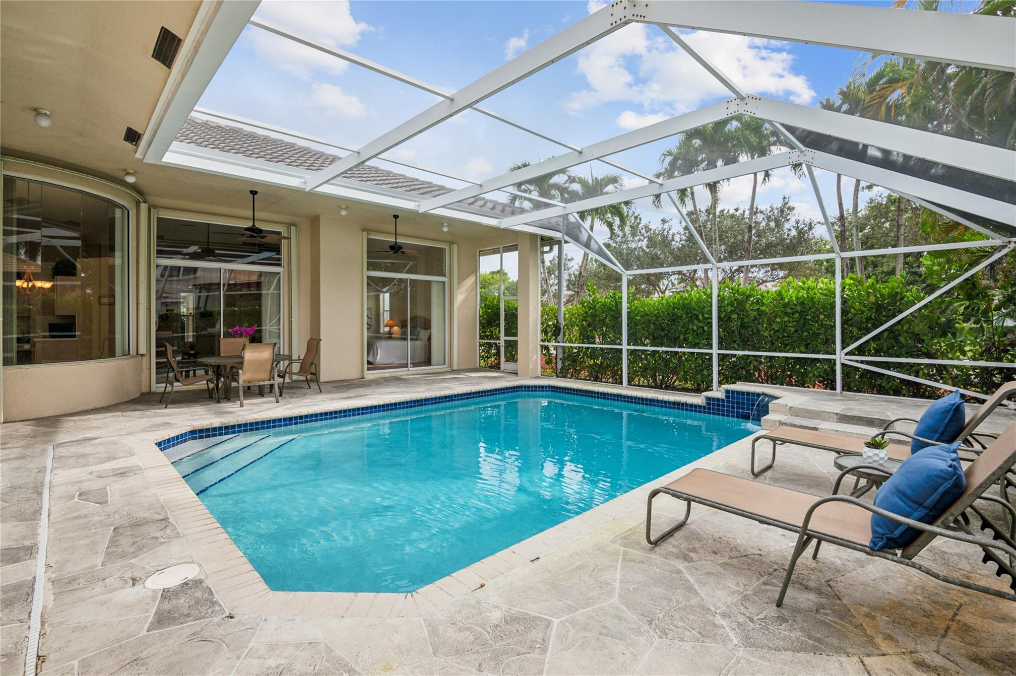 Discover this exquisite 5-bedroom, 3-bath home on a corner lot in the sought-after Kensington Glen neighborhood. With a new roof (Aug 2021), new hot water heater (2021), and accordion hurricane shutters, this home offers peace of mind and style. The triple split floor plan provides privacy, and the large eat-in kitchen open to the expansive family room and patio is perfect for gatherings. Step outside to a beautifully landscaped yard featuring a sparkling heated pool with a waterfall feature, all under a covered and screened patio—ideal for entertaining. The 3-car air-conditioned garage with a new split system (2024) adds convenience and storage. Low HOA fees @ 63 Per month. This is a must-see!