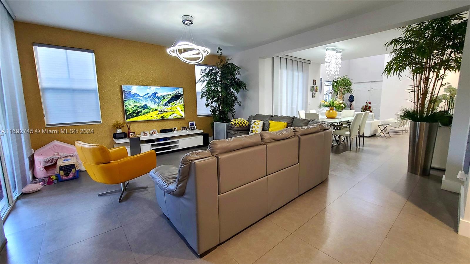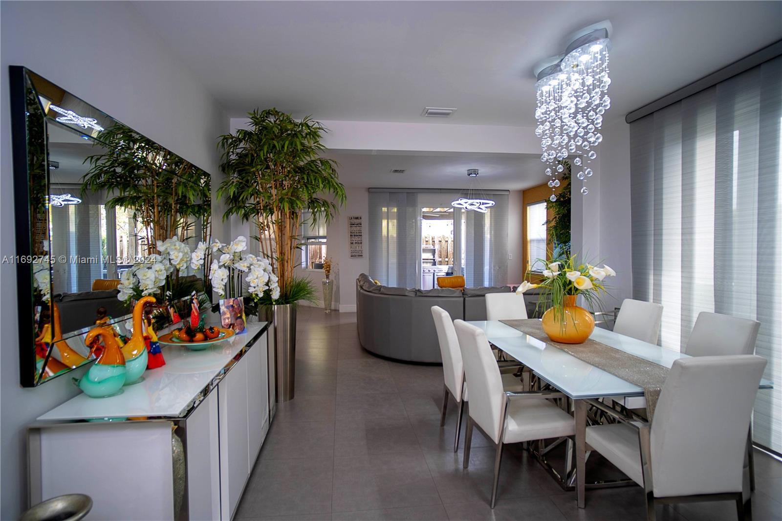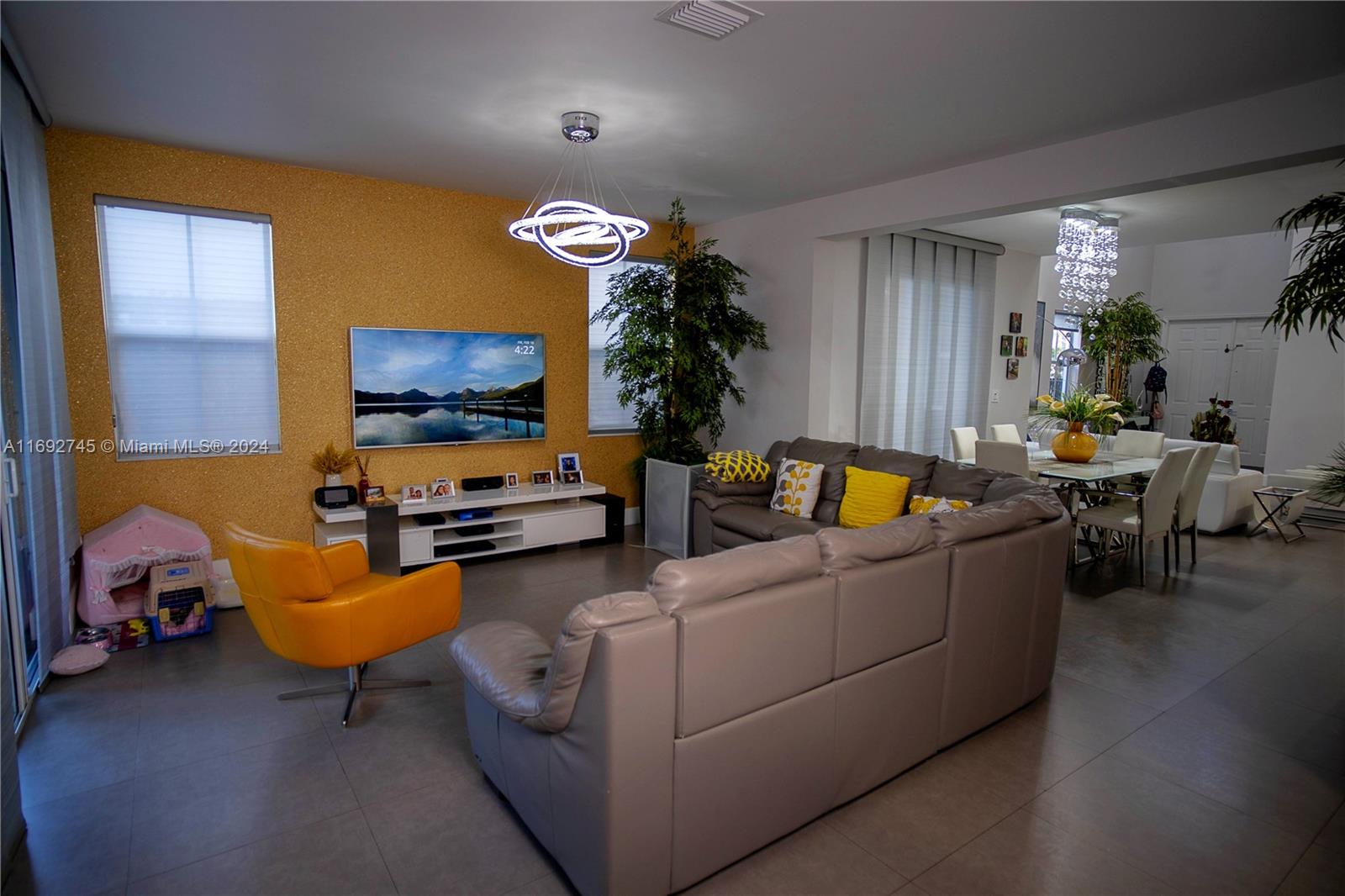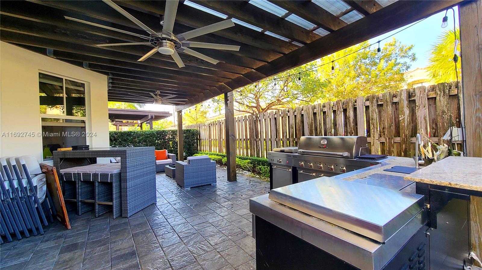 The property description in the image reads: **Dream Home Turnkey** This stunning property features 4 bedrooms and 4 bathrooms, all meticulously updated for modern living. Enjoy the elegance of Spanish porcelain flooring on the first floor and stylish glass staircase railings. The home boasts 8-foot high Italian doors and a beautifully redesigned kitchen. The second floor is enhanced with luxury waterproof vinyl throughout. Step outside to your private patio, complete with a pergola and barbecue area with built-in speakers—perfect for entertaining. Residents also have access to a Clubhouse that includes a gym, pool, and BBQ area, all within a secure, gated community. Please note that furniture is sold separately. For showings, kindly give 24 hours' notice.