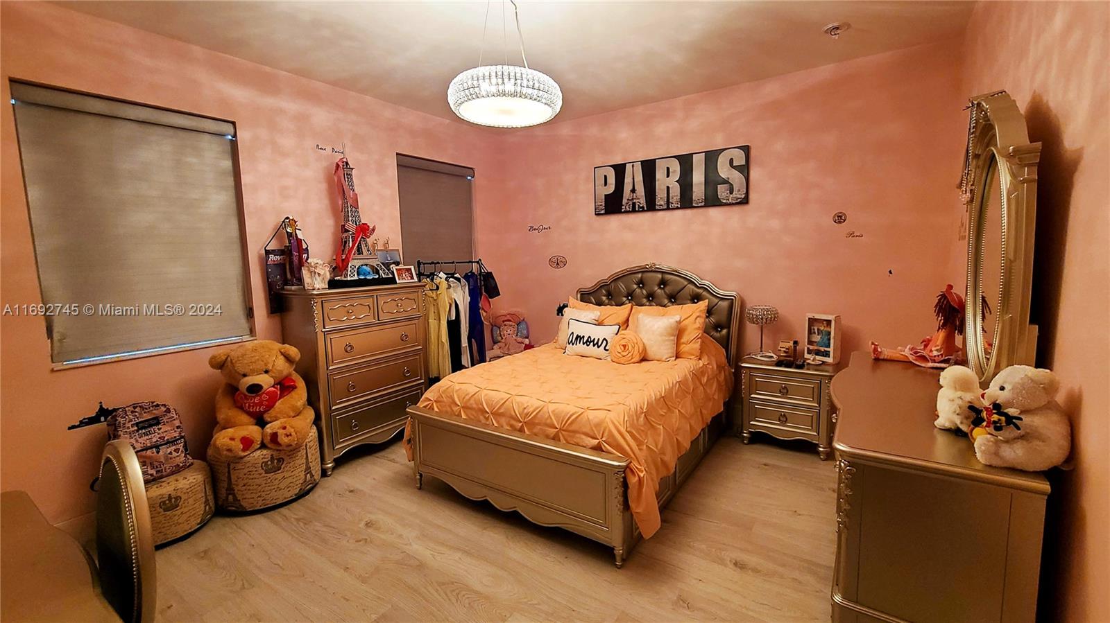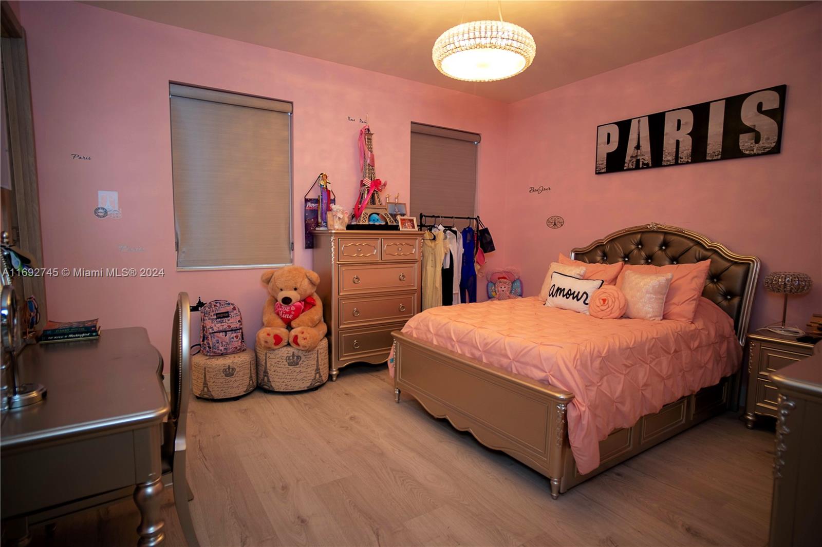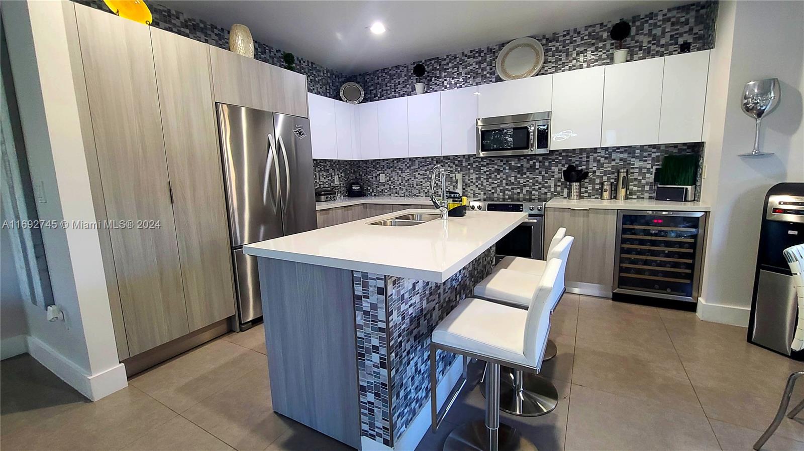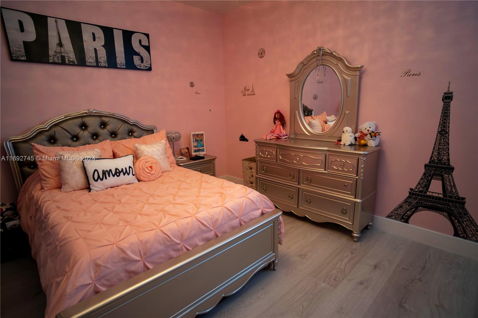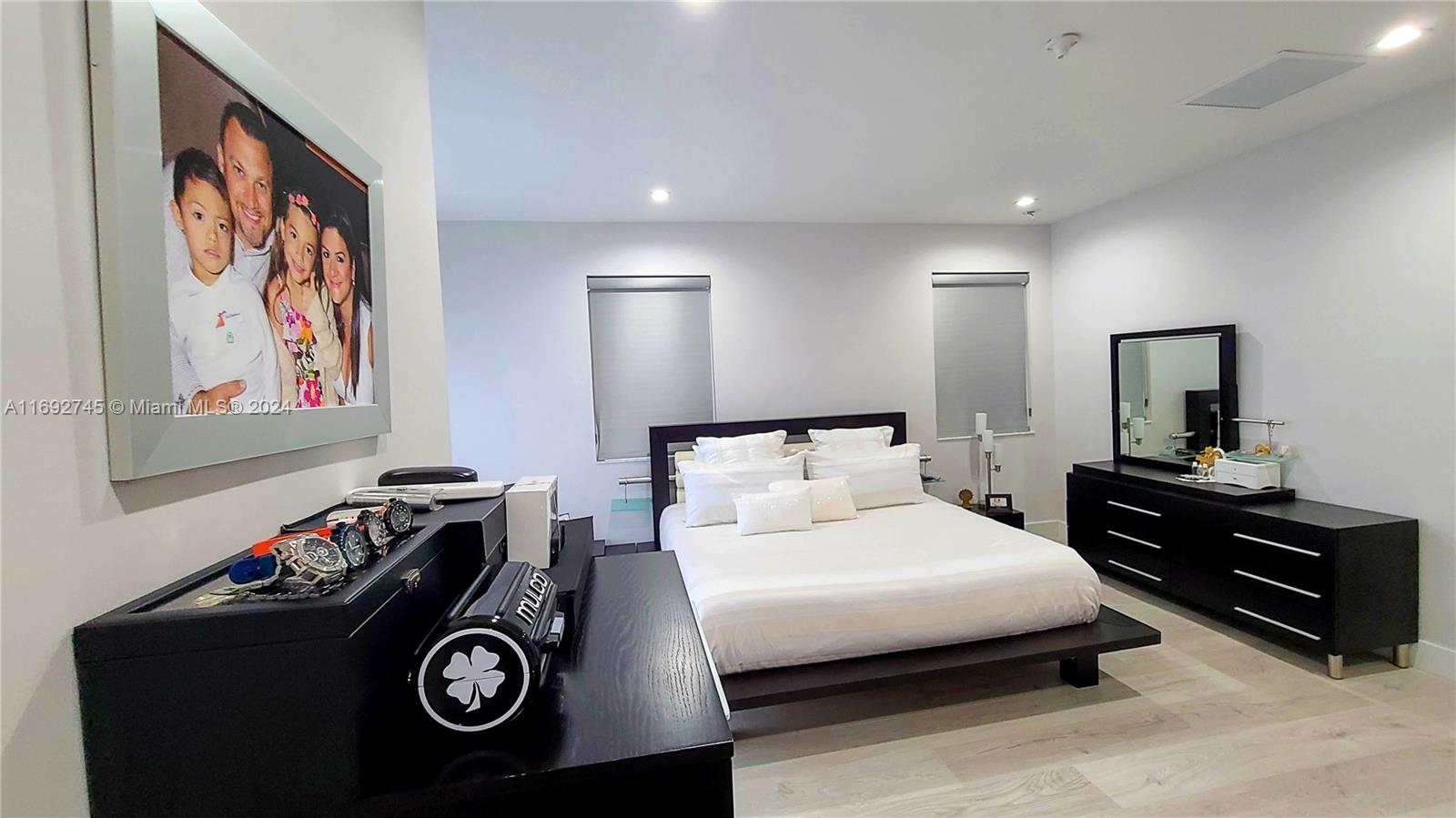 The property description in the image reads: **Dream Home Turnkey** This stunning property features 4 bedrooms and 4 bathrooms, all meticulously updated for modern living. Enjoy the elegance of Spanish porcelain flooring on the first floor and stylish glass staircase railings. The home boasts 8-foot high Italian doors and a beautifully redesigned kitchen. The second floor is enhanced with luxury waterproof vinyl throughout. Step outside to your private patio, complete with a pergola and barbecue area with built-in speakers—perfect for entertaining. Residents also have access to a Clubhouse that includes a gym, pool, and BBQ area, all within a secure, gated community. Please note that furniture is sold separately. For showings, kindly give 24 hours' notice.