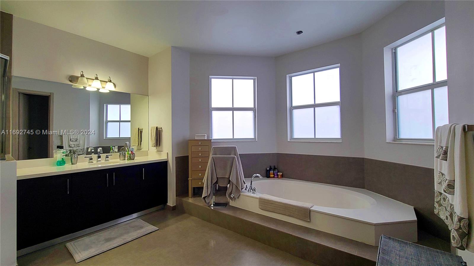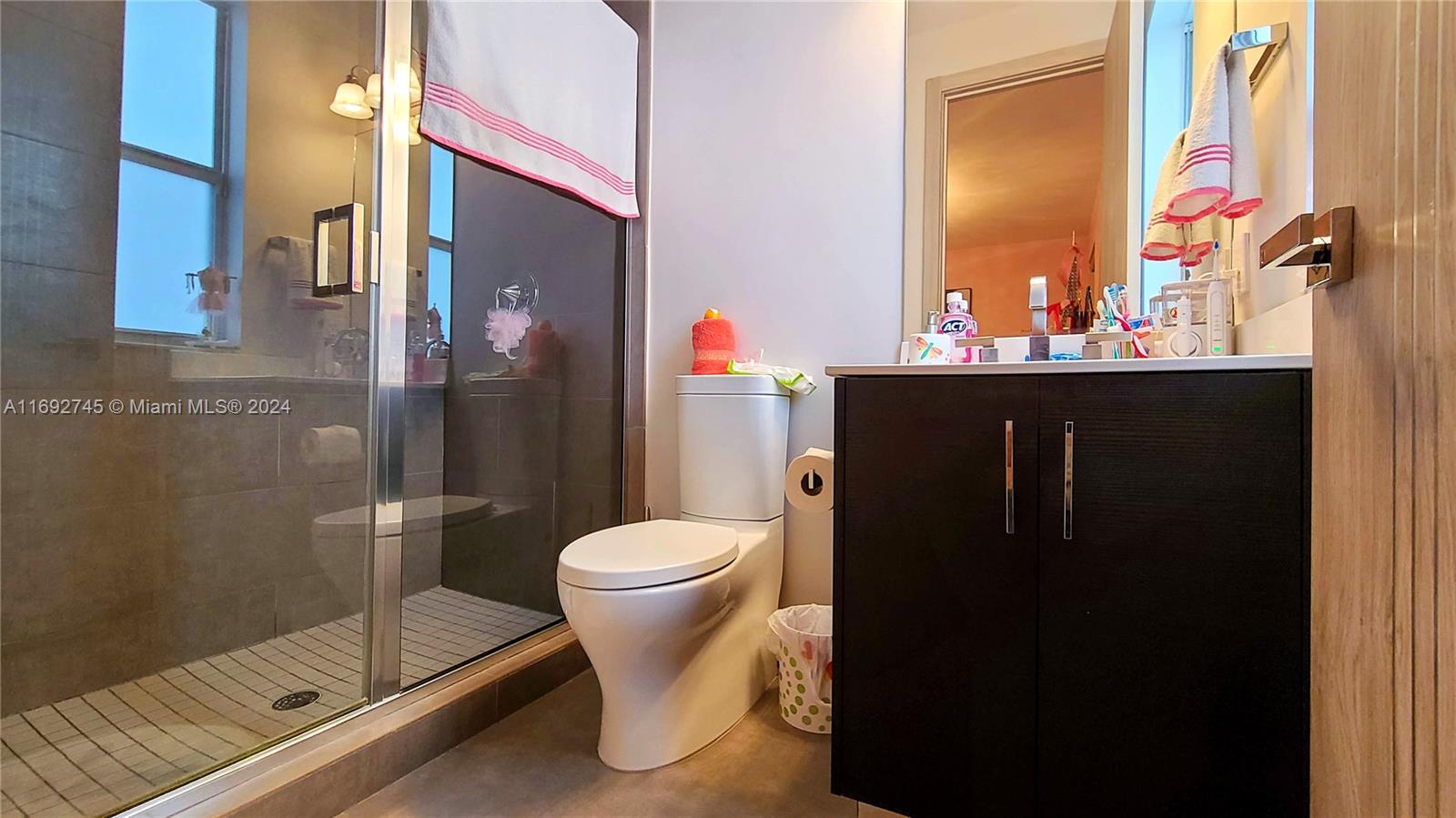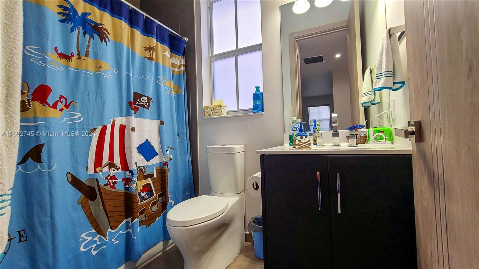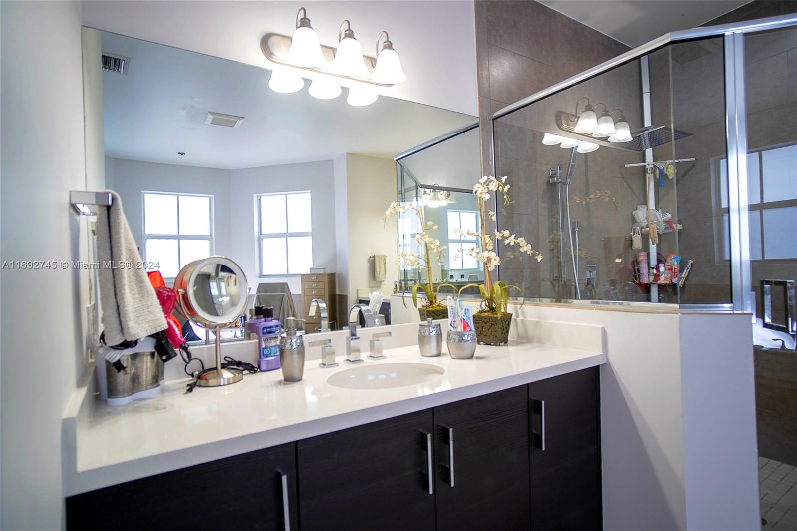 The property description in the image reads: **Dream Home Turnkey** This stunning property features 4 bedrooms and 4 bathrooms, all meticulously updated for modern living. Enjoy the elegance of Spanish porcelain flooring on the first floor and stylish glass staircase railings. The home boasts 8-foot high Italian doors and a beautifully redesigned kitchen. The second floor is enhanced with luxury waterproof vinyl throughout. Step outside to your private patio, complete with a pergola and barbecue area with built-in speakers—perfect for entertaining. Residents also have access to a Clubhouse that includes a gym, pool, and BBQ area, all within a secure, gated community. Please note that furniture is sold separately. For showings, kindly give 24 hours' notice.