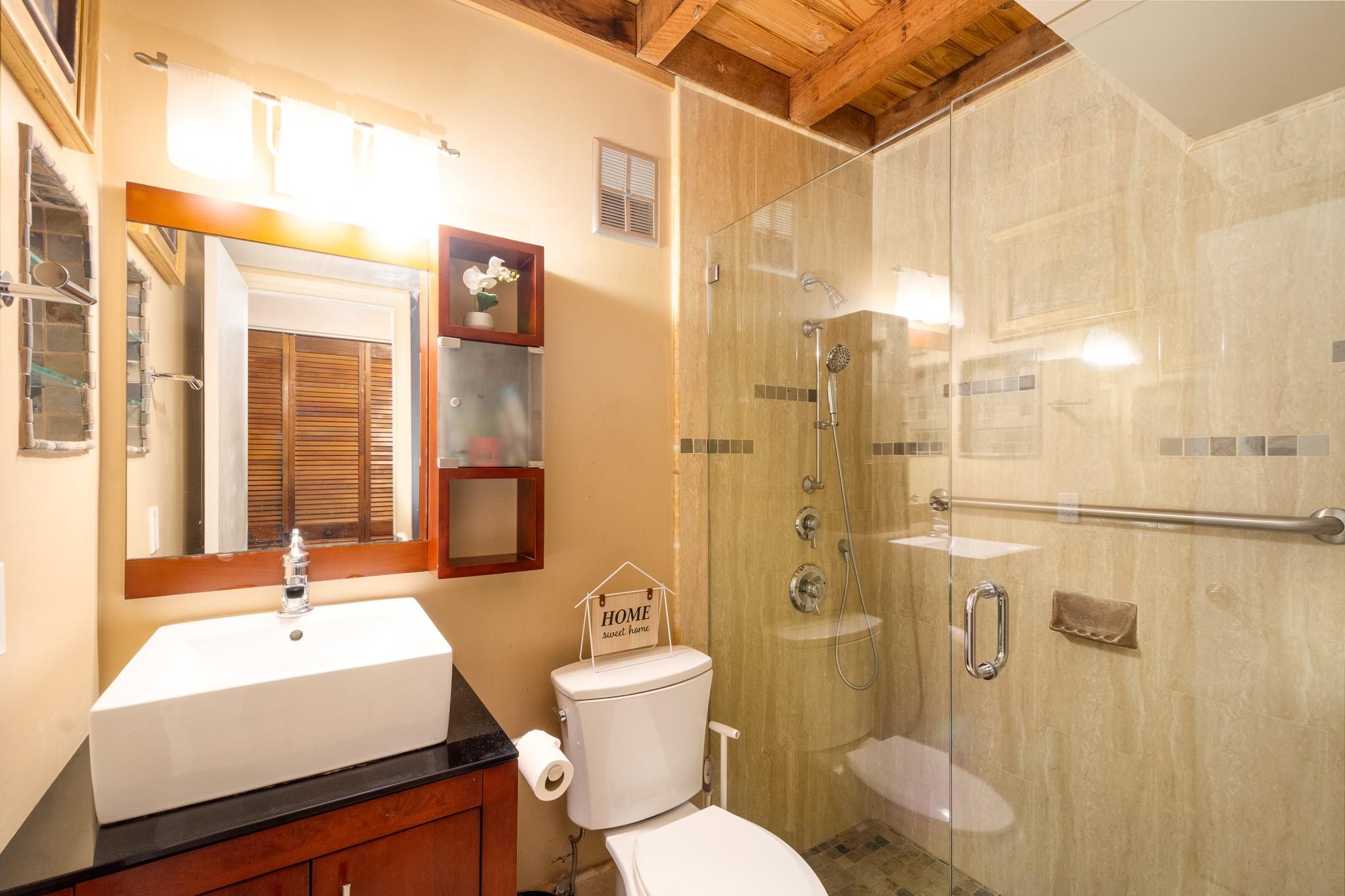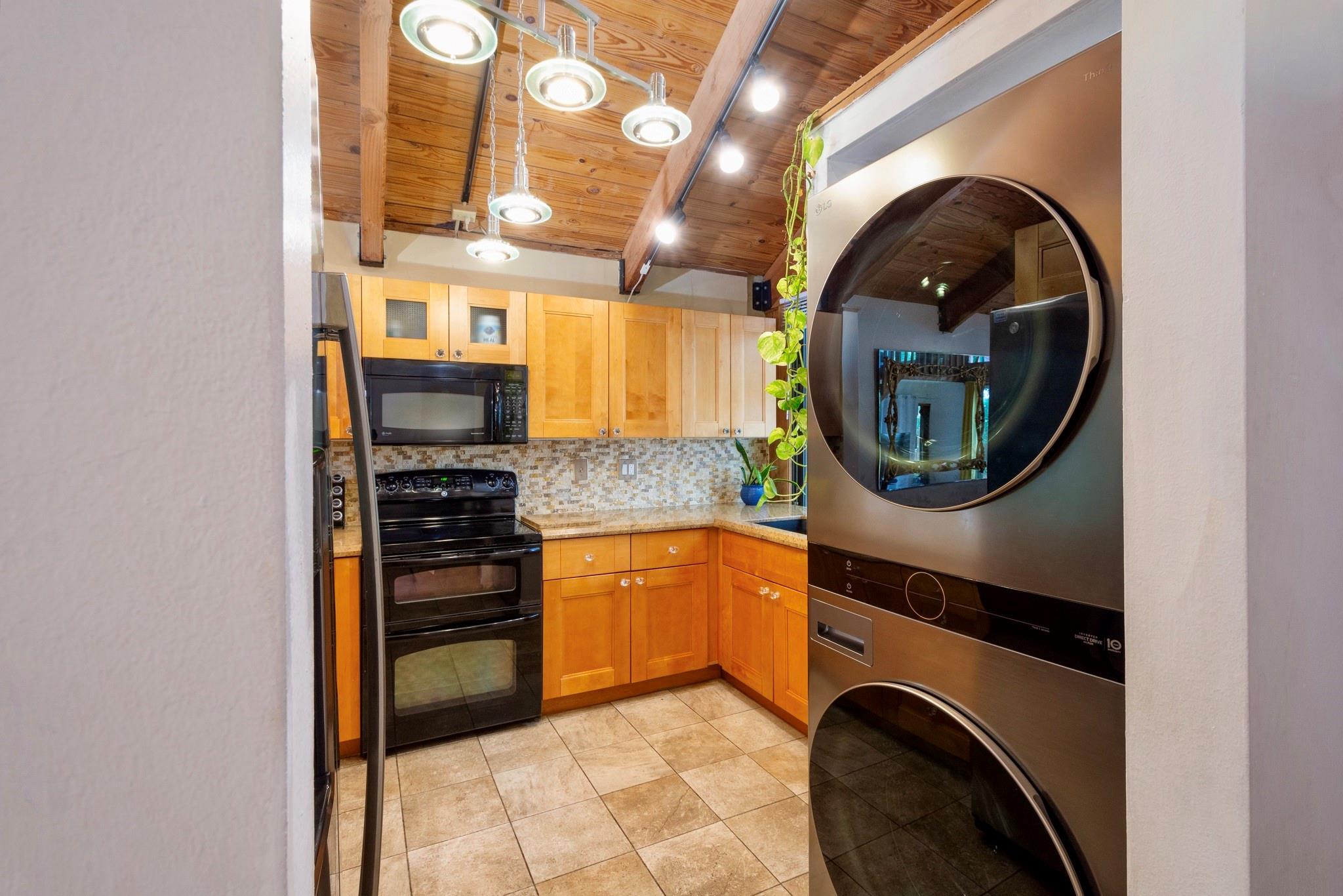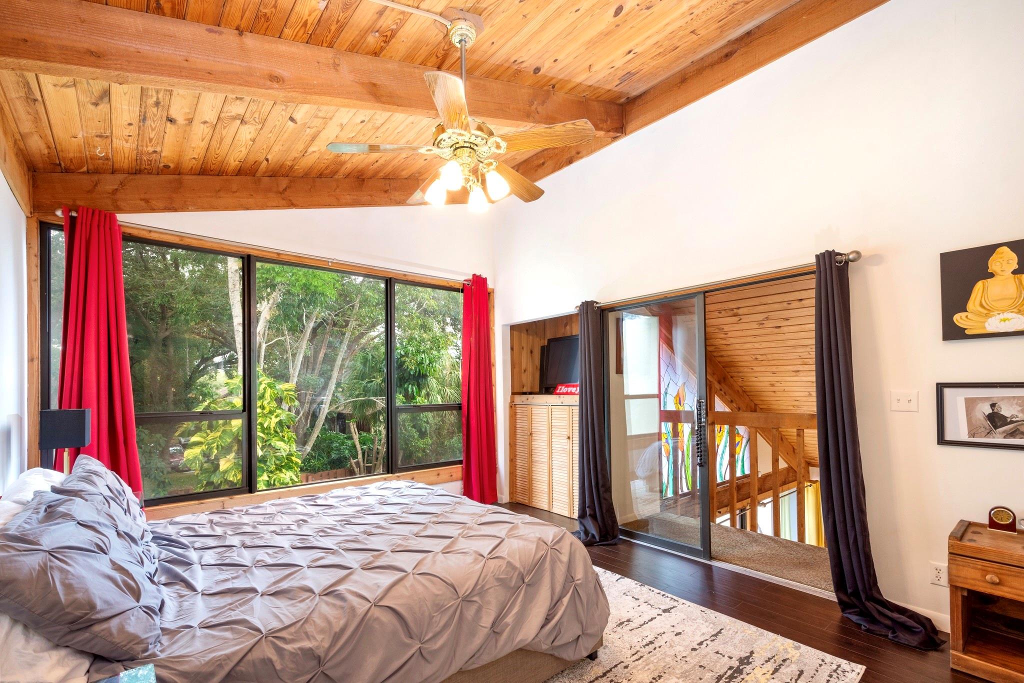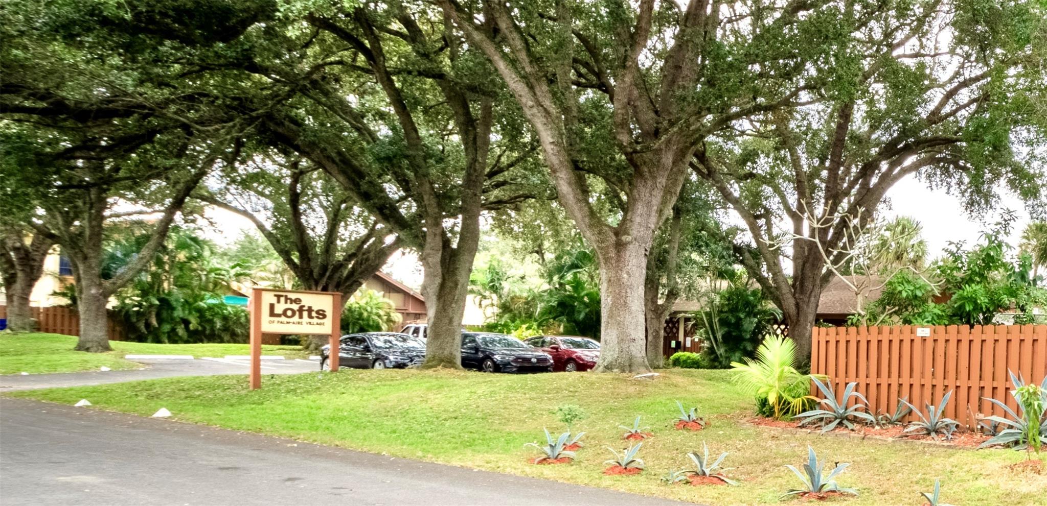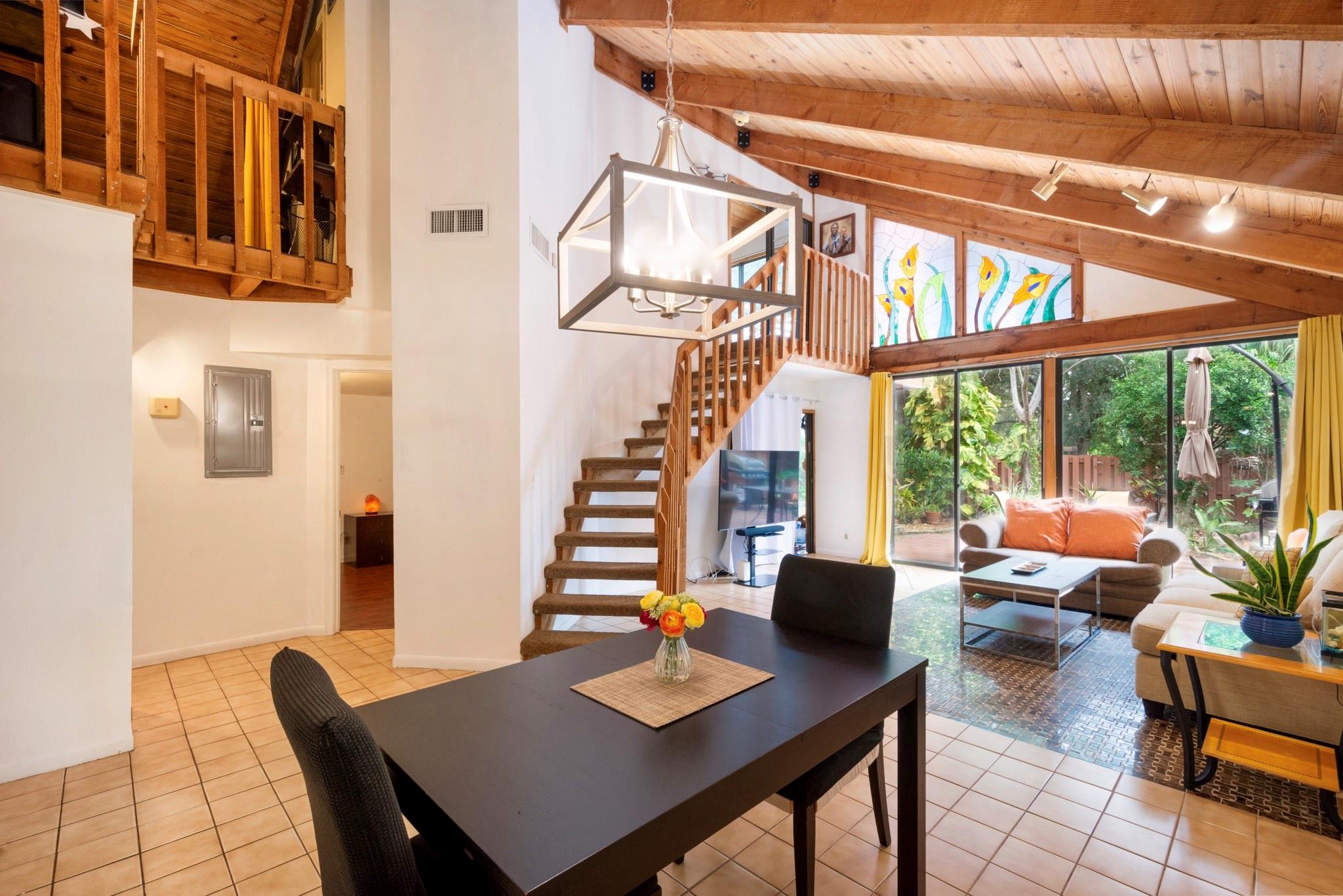 Discover this highly sought-after, two-story home in the desirable Lofts of Palm-Aire Village. Situated on a corner, this 3 bedroom 2 bathroom loft home offers vaulted ceilings with exposed beams and a tongue & groove ceiling, a spacious master suite with walk-in closet and en-suite bath, and a flexible loft space perfect for an artist's studio or office. The updated kitchen features granite countertops, and hi-end cabinets and appliances including a new washer/dryer. New impact windows/shutters throughout, newer A/C, electrical, & sprinkler system. Property has a private fenced yard with fruit trees, a patio & shed, and two designated parking spaces. Community amenities include a heated pool, tennis and handball courts, picnic areas, and dog parks and HOA fee is a low $100/mo!
